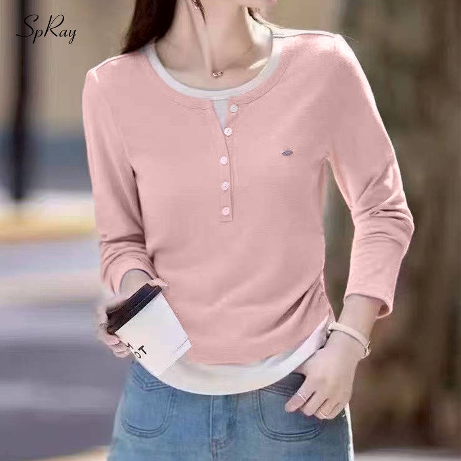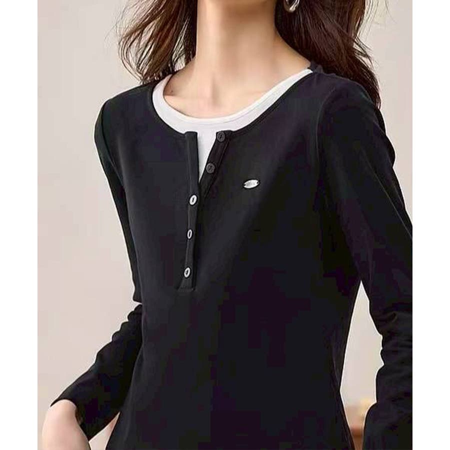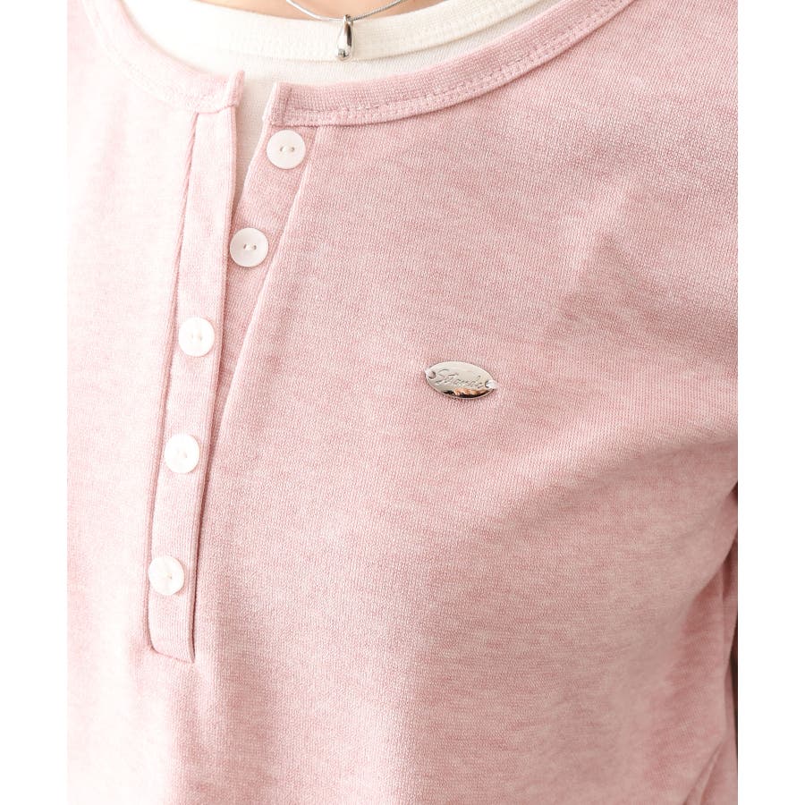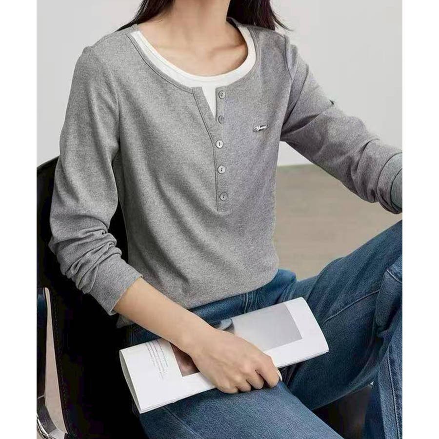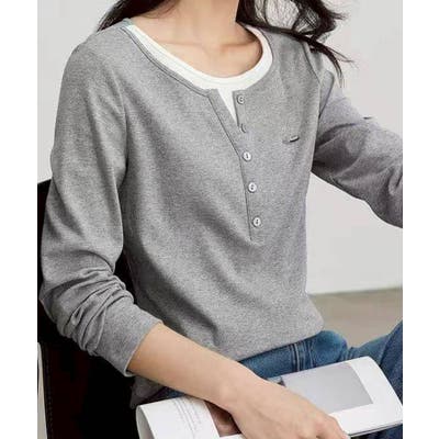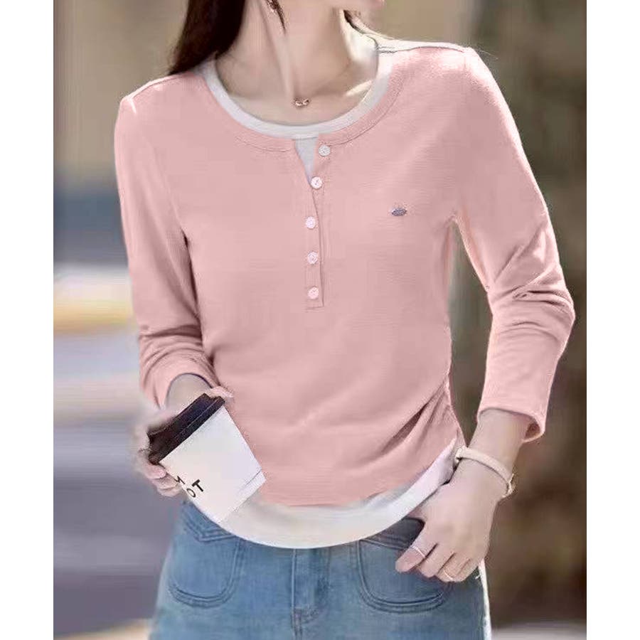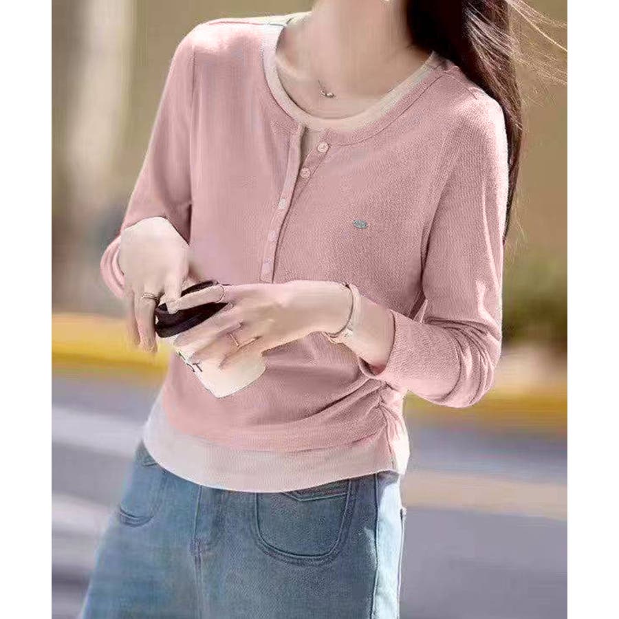 配色デザインが目を惹く、ヘンリーネックのフェイクレイヤードトップス。