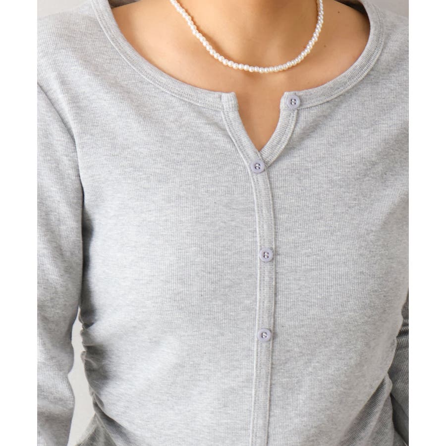 顔周りをスッキリと見せてくれるキーネックライン。デコルテを綺麗に見せつつ、程よくフィットするリブ素材がボディラインを美しく引き立てます。
