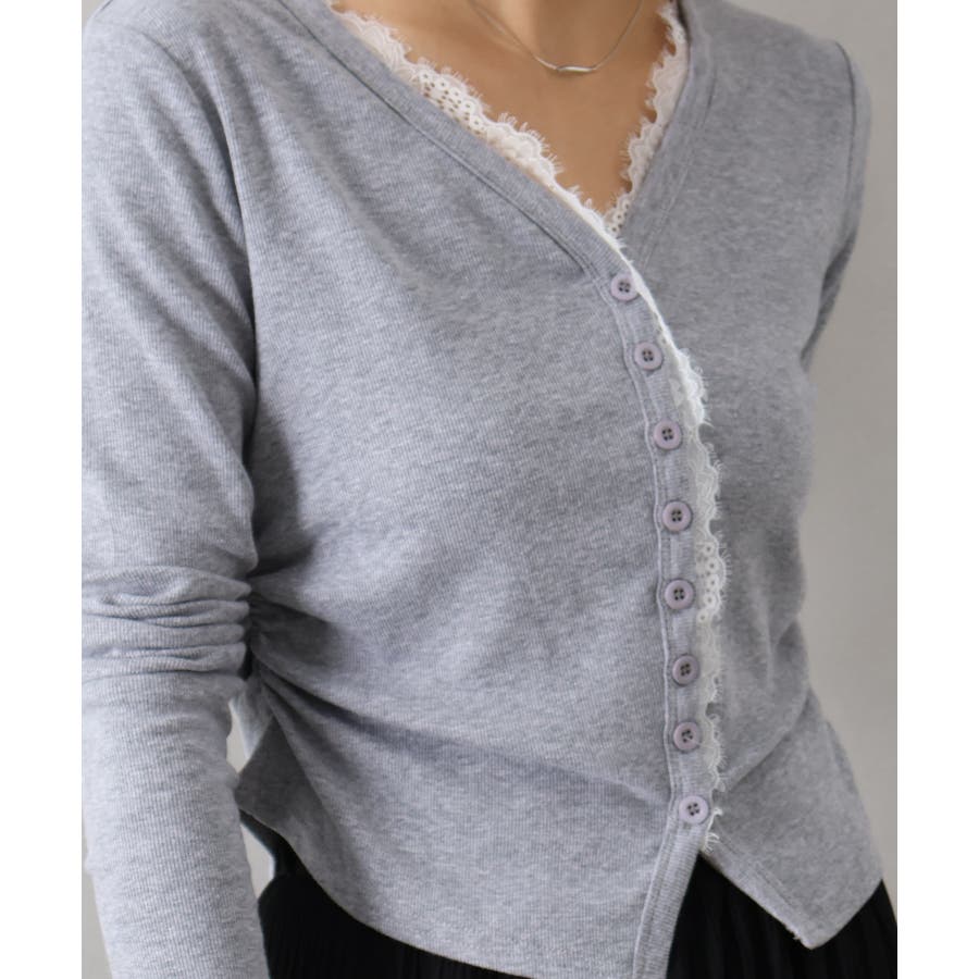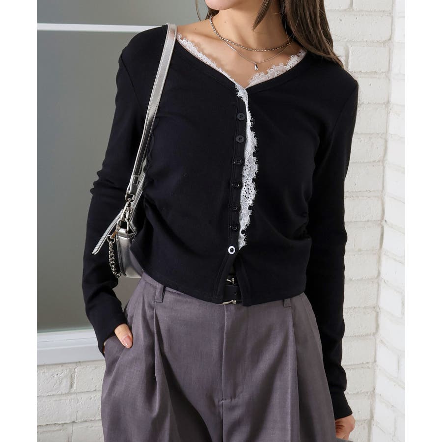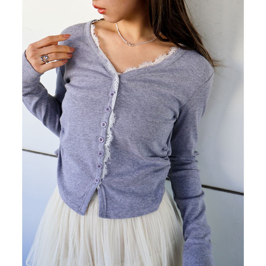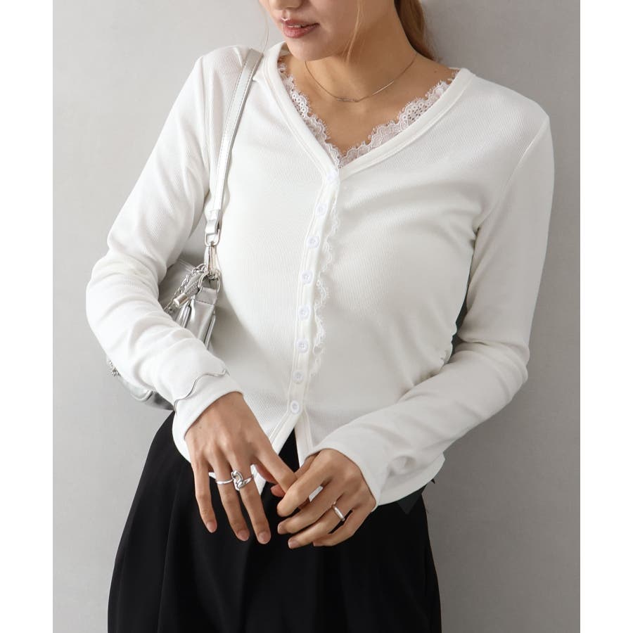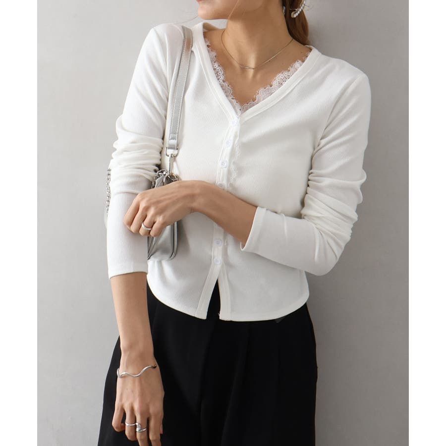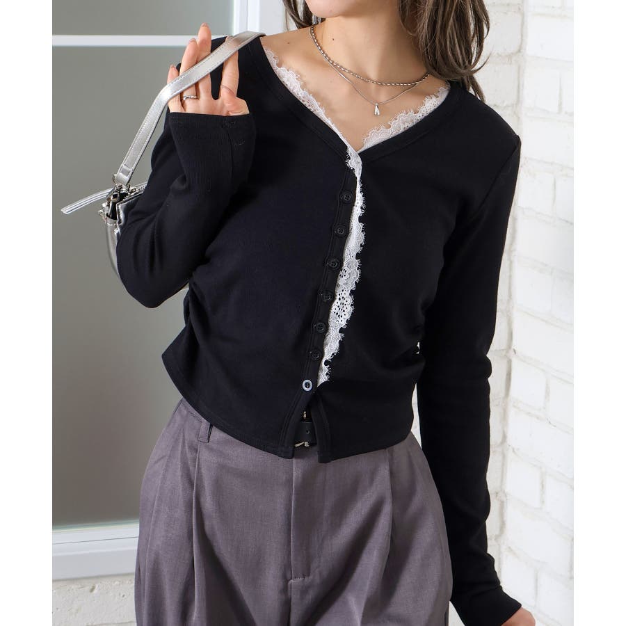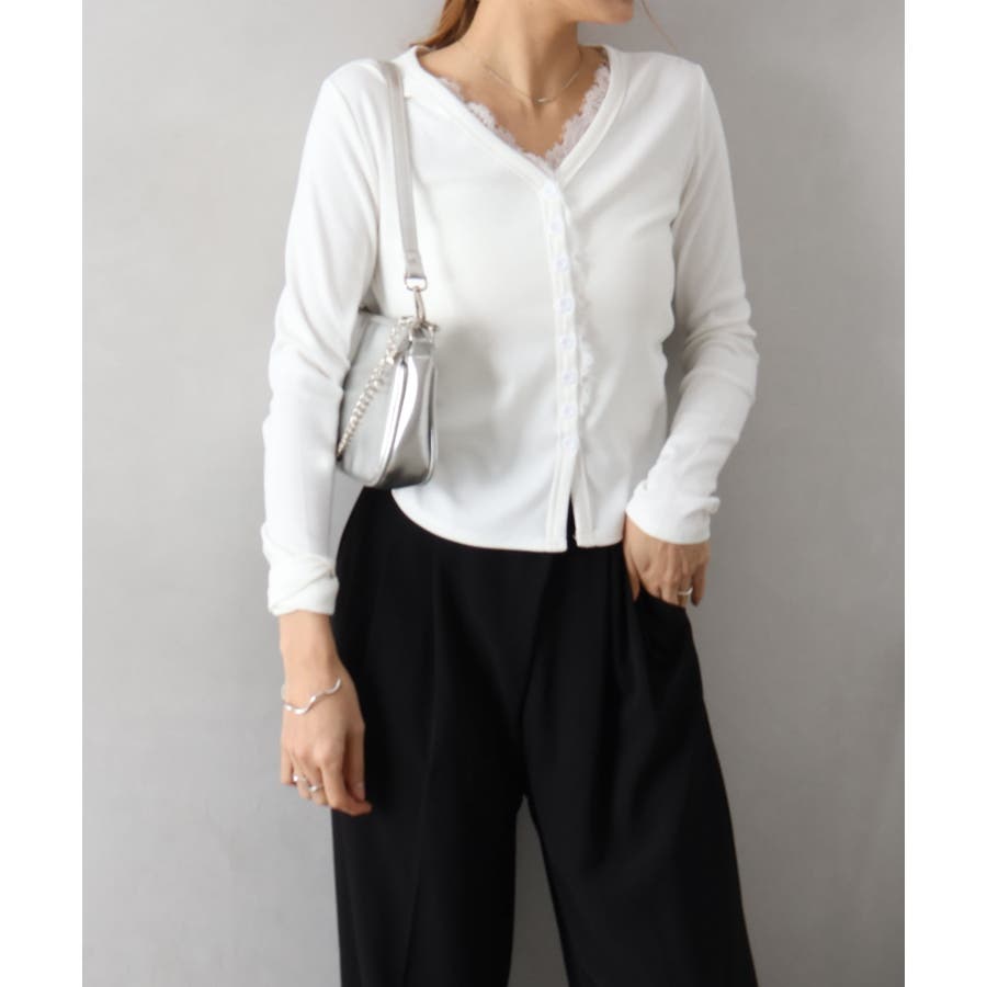 前立てとネックラインに繊細なレースをあしらった、フェイクカーディガン。