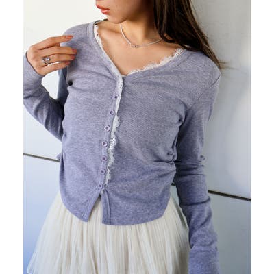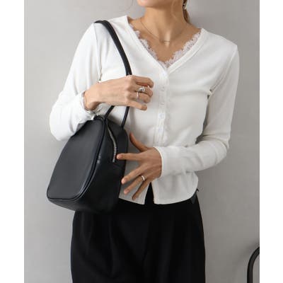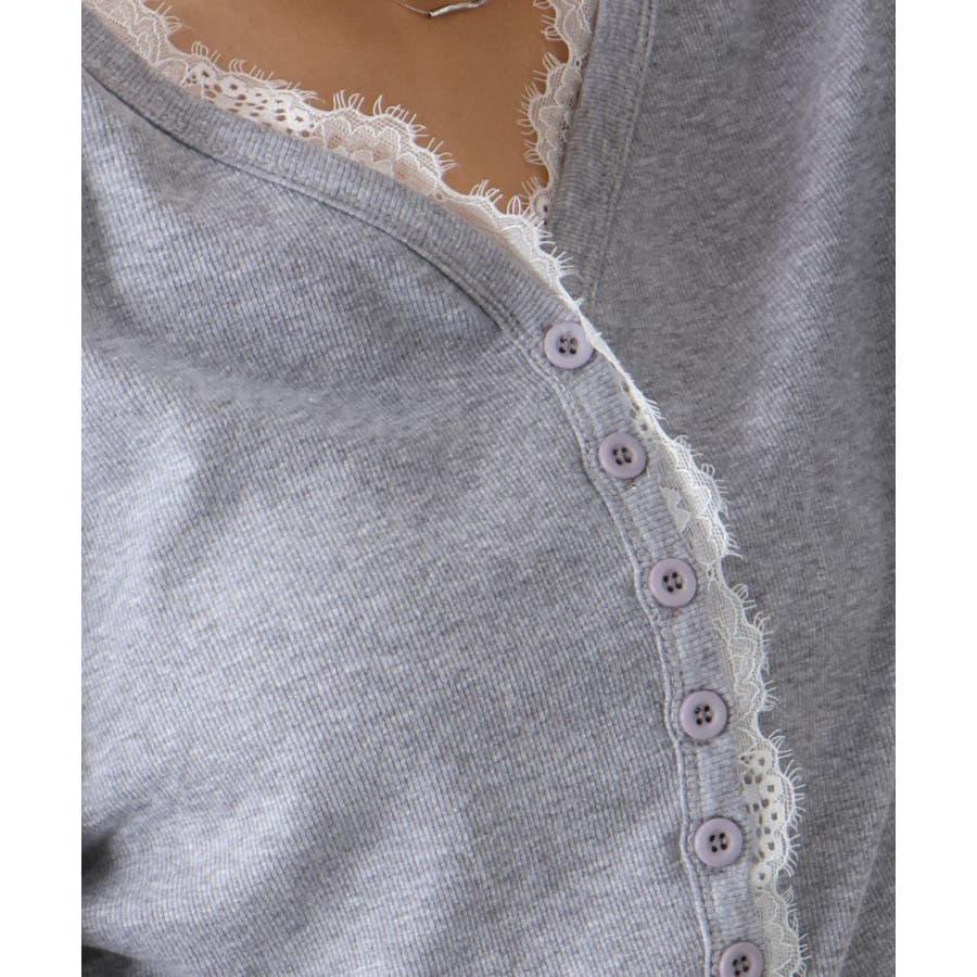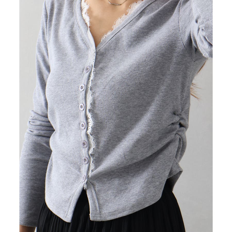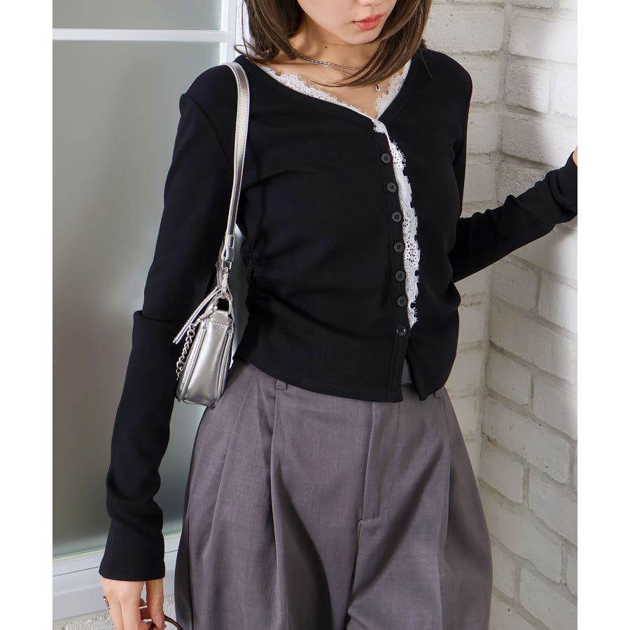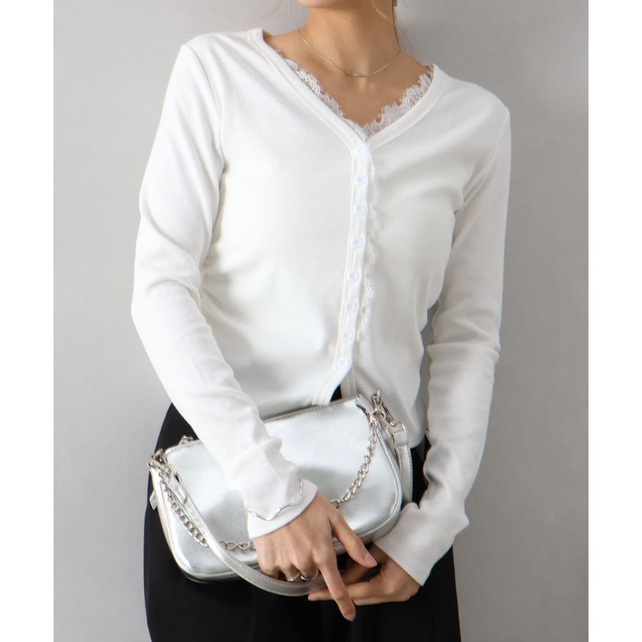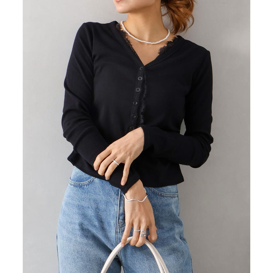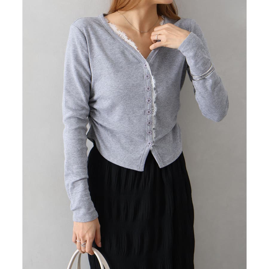 前立てとネックラインに繊細なレースをあしらった、フェイクカーディガン。