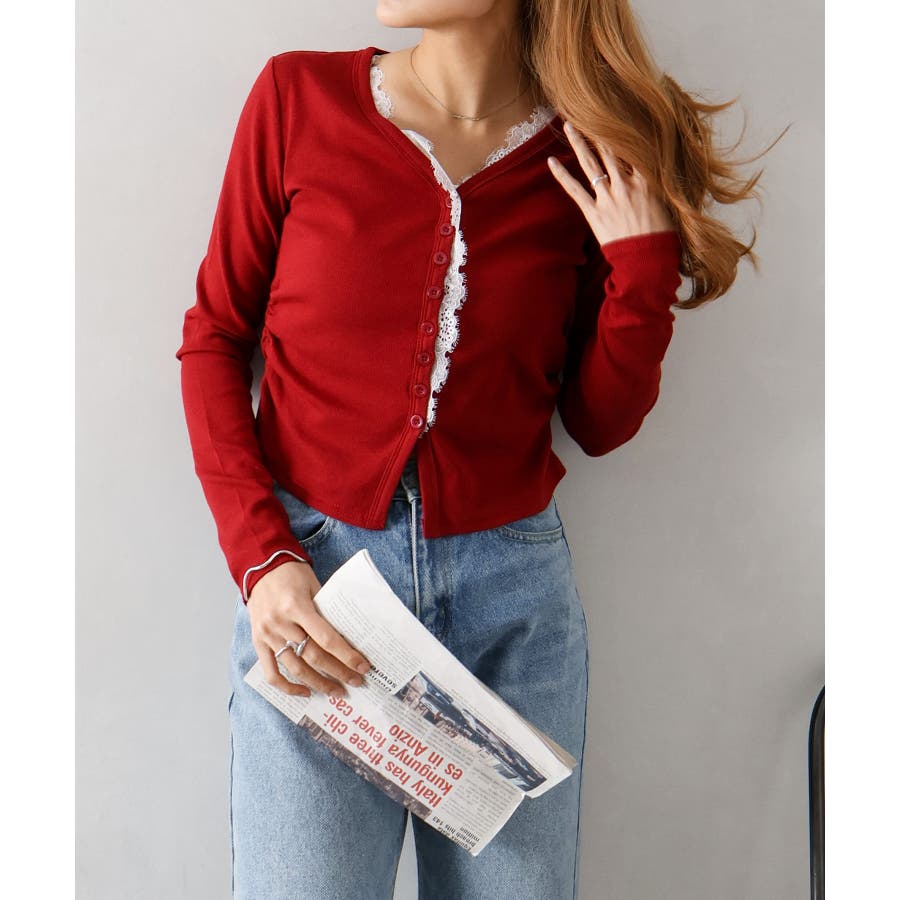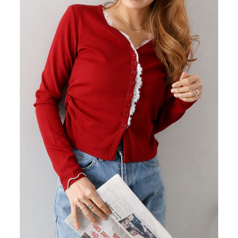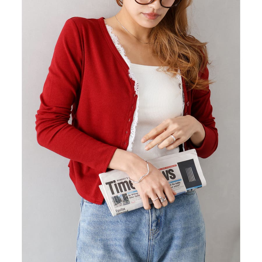 程よくフィットするリブ素材が女性らしいラインを演出し、ボタンを留めても開けてもバランス良く着こなせます。