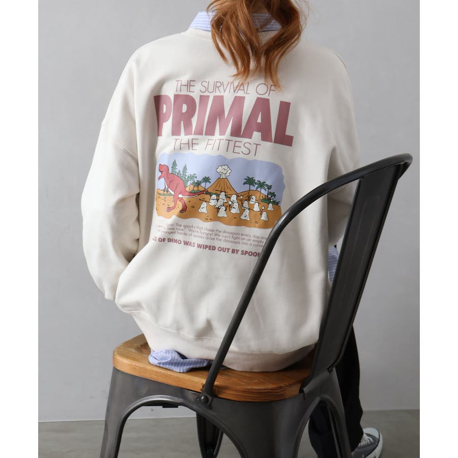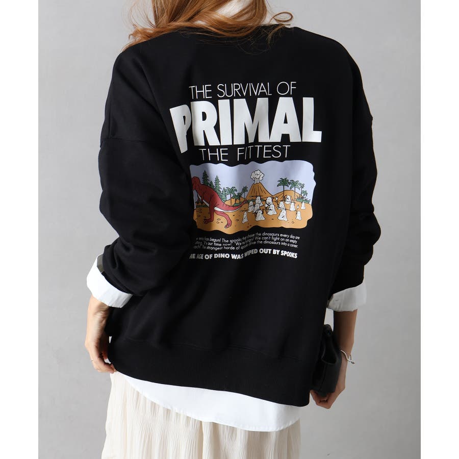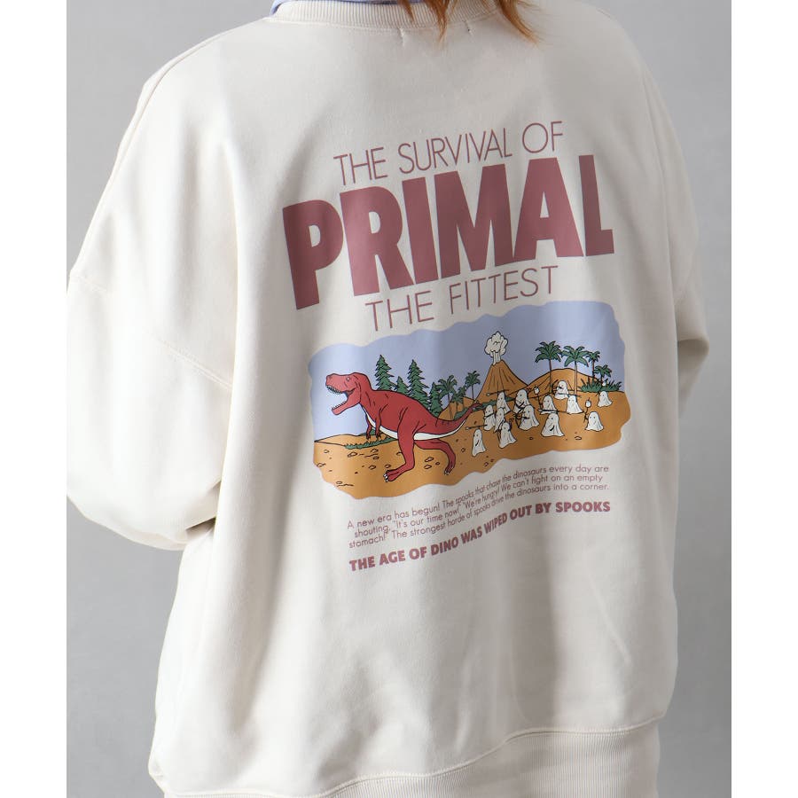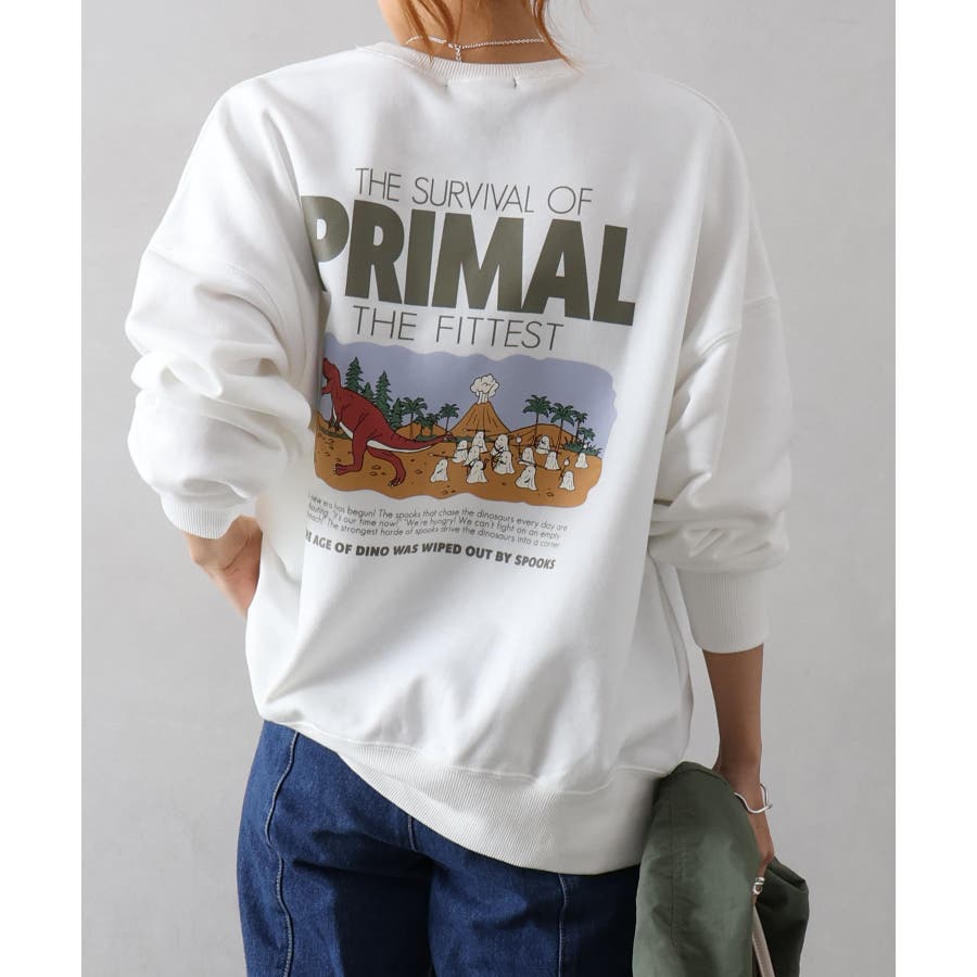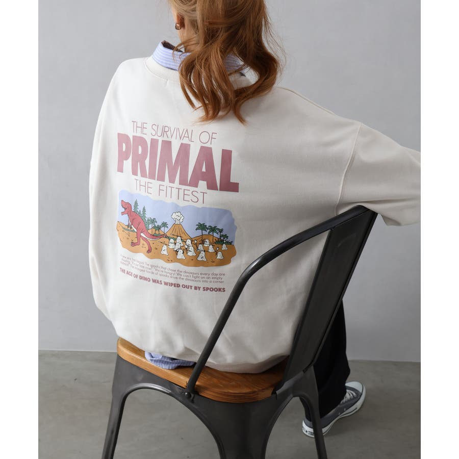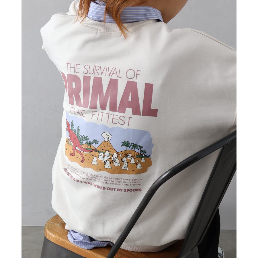 背中に恐竜×おばけのユーモアあふれるグラフィックを大胆にプリントしたスウェット。
