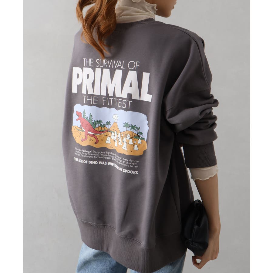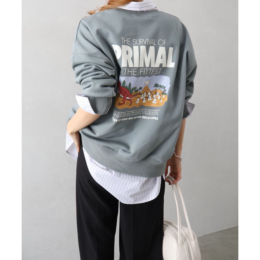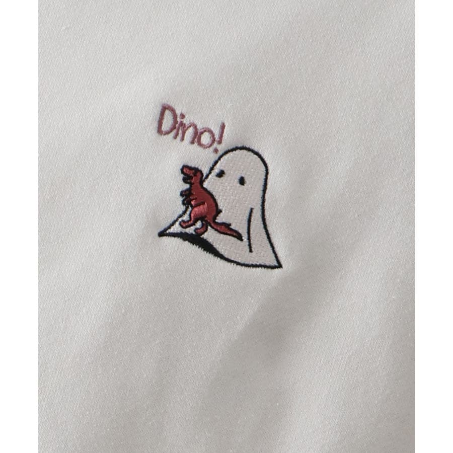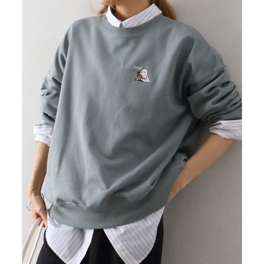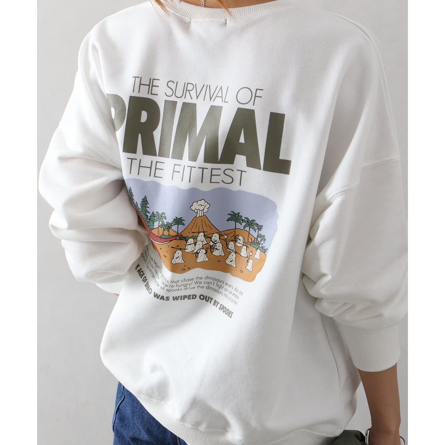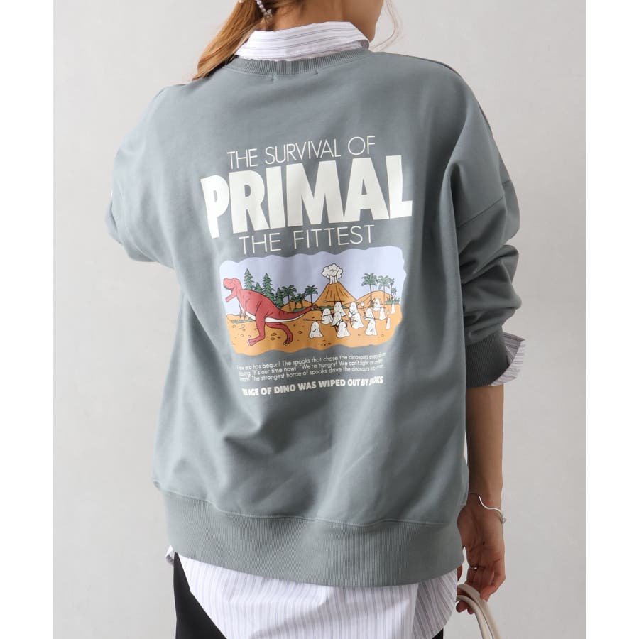背中に恐竜×おばけのユーモアあふれるグラフィックを大胆にプリントしたスウェット。
