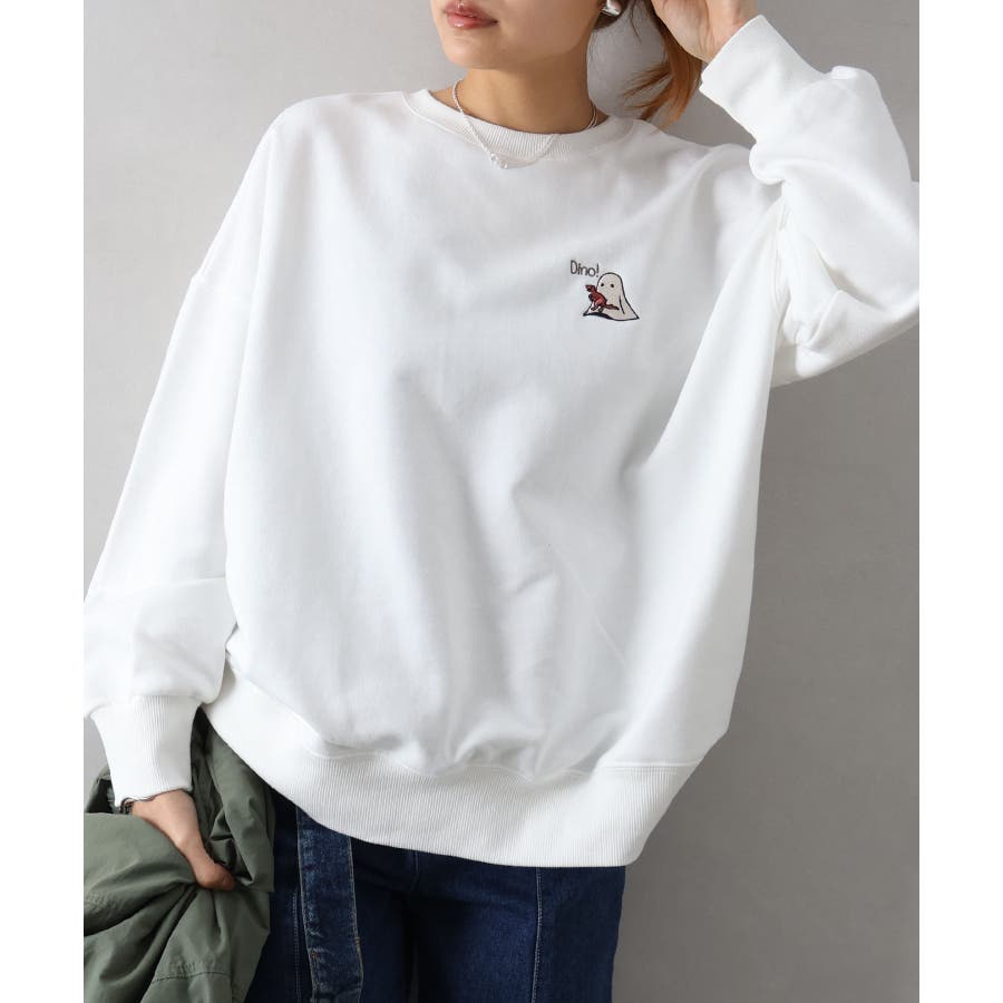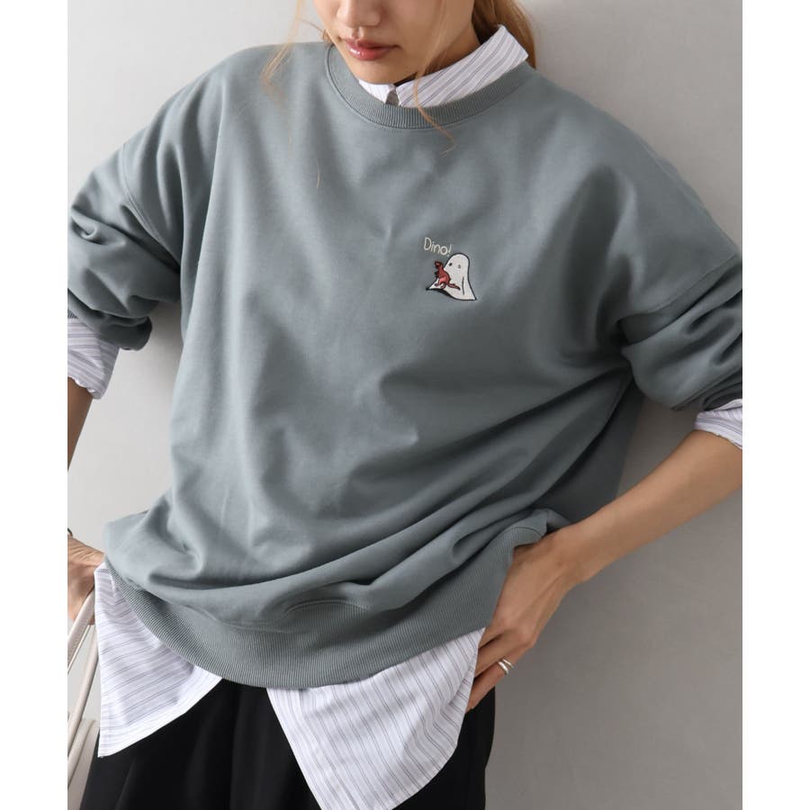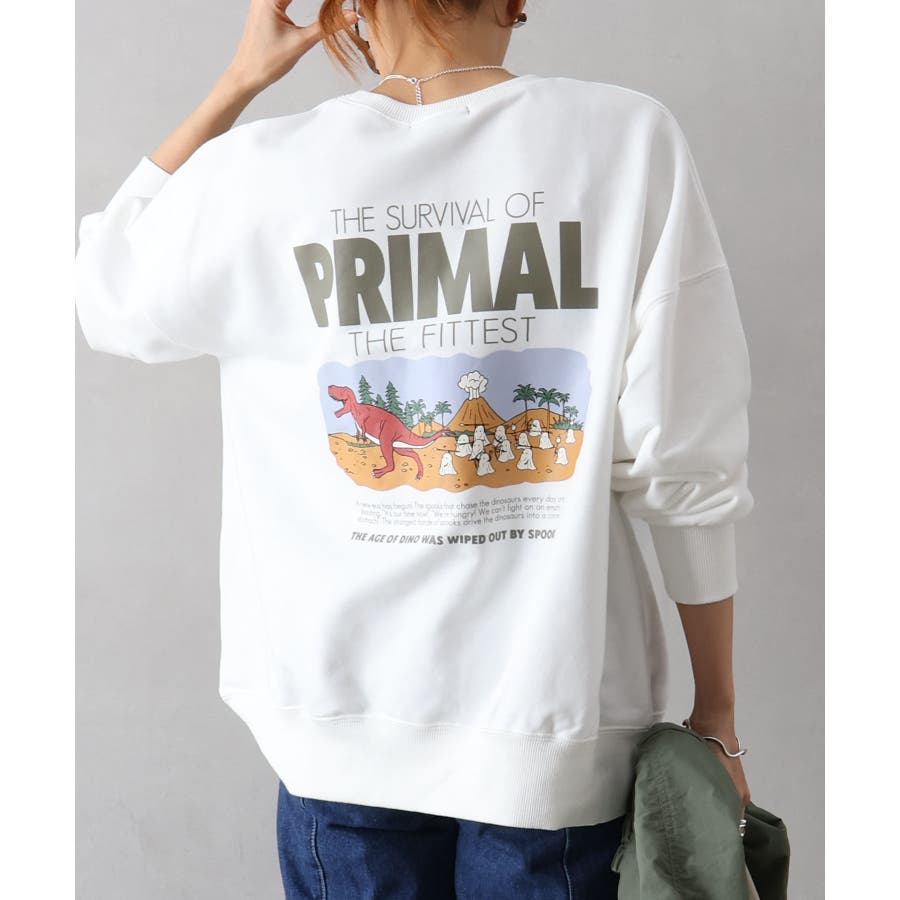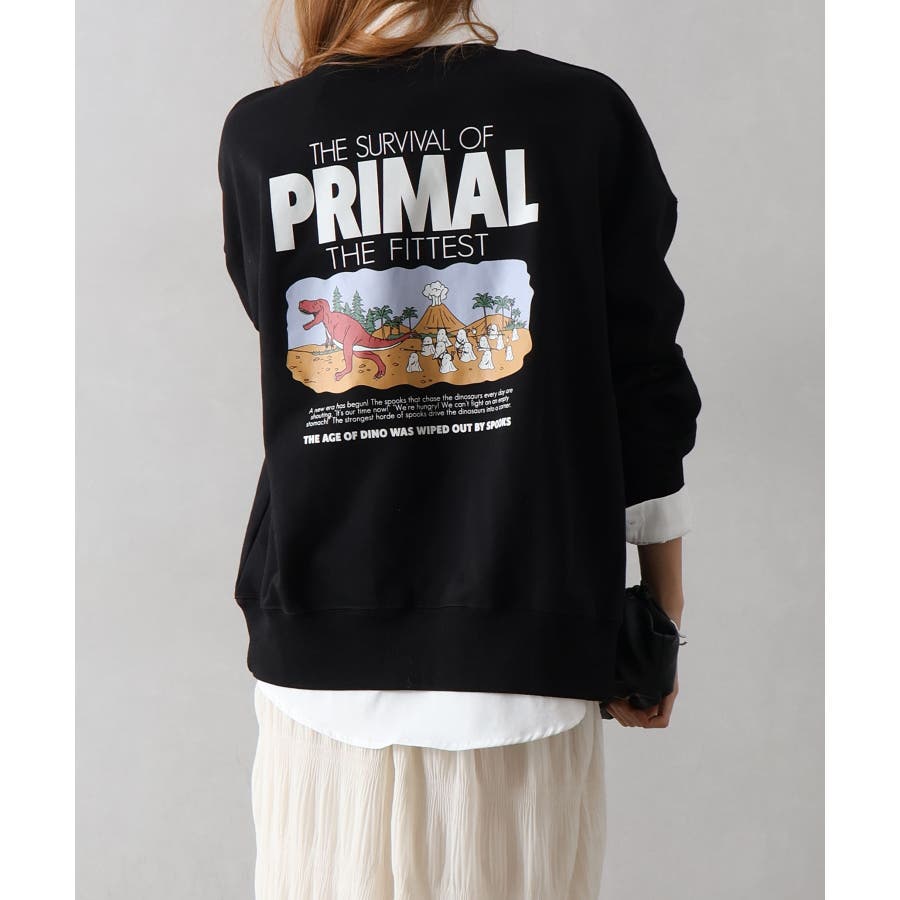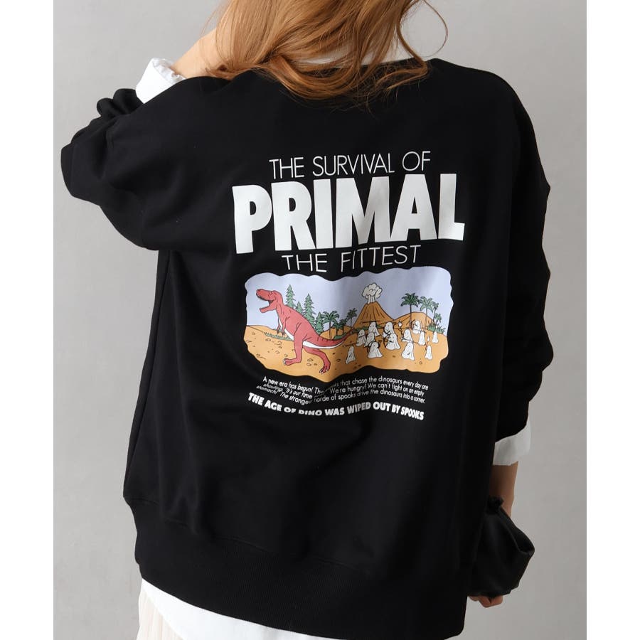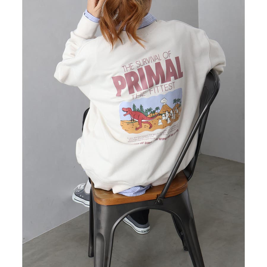 背中に恐竜×おばけのユーモアあふれるグラフィックを大胆にプリントしたスウェット。
