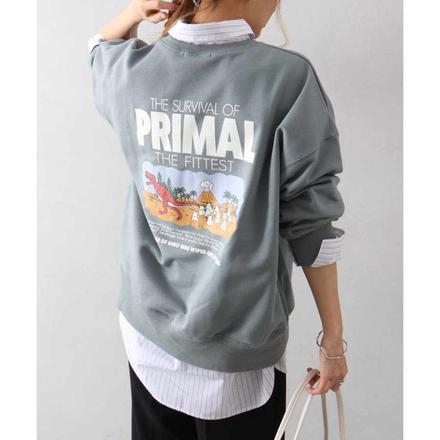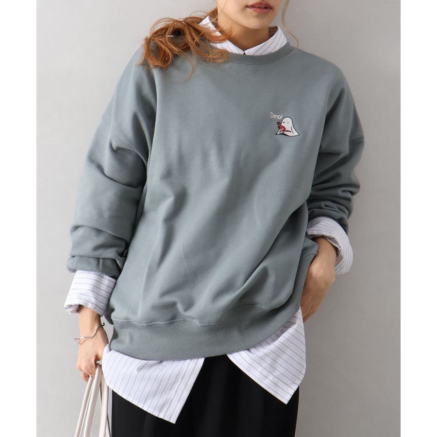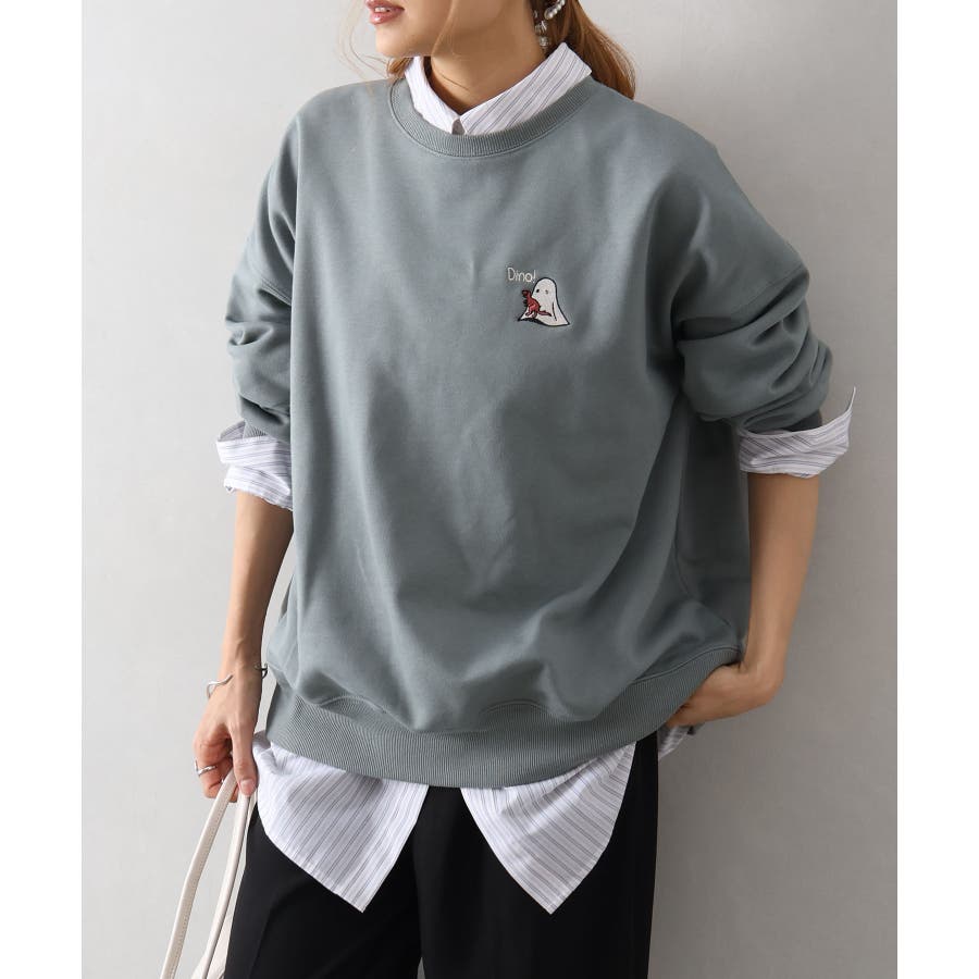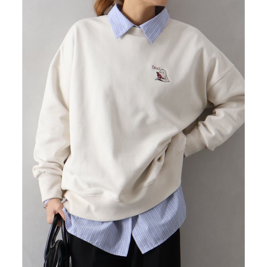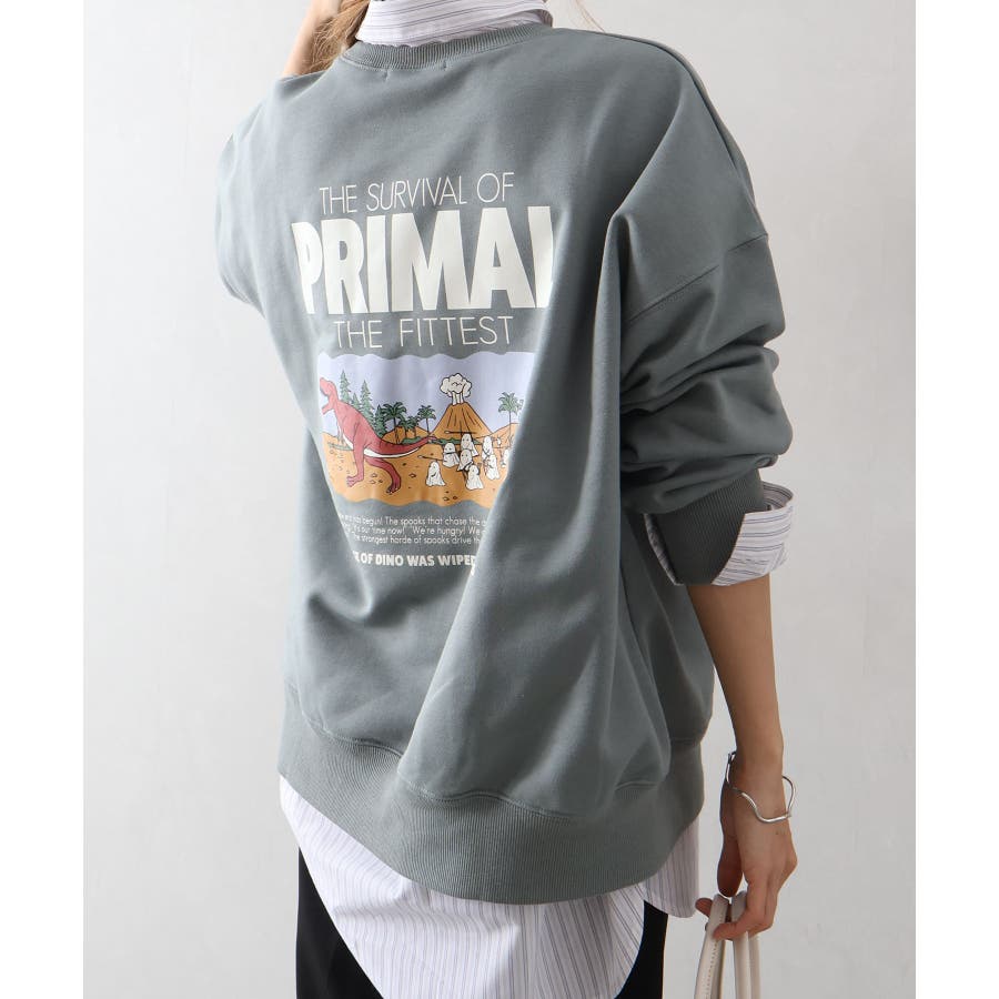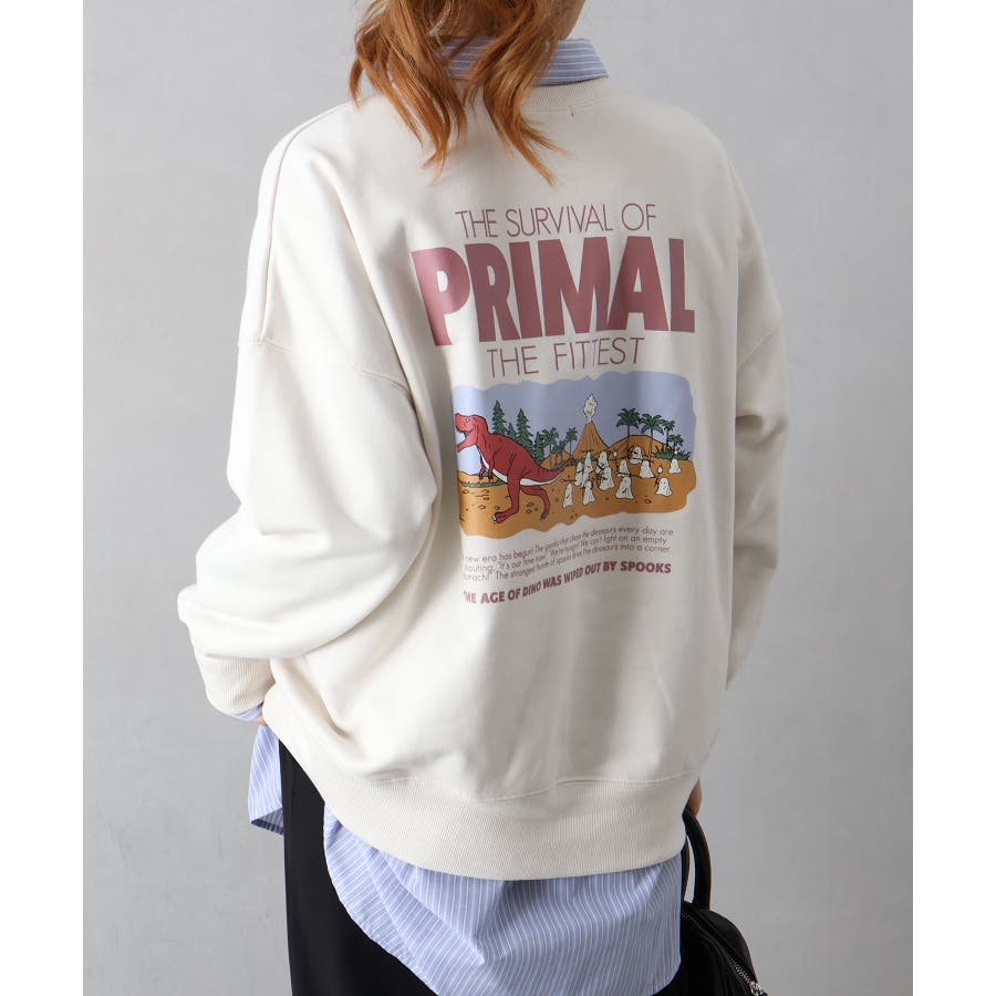 背中に恐竜×おばけのユーモアあふれるグラフィックを大胆にプリントしたスウェット。