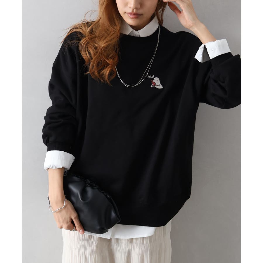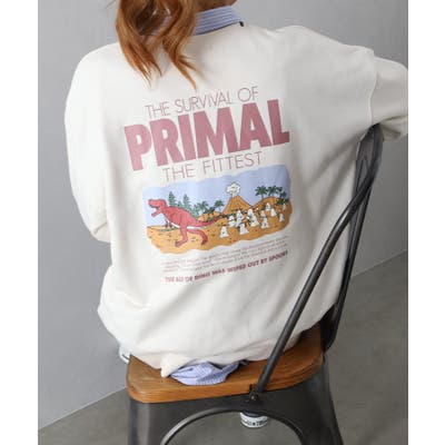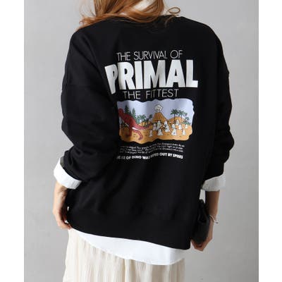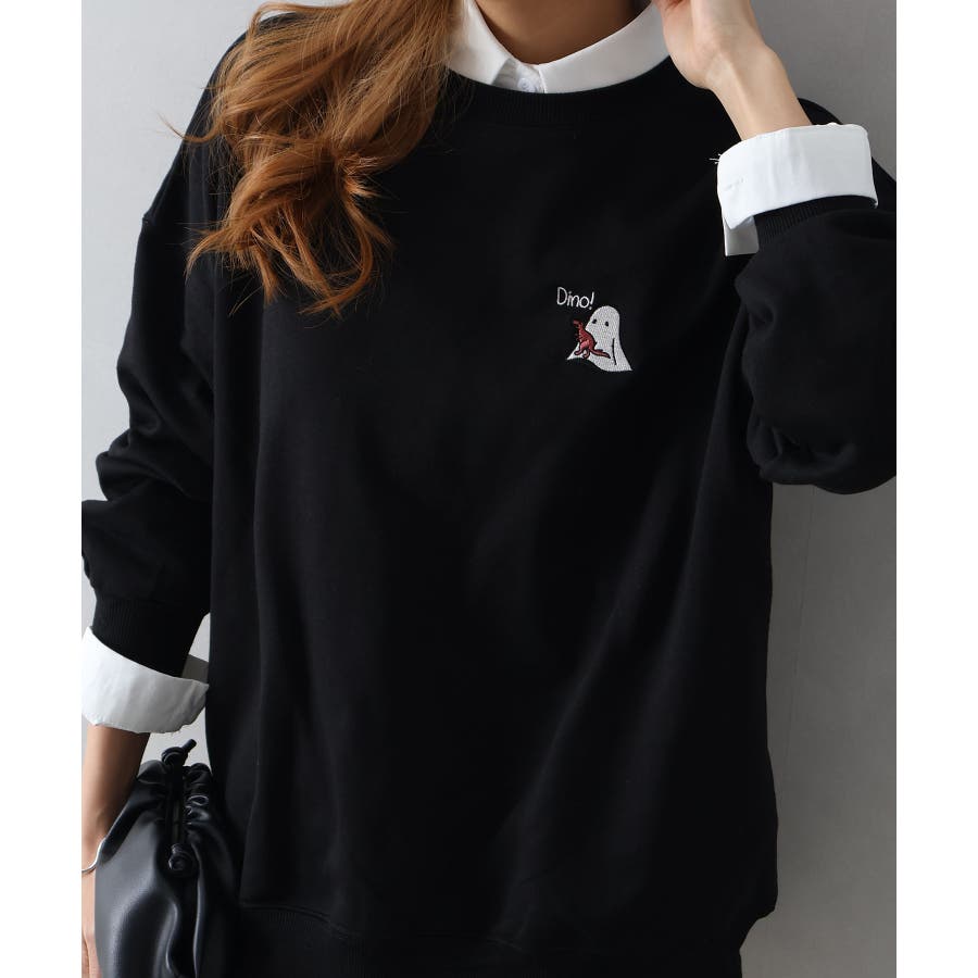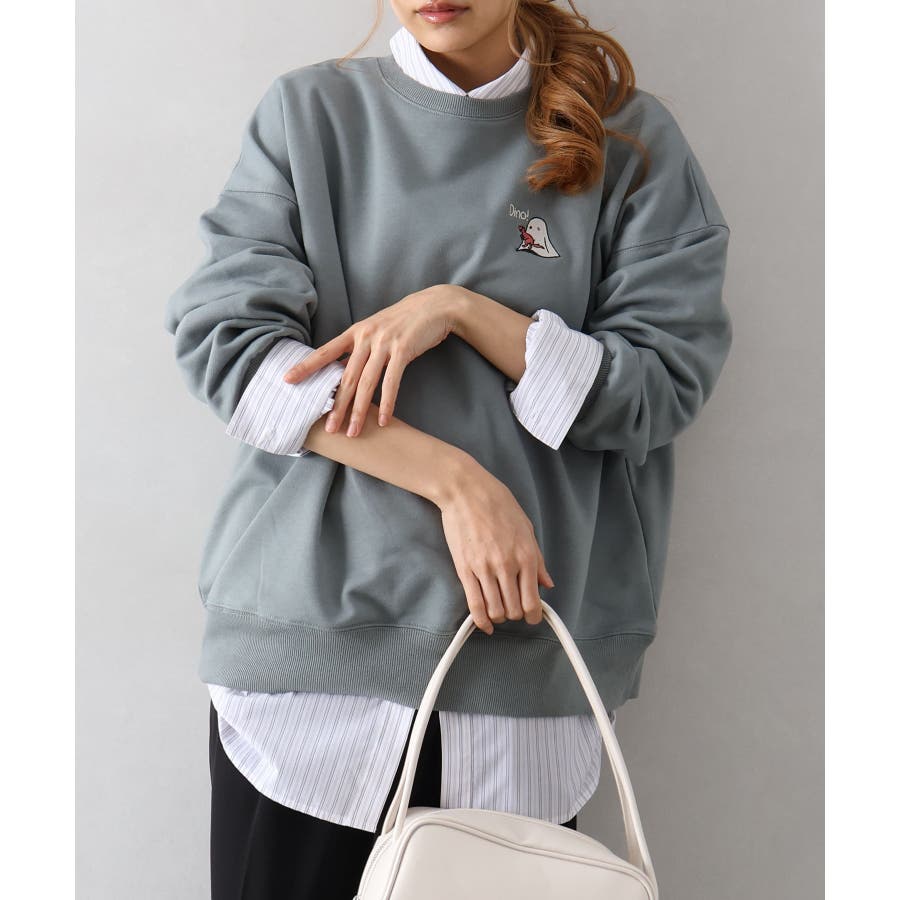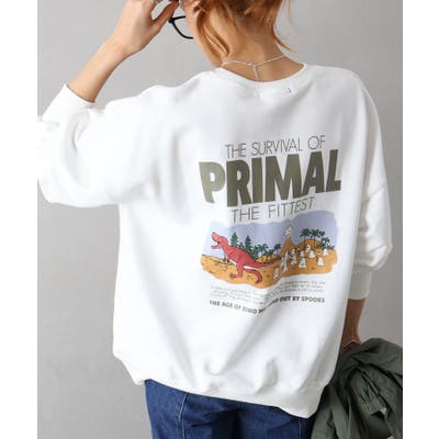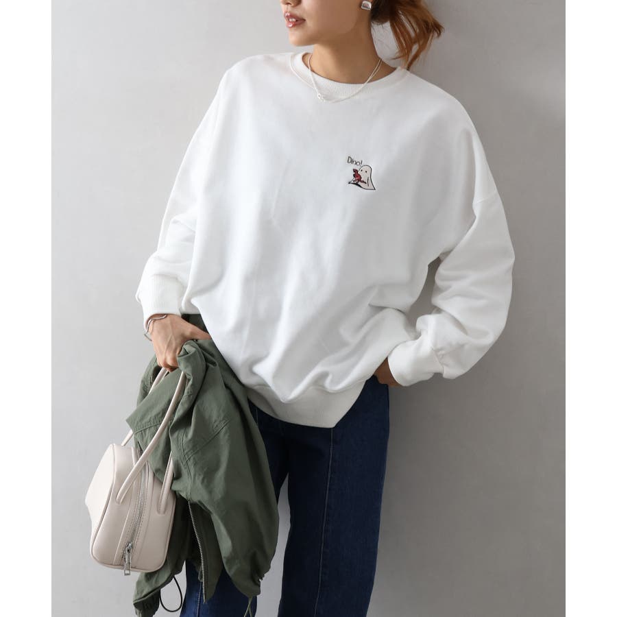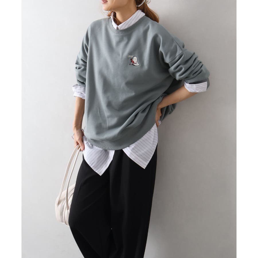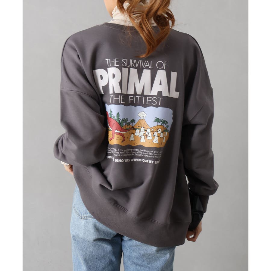 背中に恐竜×おばけのユーモアあふれるグラフィックを大胆にプリントしたスウェット。