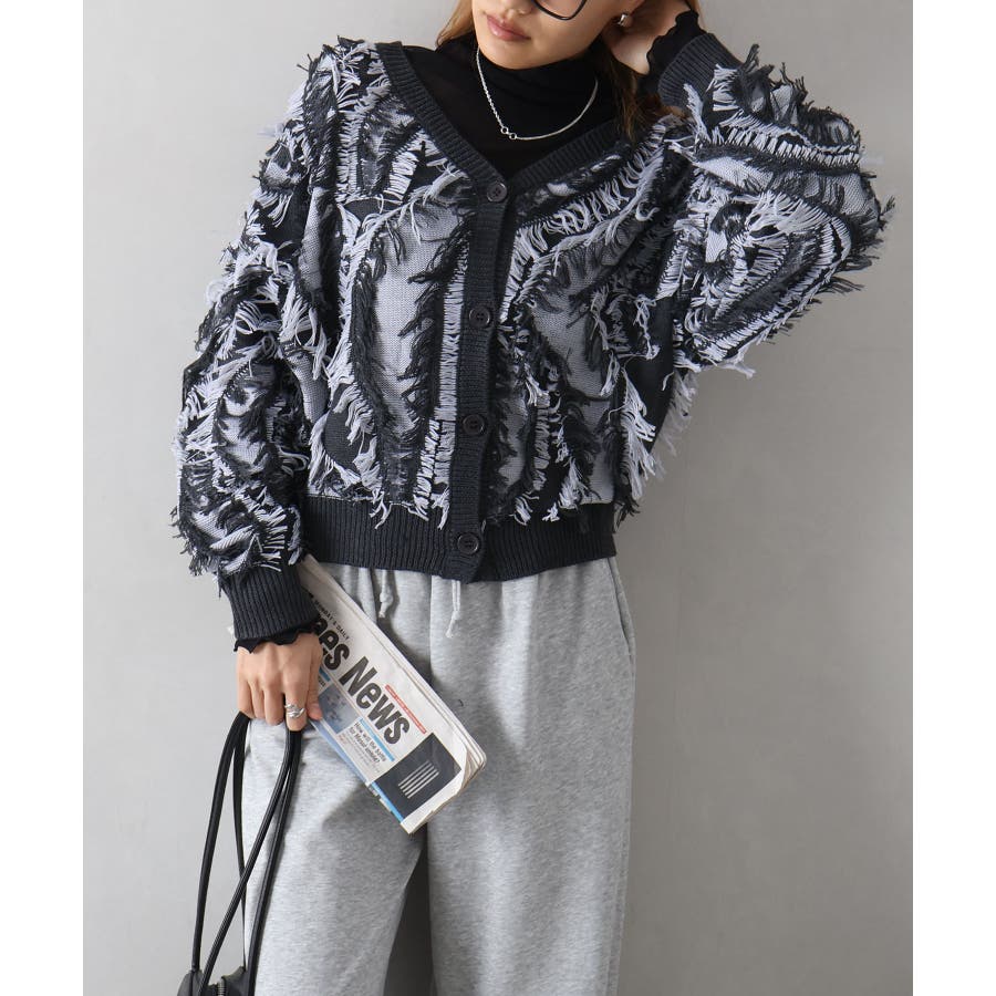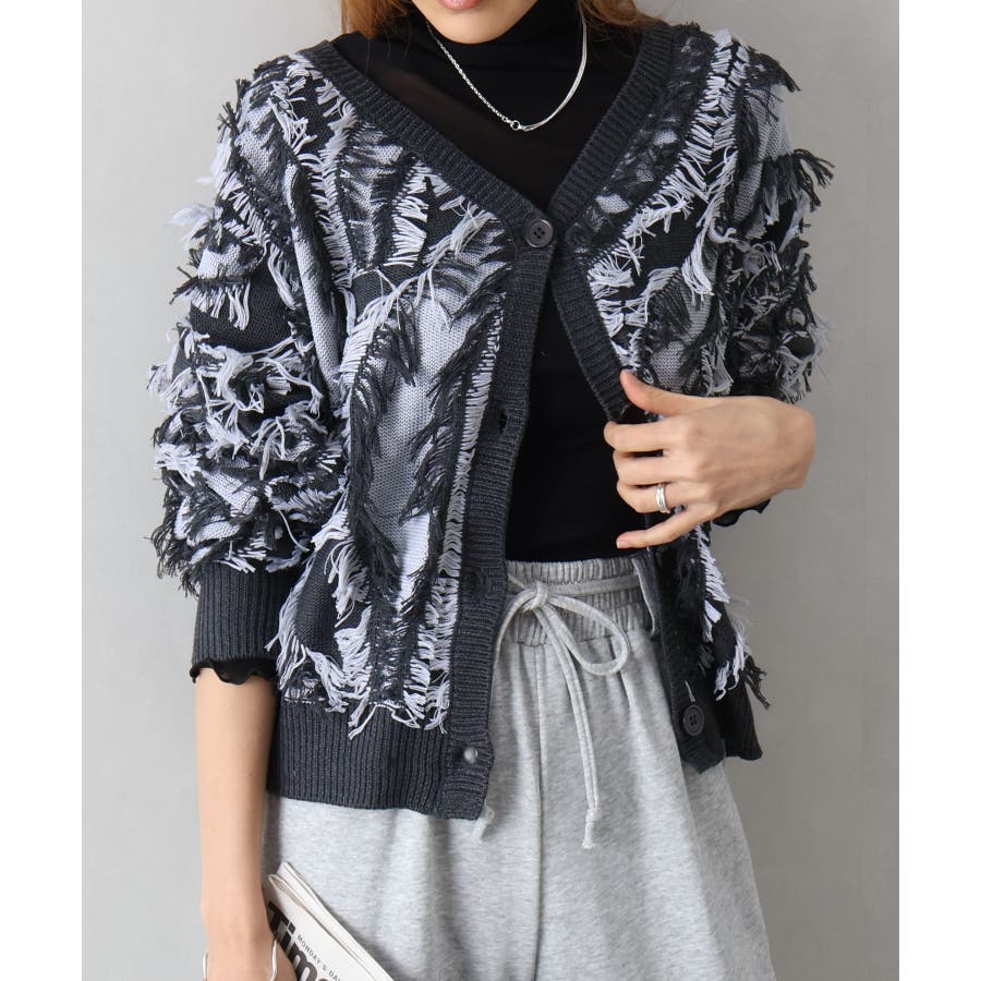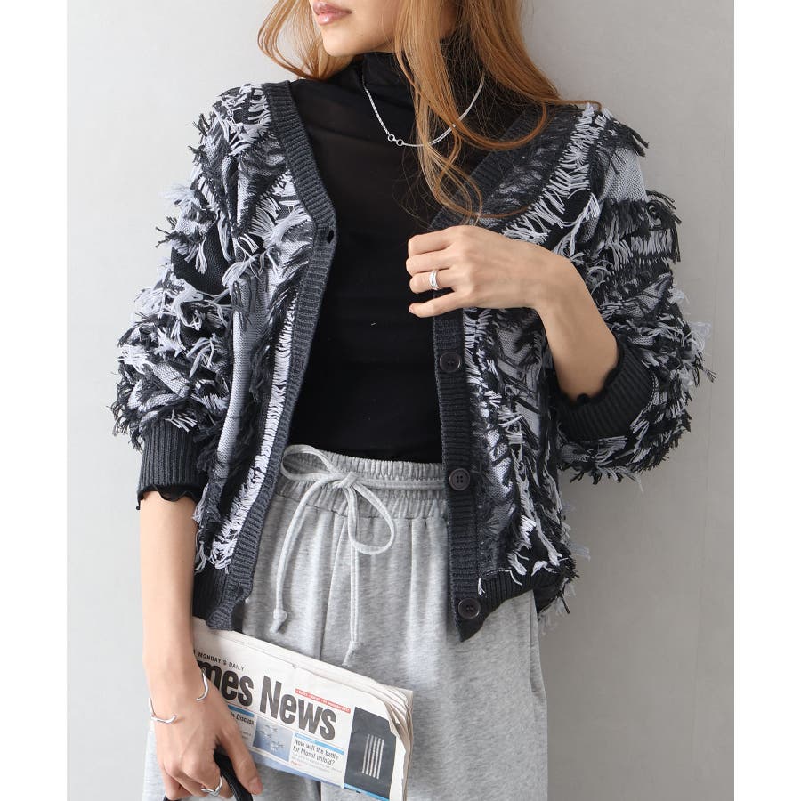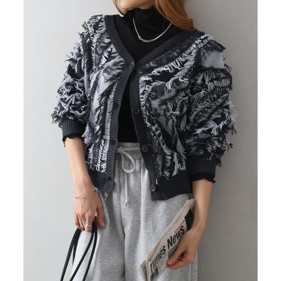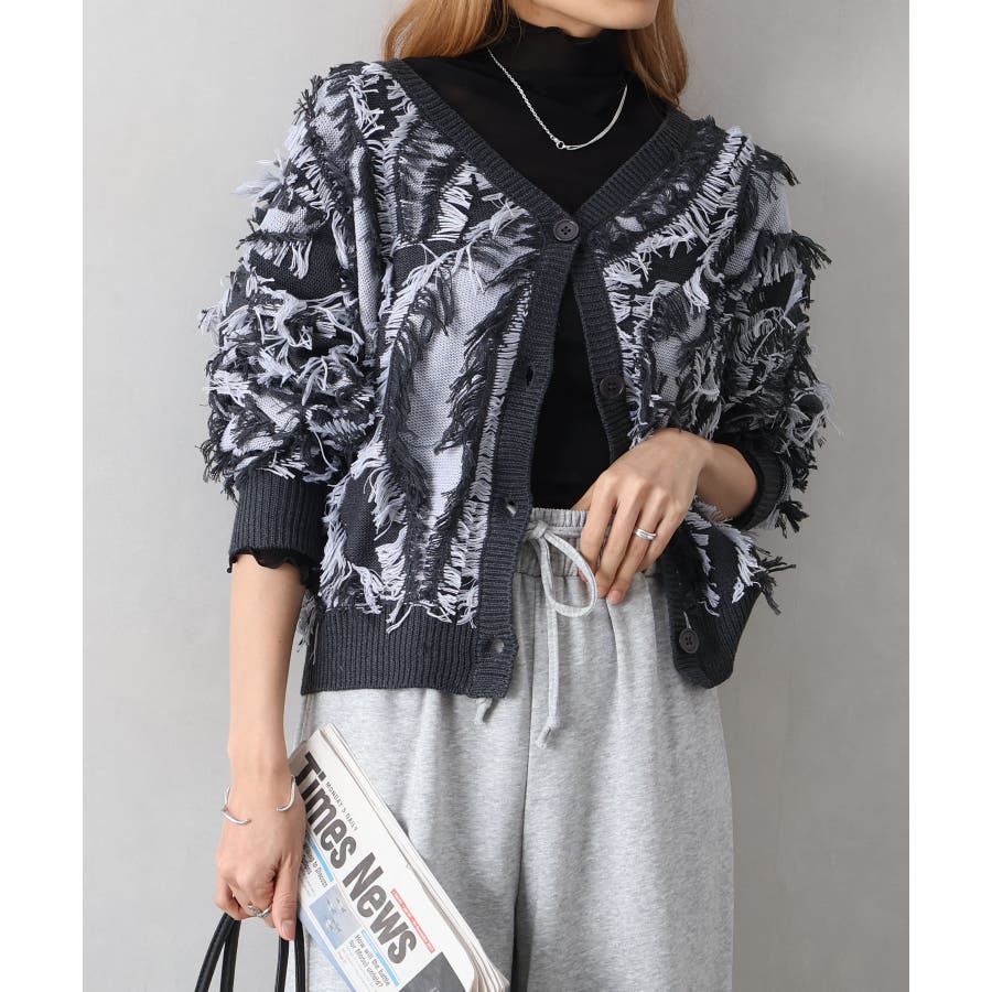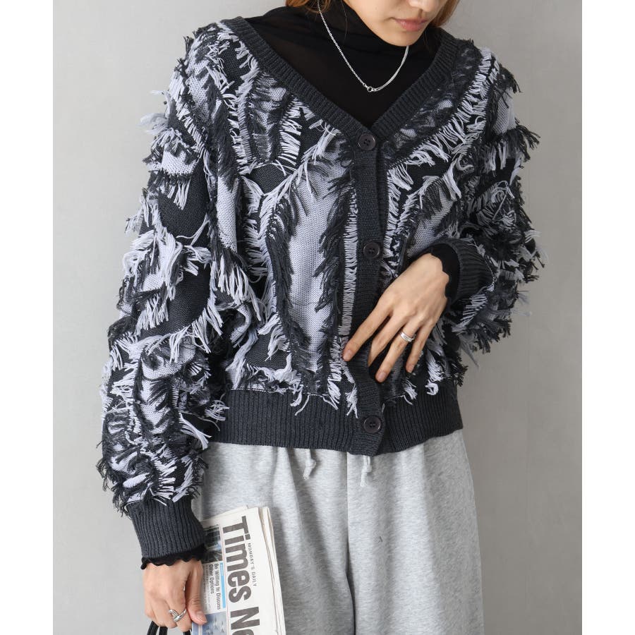 立体感のあるウェーブ状フリンジが目を惹く、存在感たっぷりのデザインカーディガン。