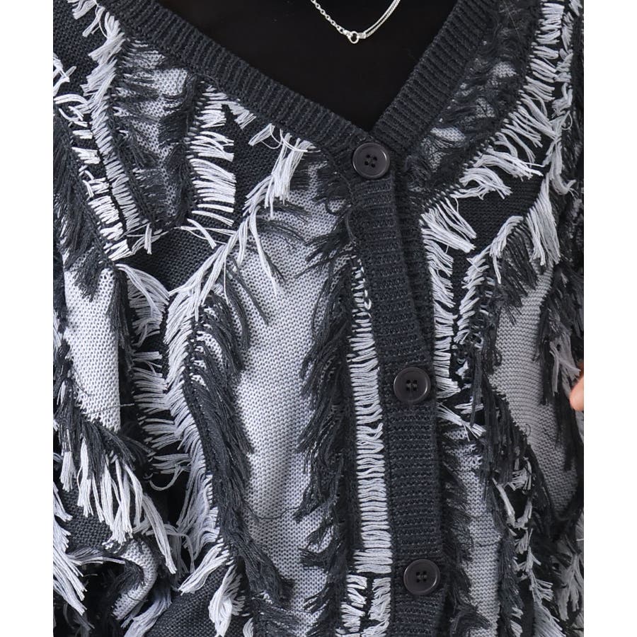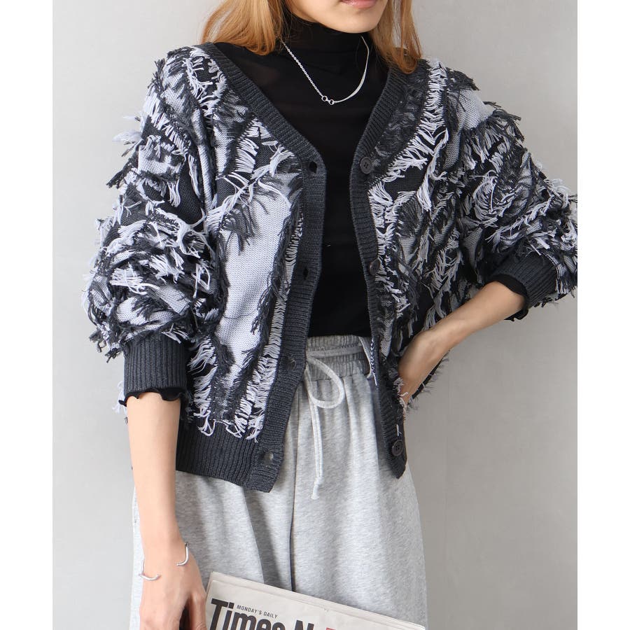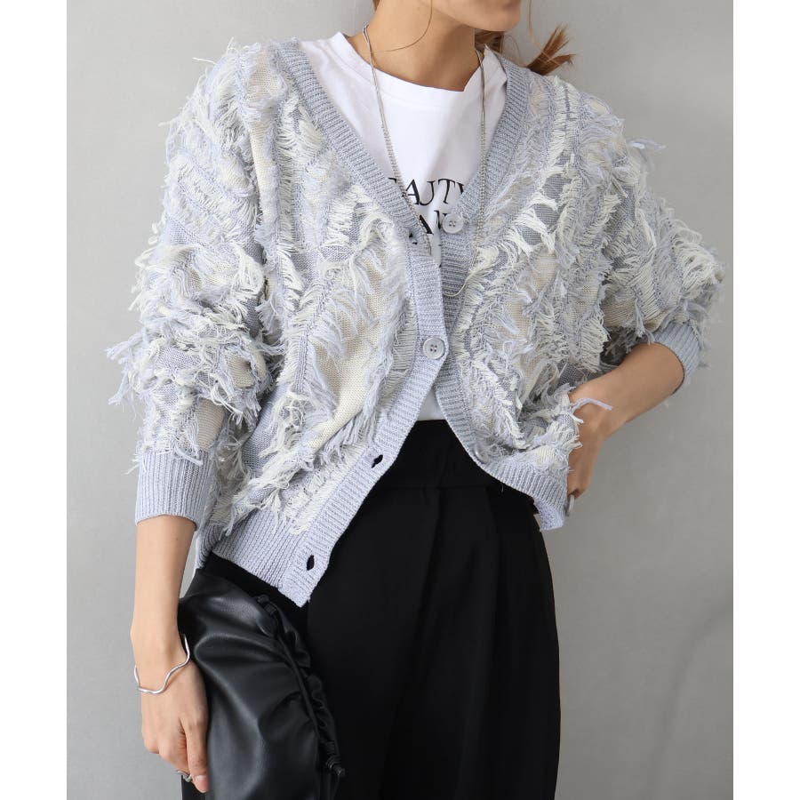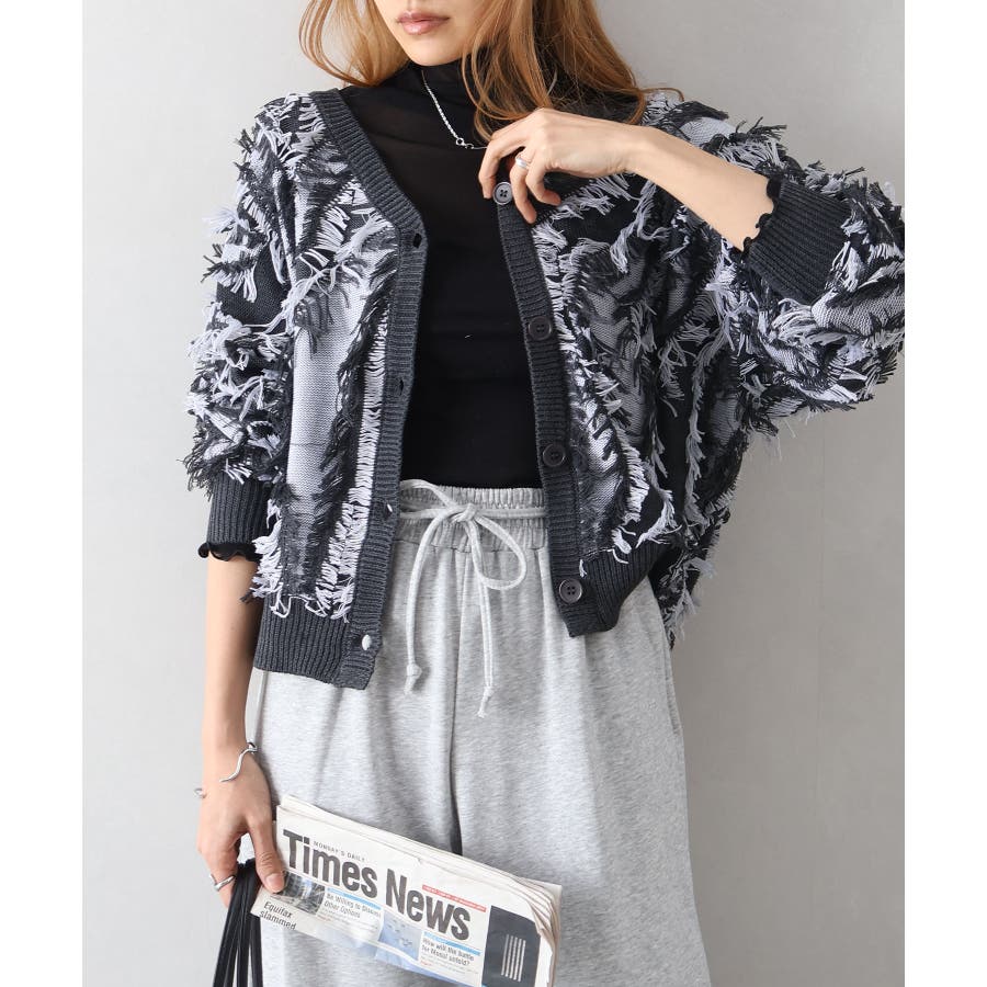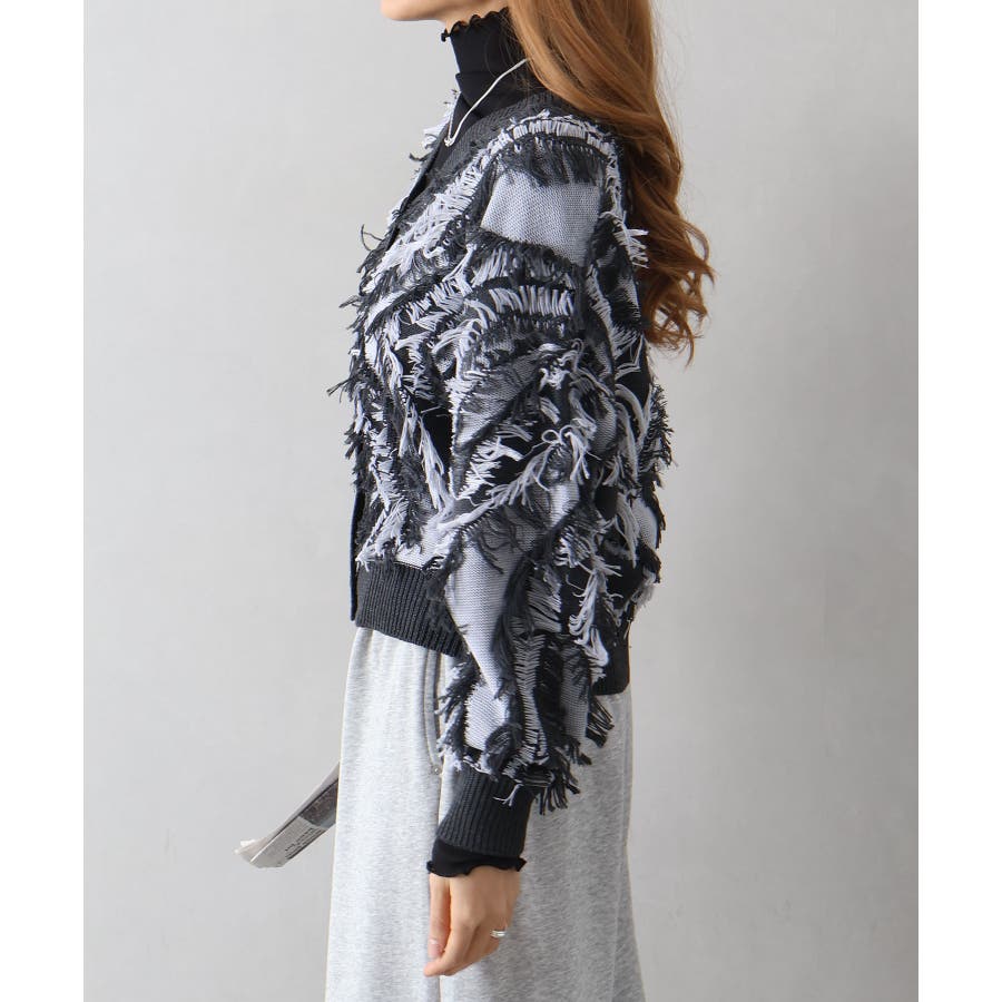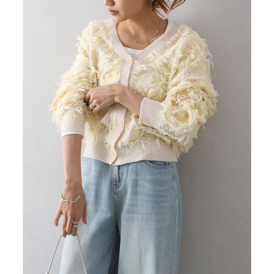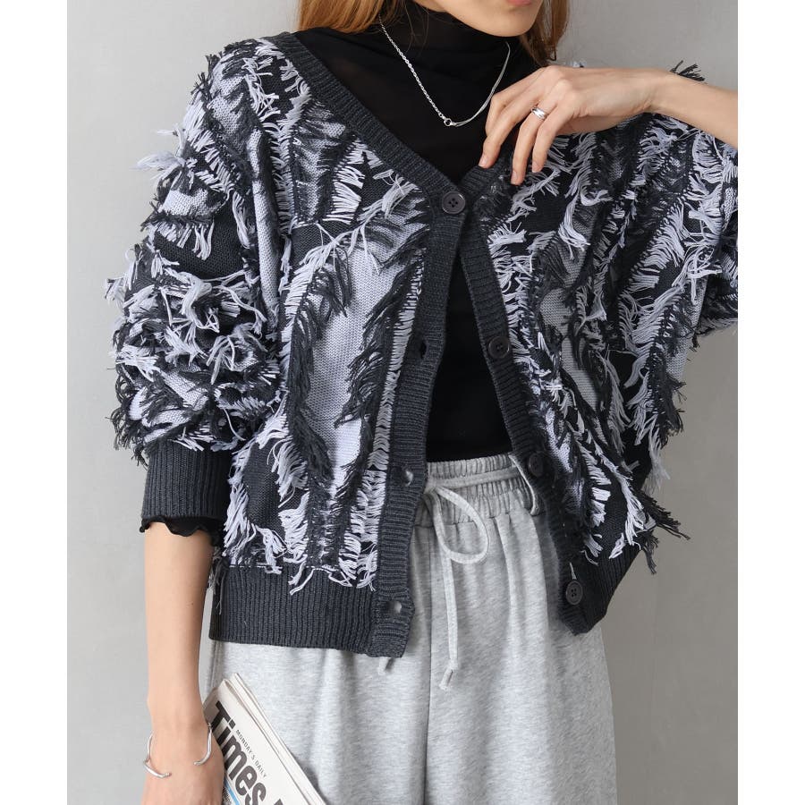 立体感のあるウェーブ状フリンジが目を惹く、存在感たっぷりのデザインカーディガン。