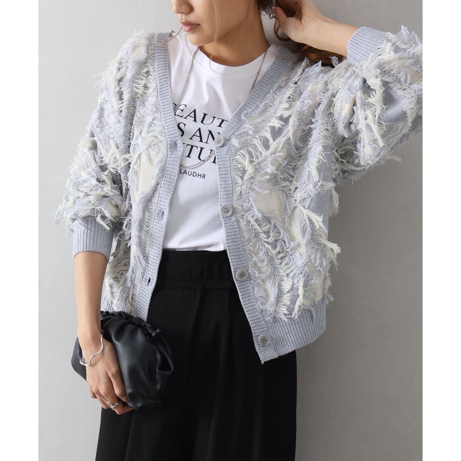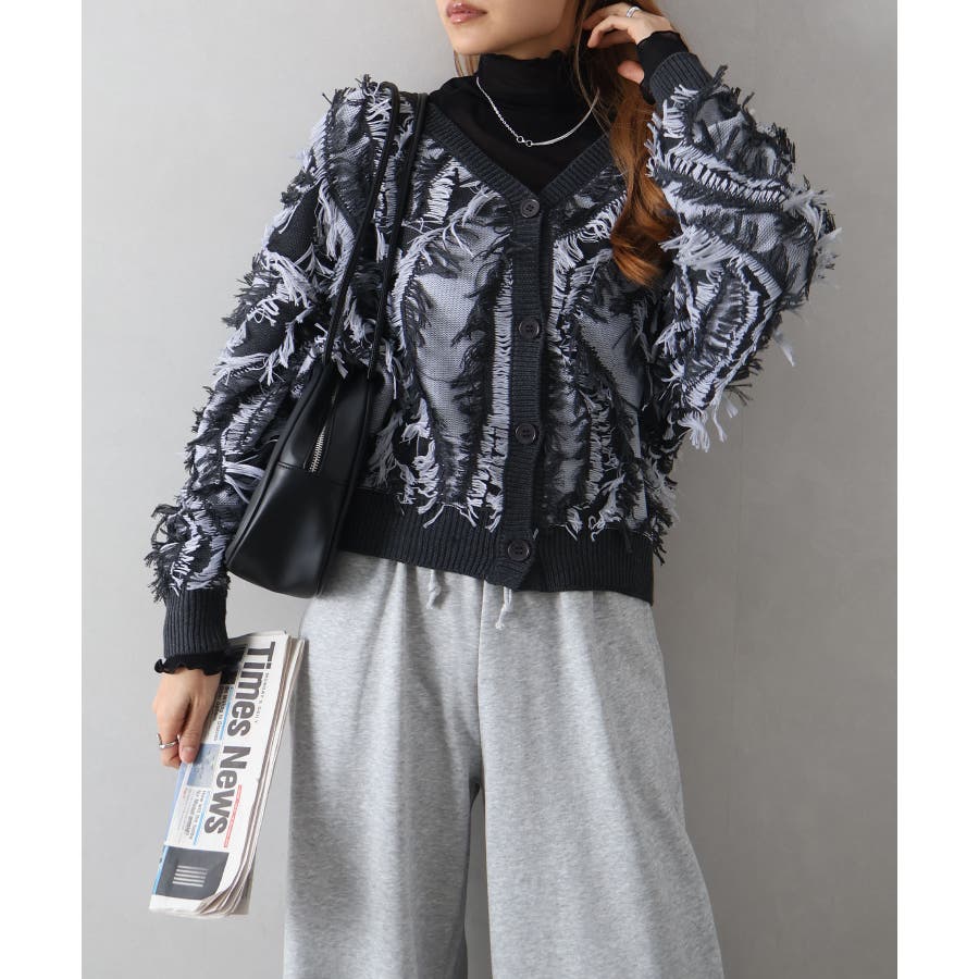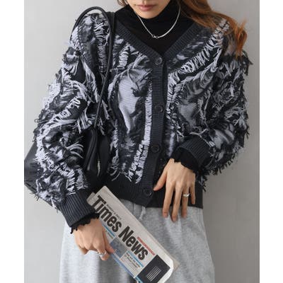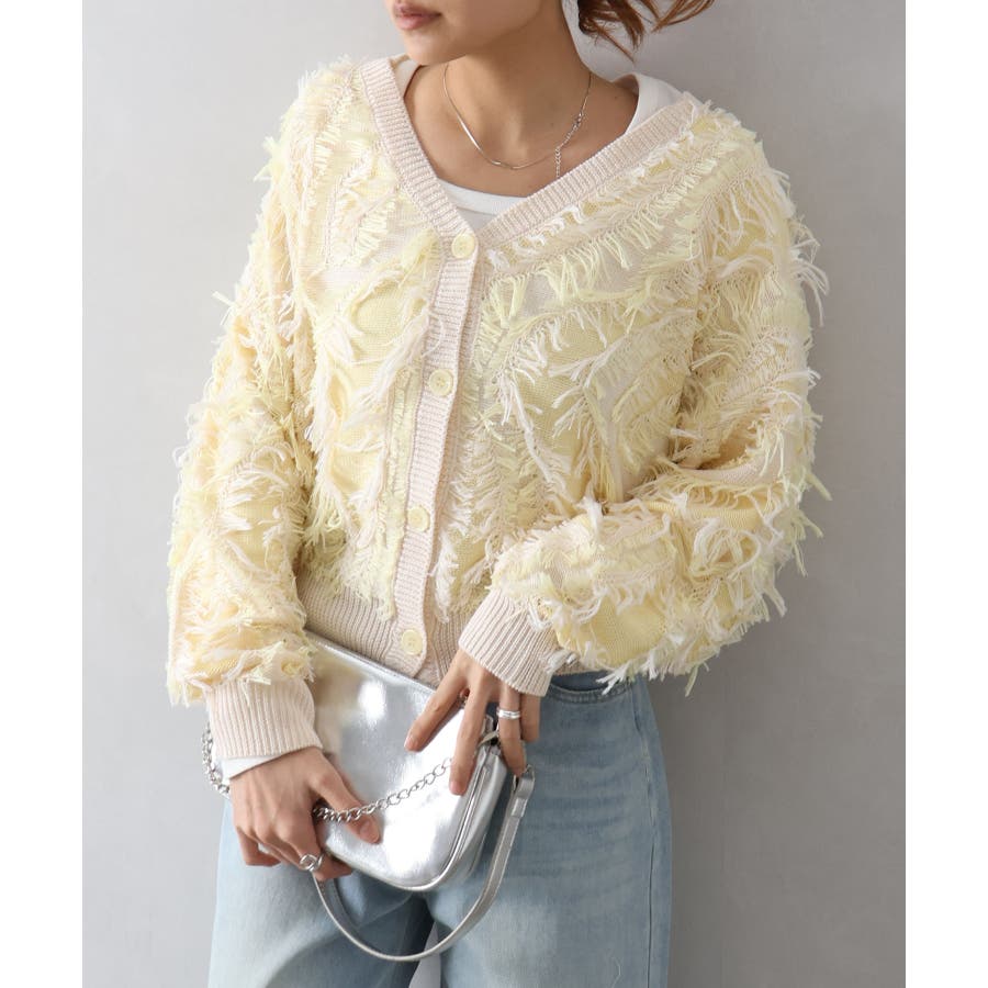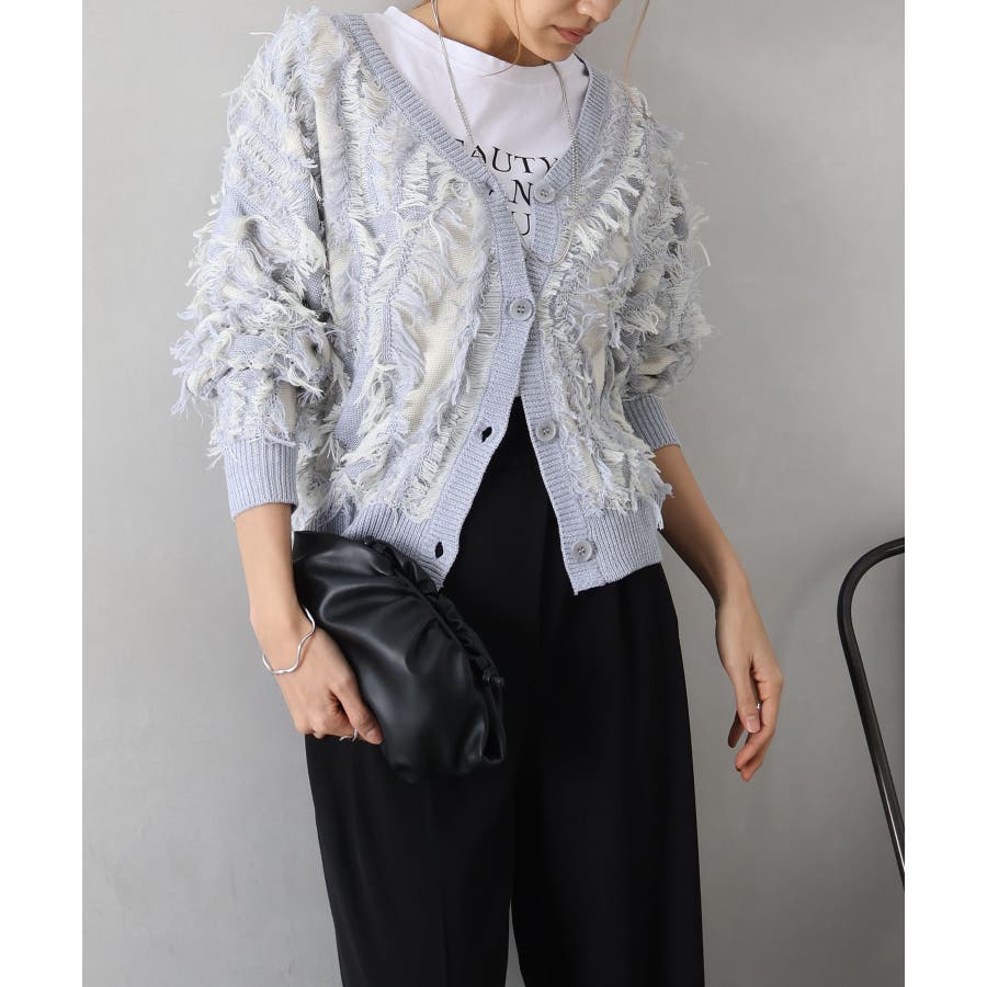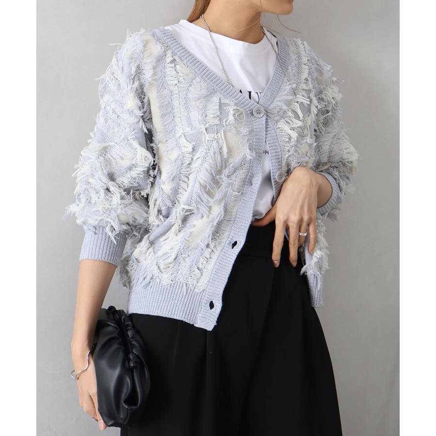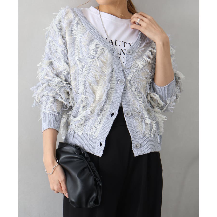 立体感のあるウェーブ状フリンジが目を惹く、存在感たっぷりのデザインカーディガン。