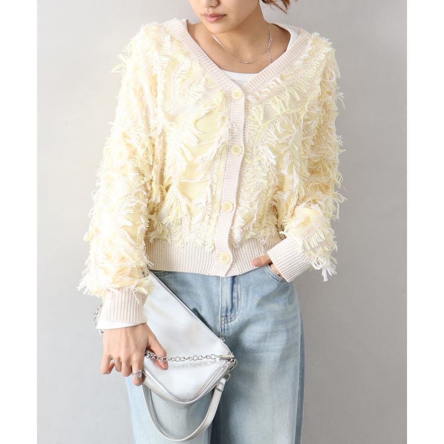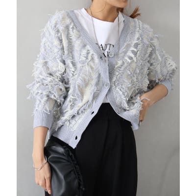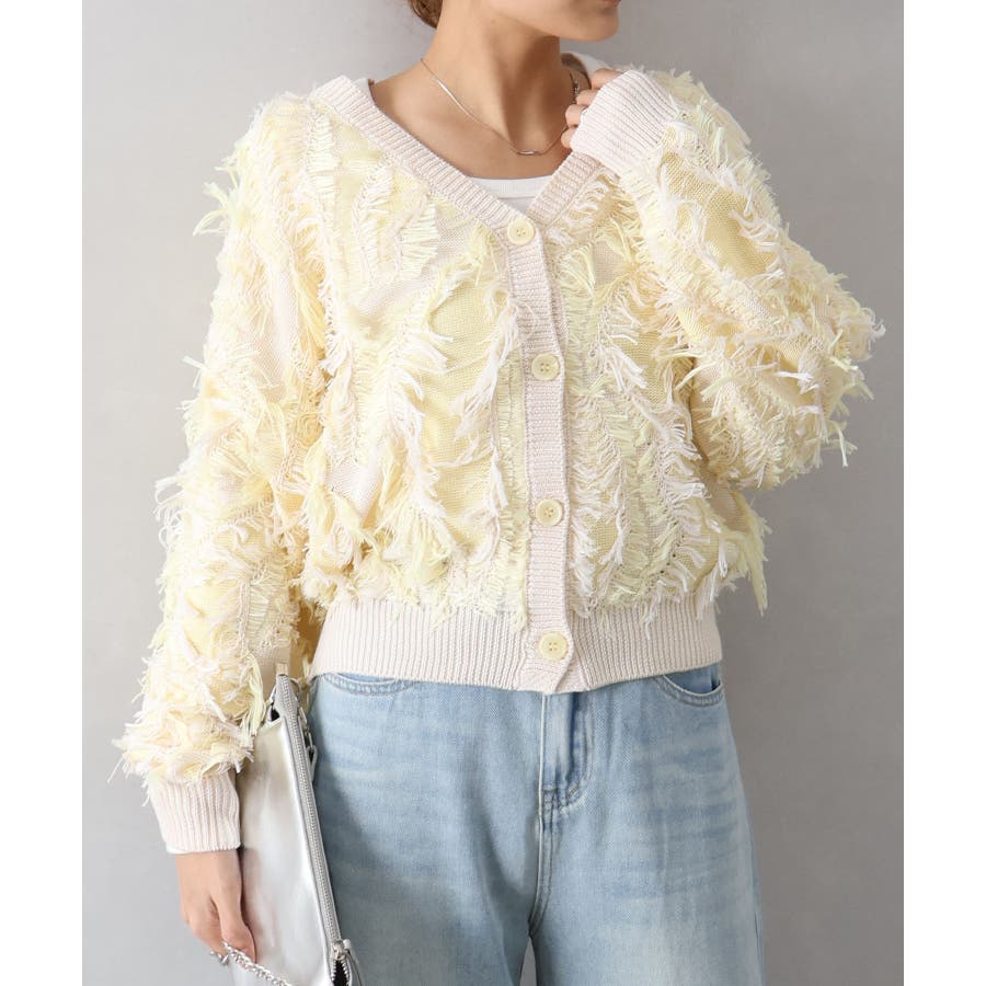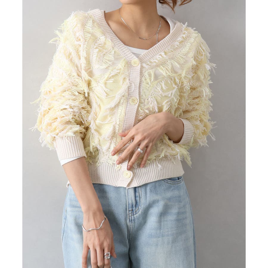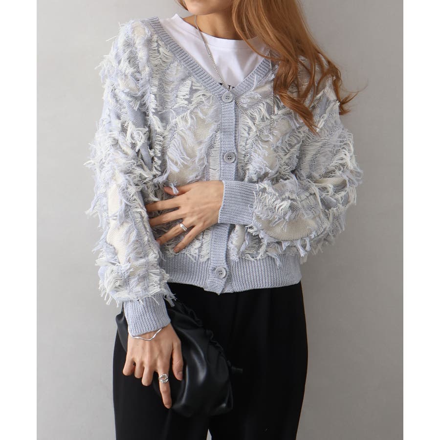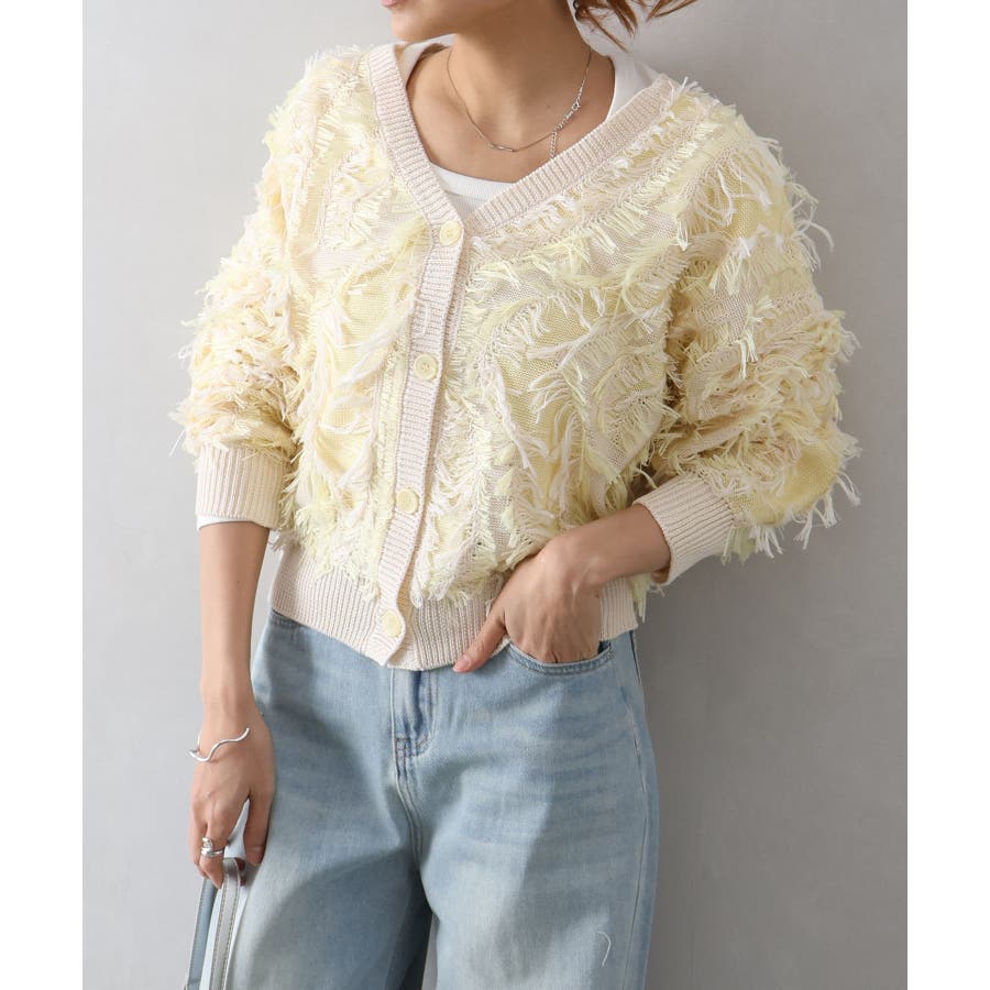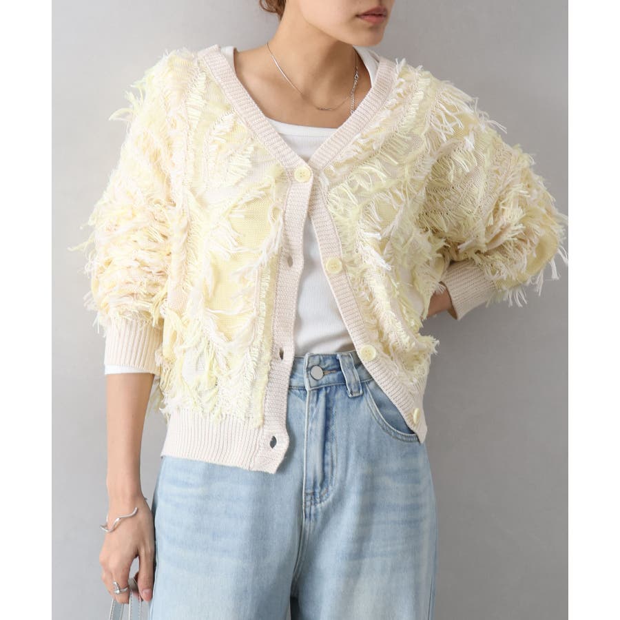 立体感のあるウェーブ状フリンジが目を惹く、存在感たっぷりのデザインカーディガン。