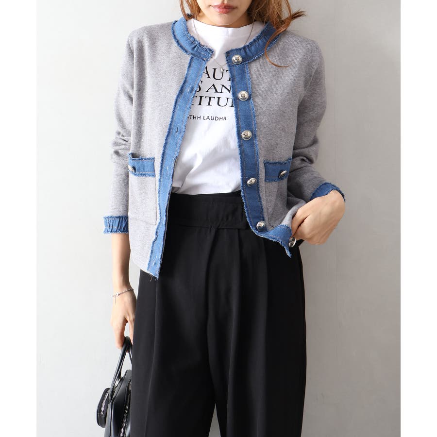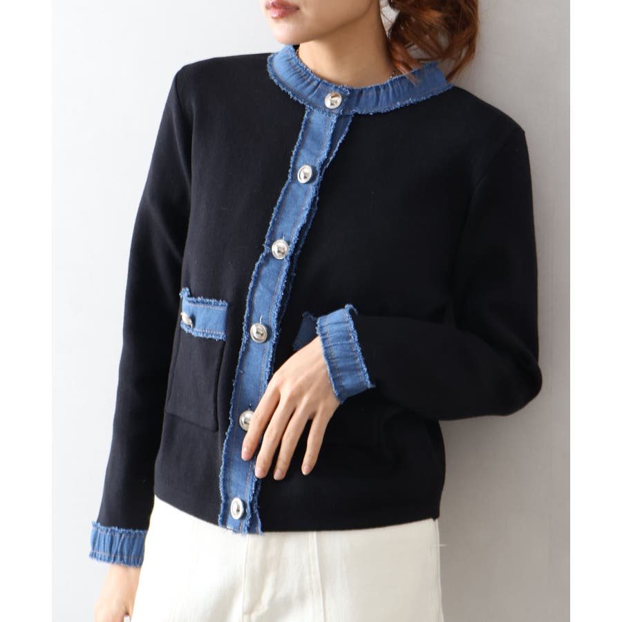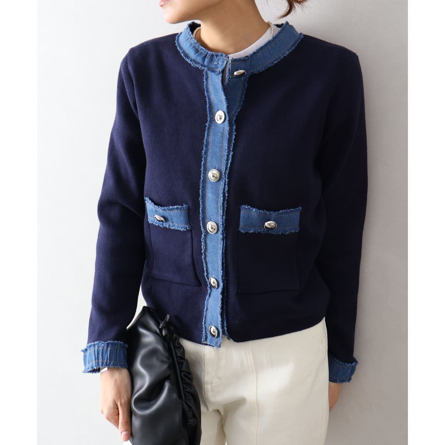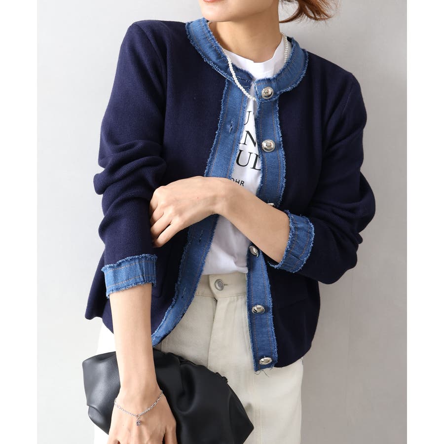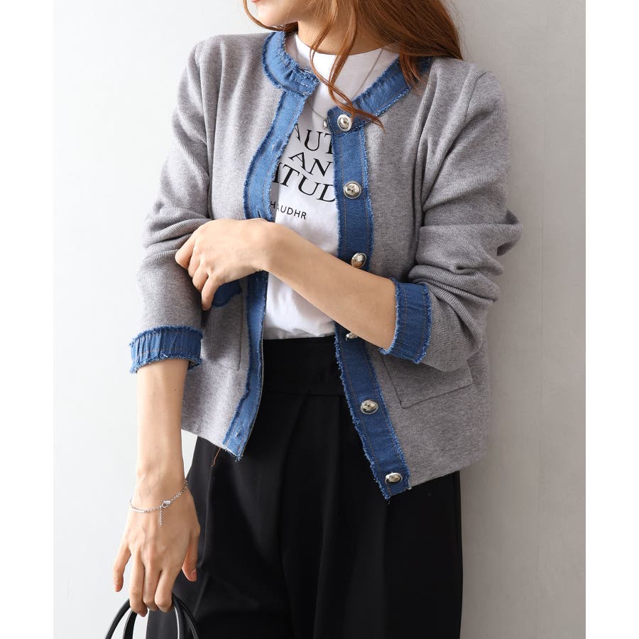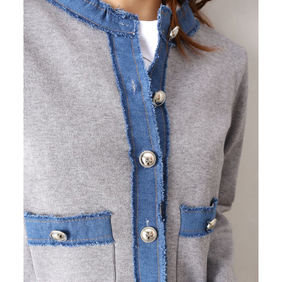 ノーカラーデザインにデニム切り替えを施した、程よくカジュアル感のあるカーディガン。