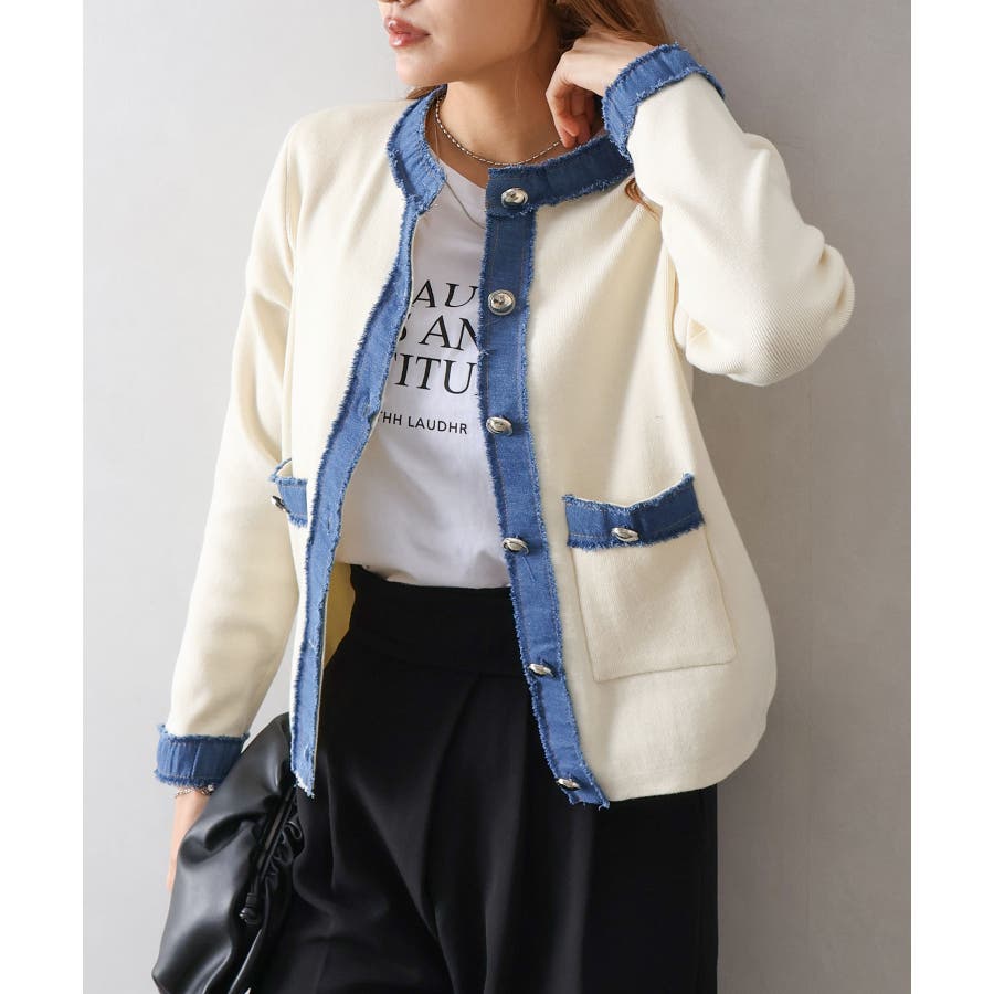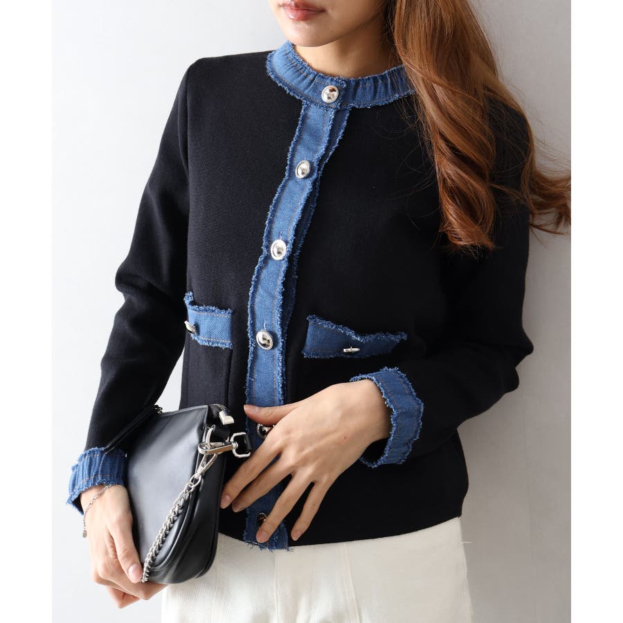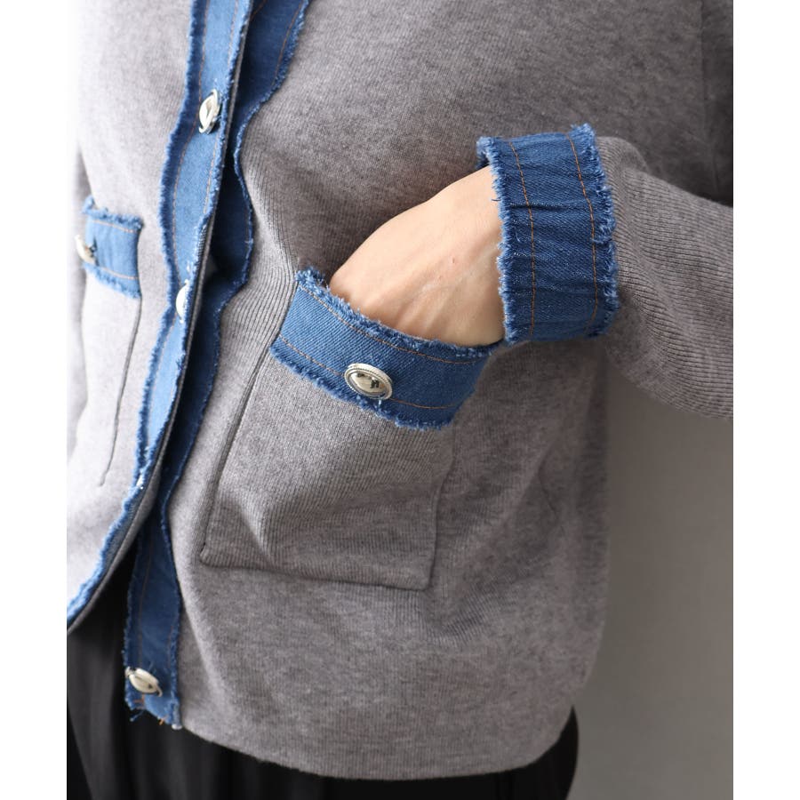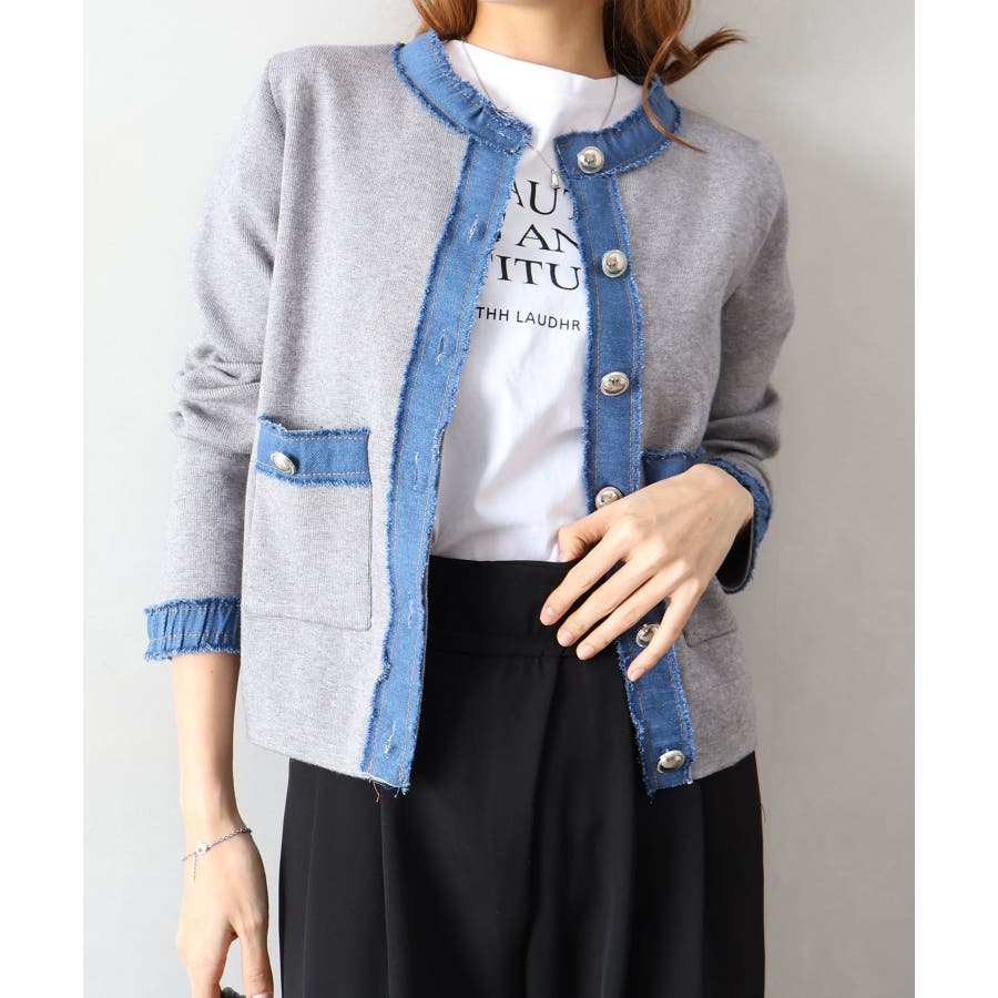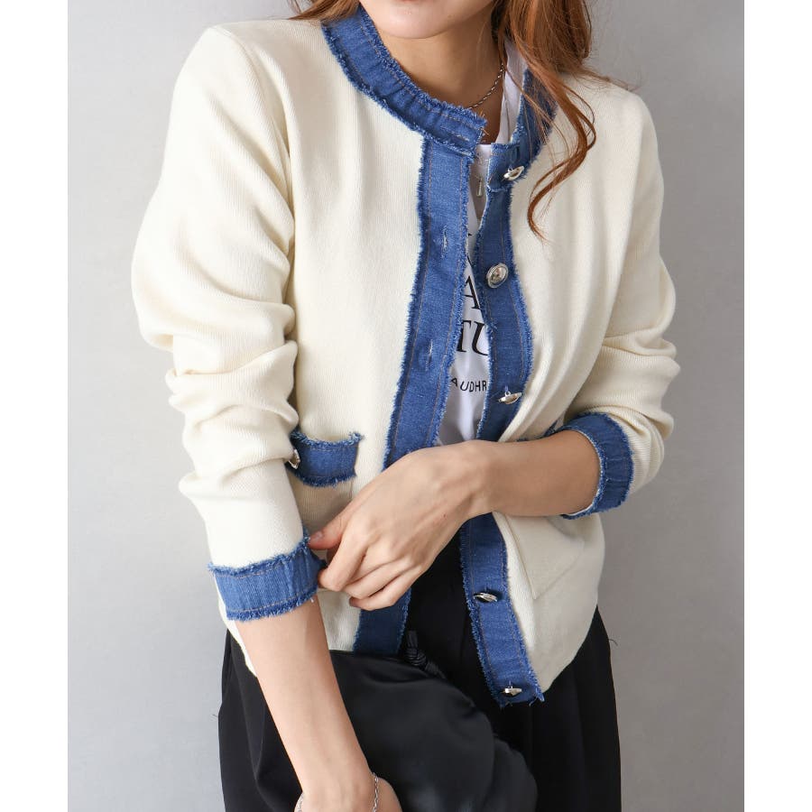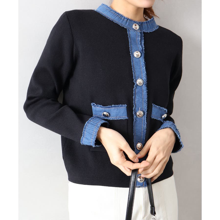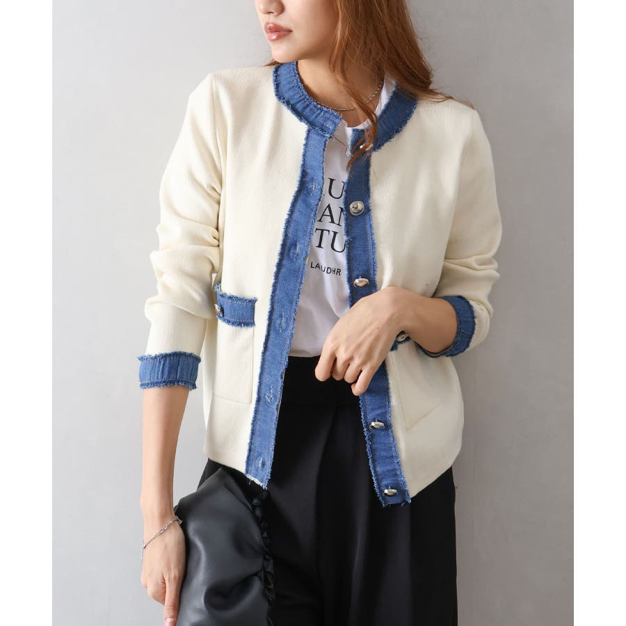 ノーカラーデザインにデニム切り替えを施した、程よくカジュアル感のあるカーディガン。