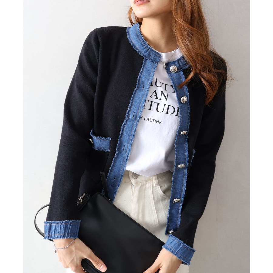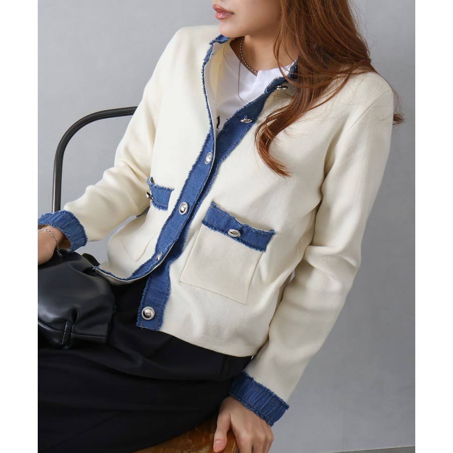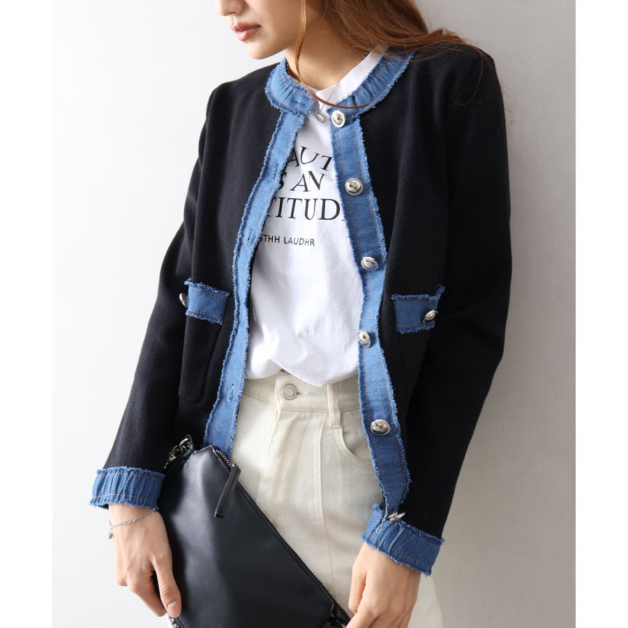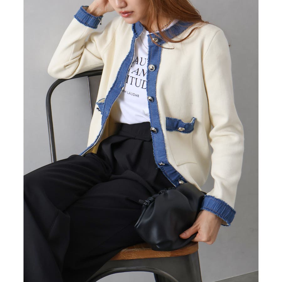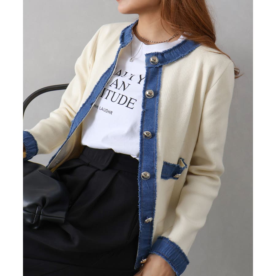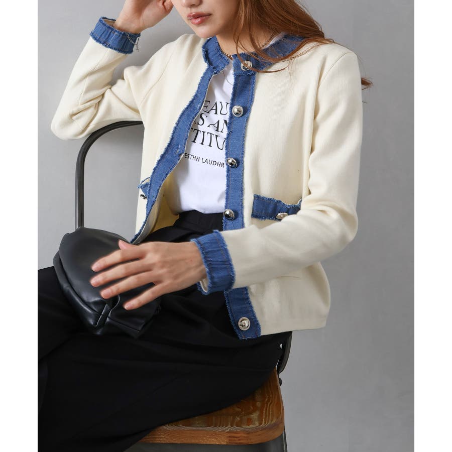 ノーカラーデザインにデニム切り替えを施した、程よくカジュアル感のあるカーディガン。