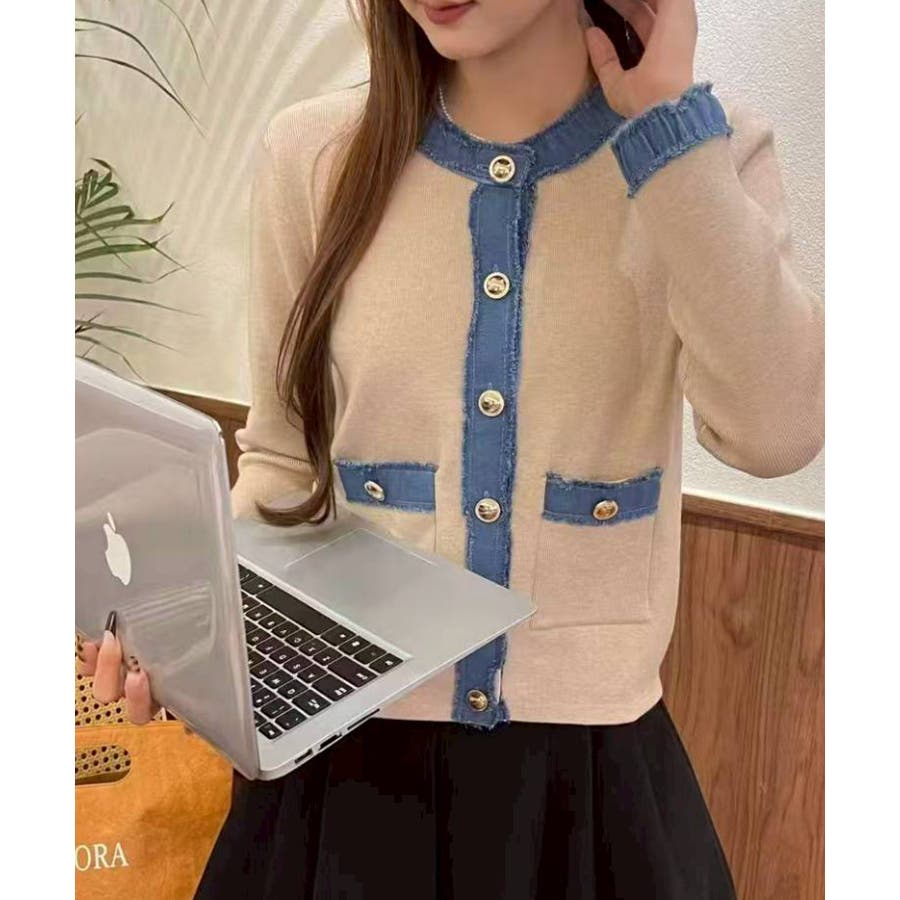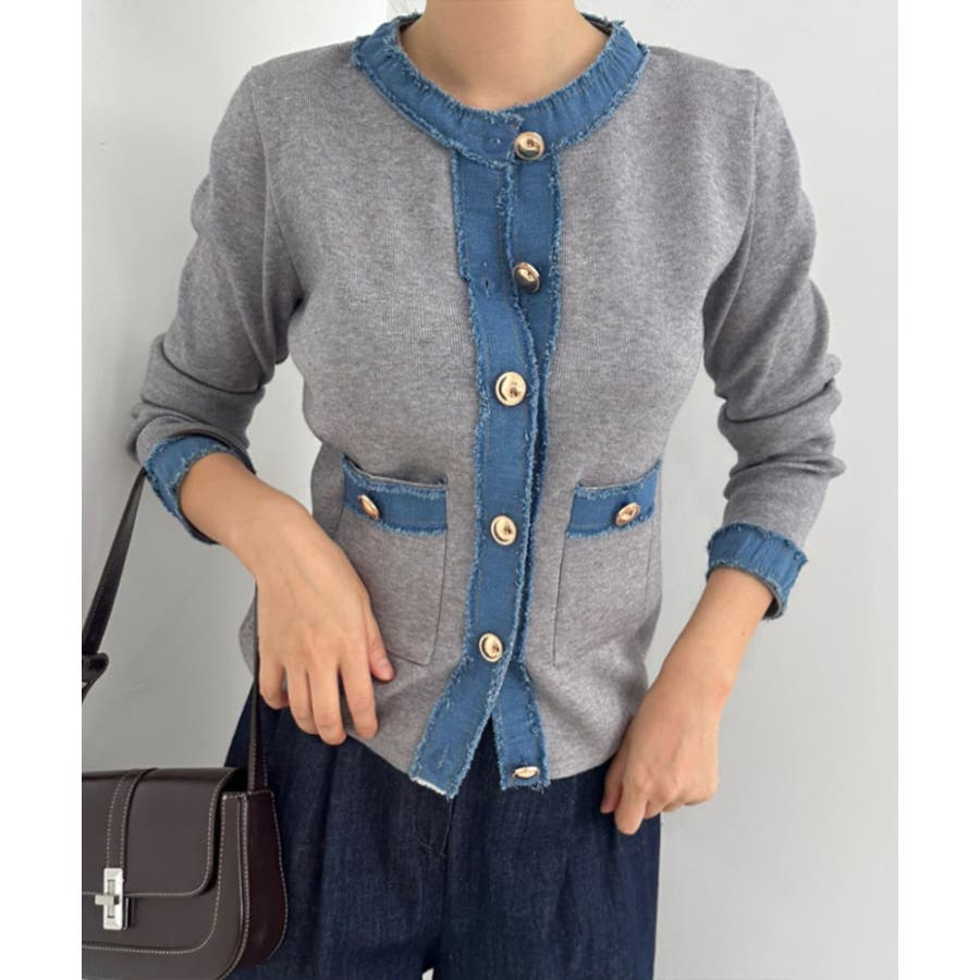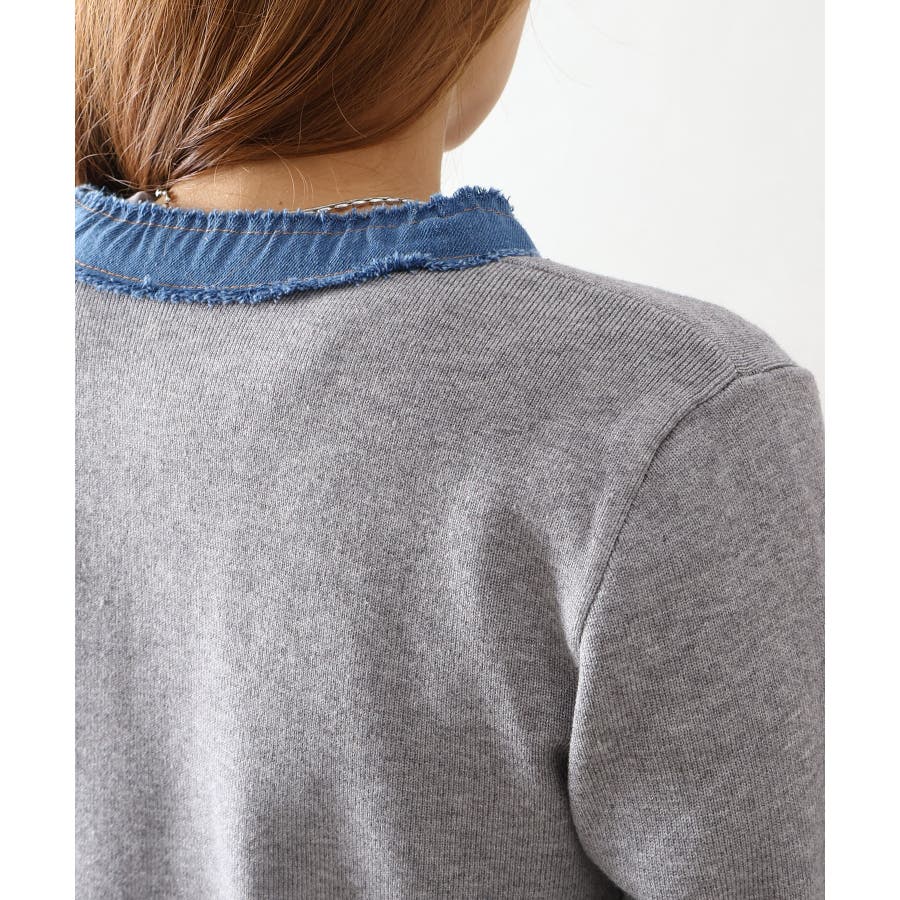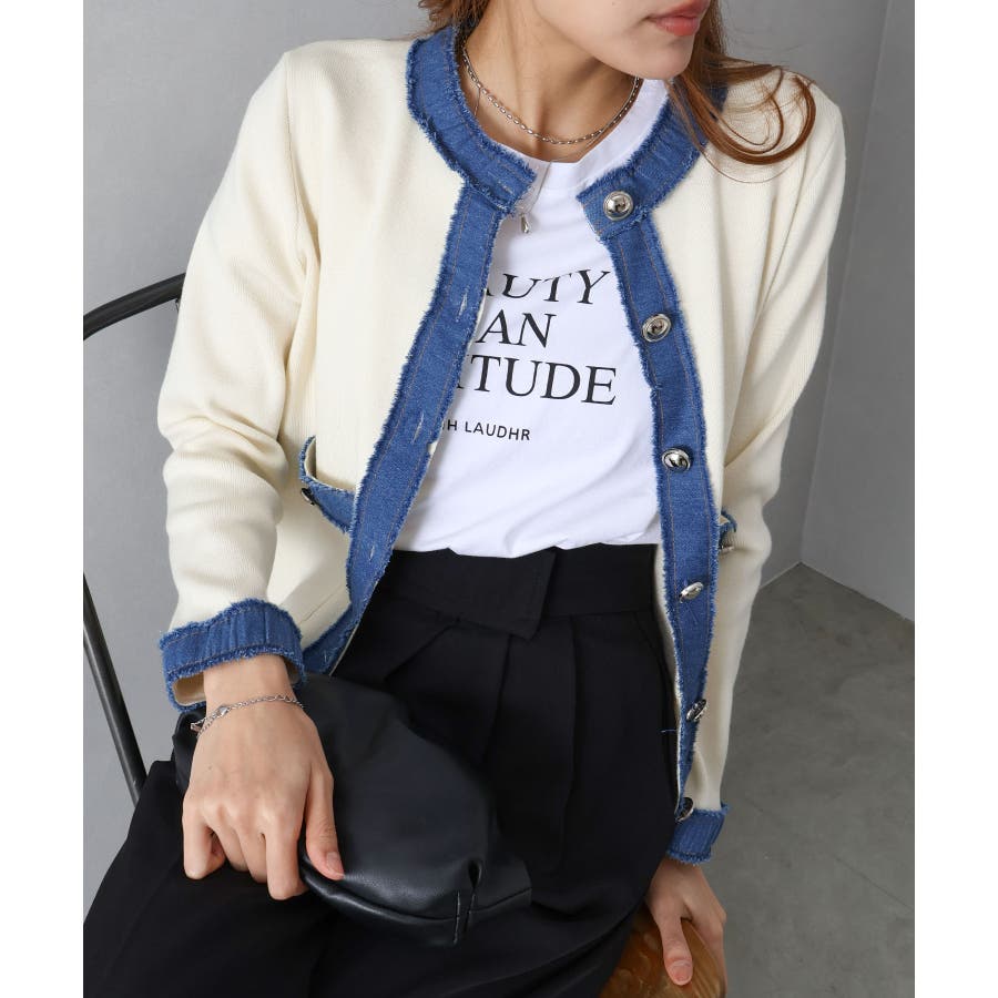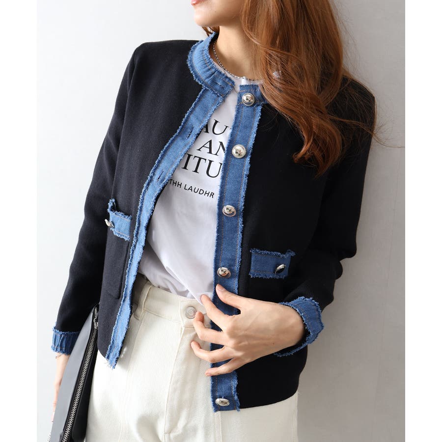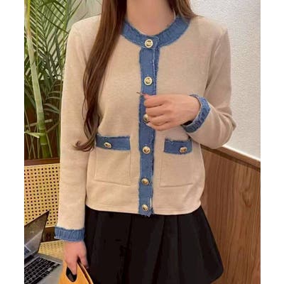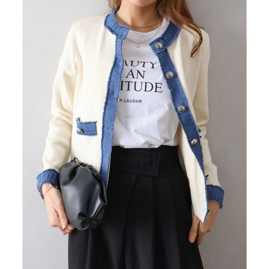 ノーカラーデザインにデニム切り替えを施した、程よくカジュアル感のあるカーディガン。
