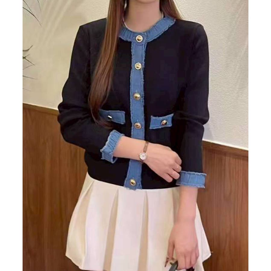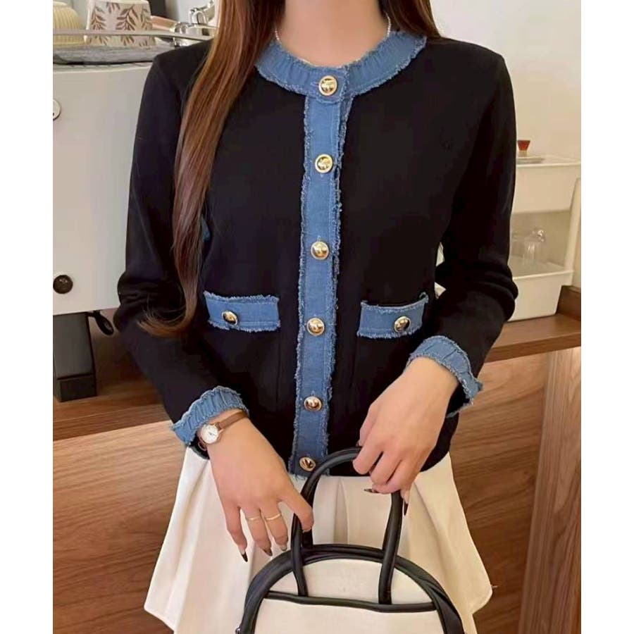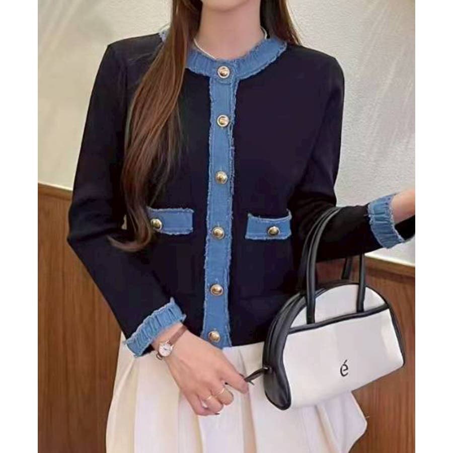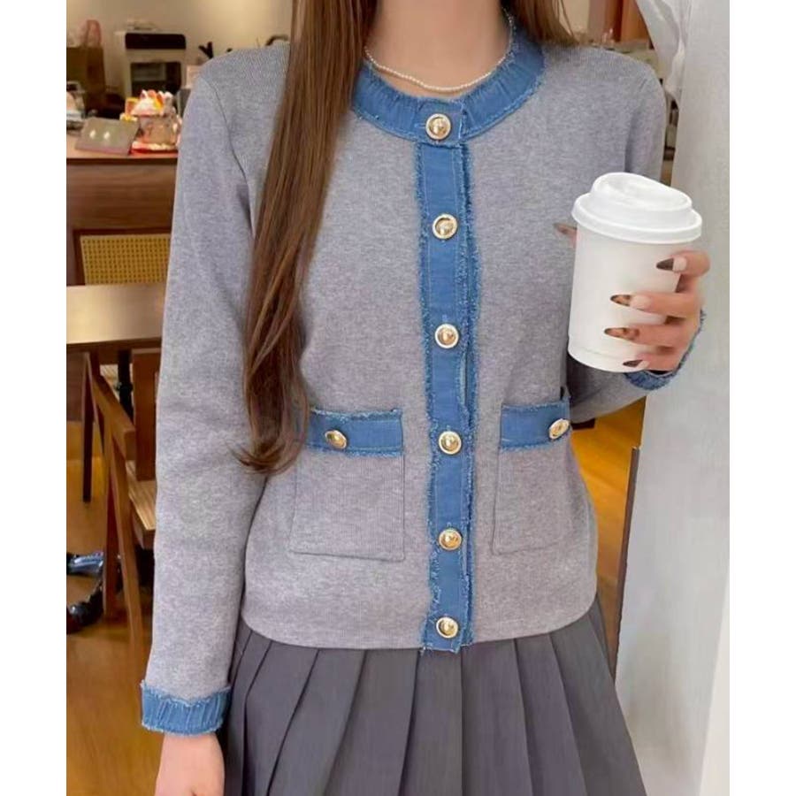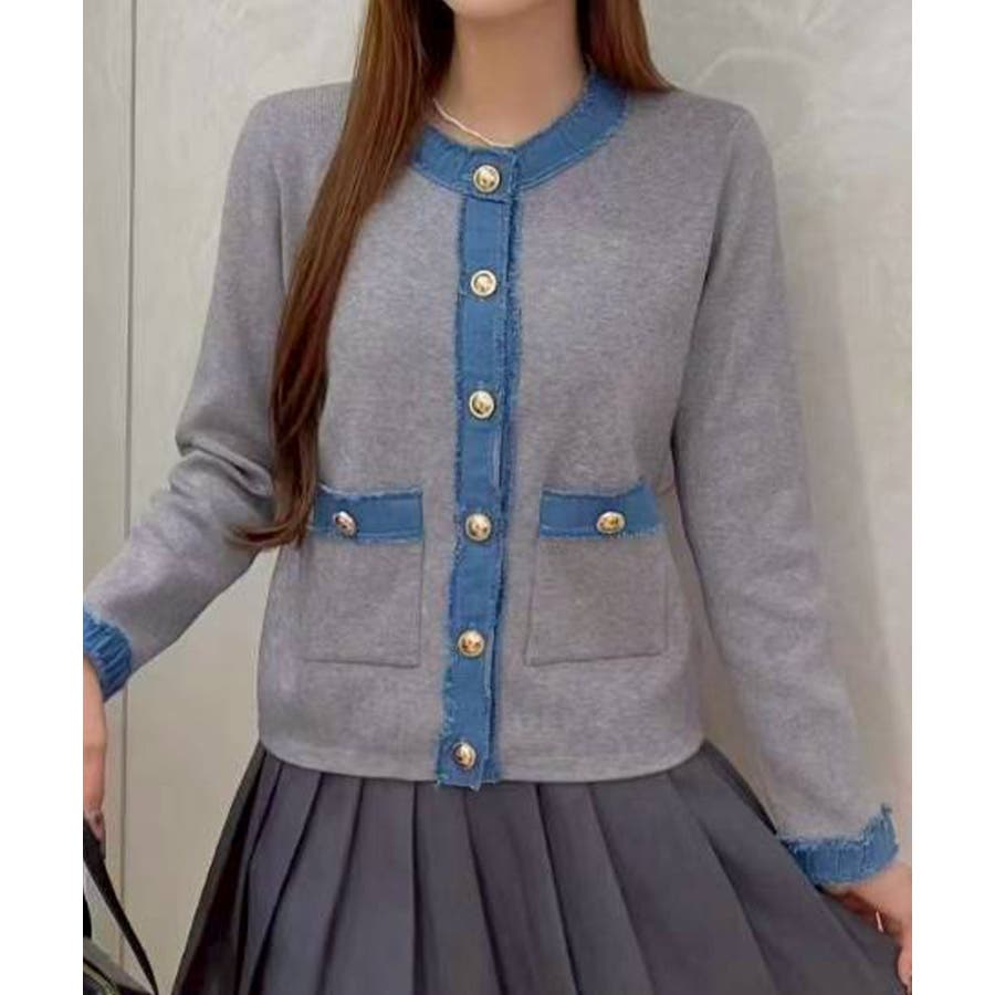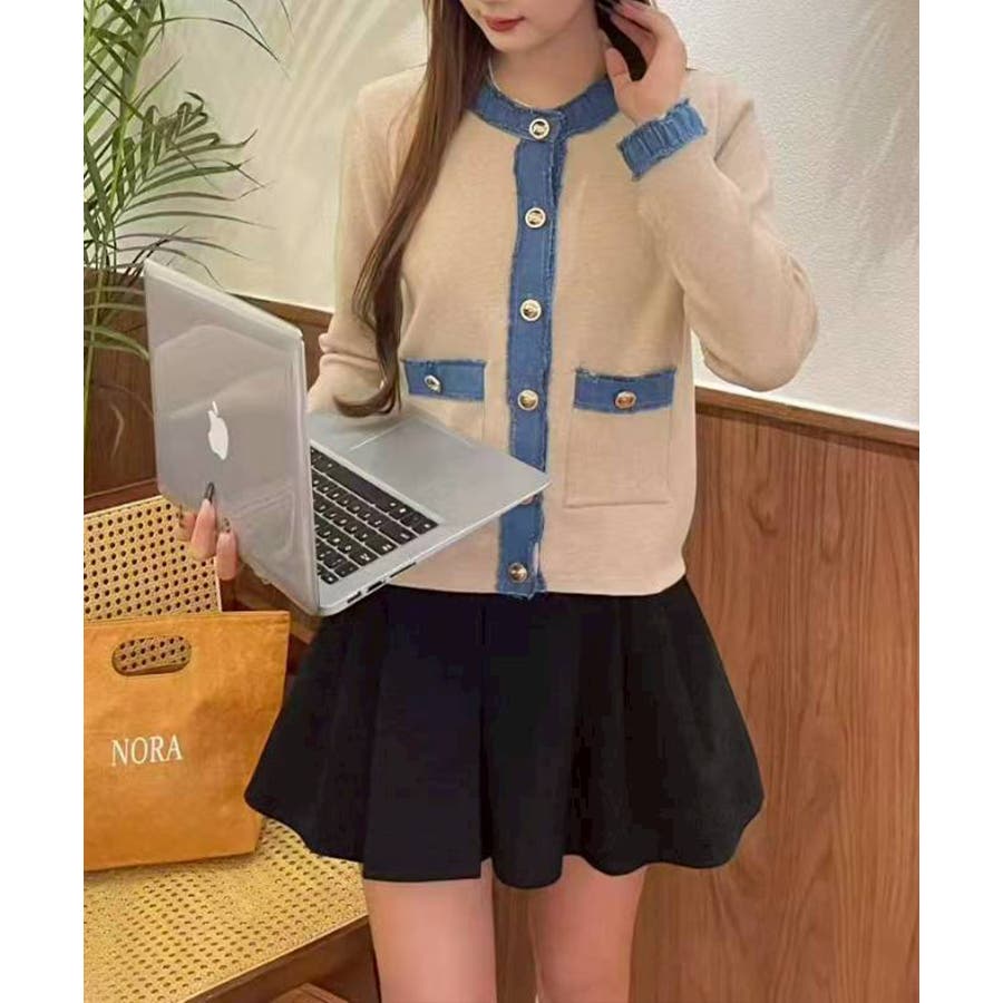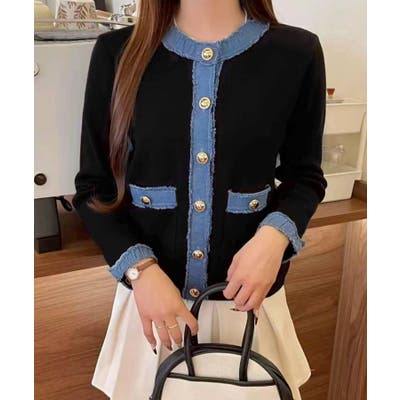 ノーカラーデザインにデニム切り替えを施した、程よくカジュアル感のあるカーディガン。