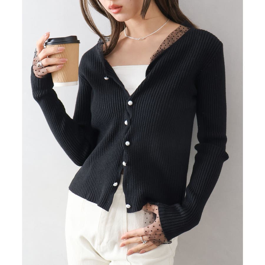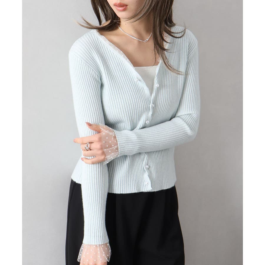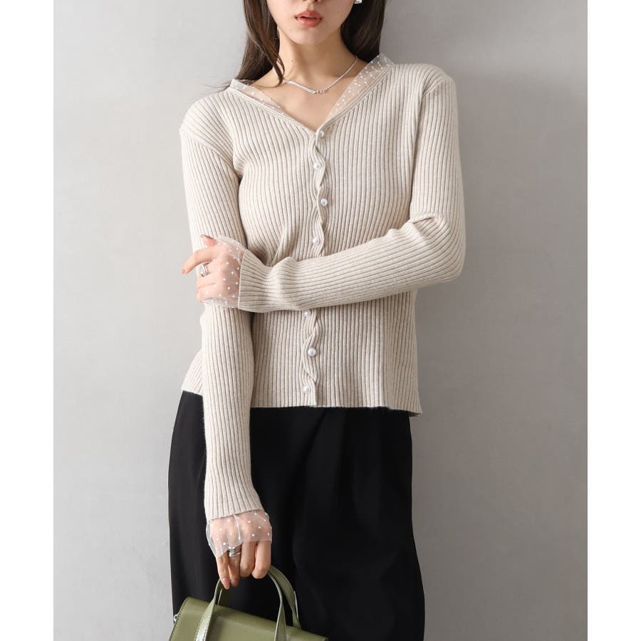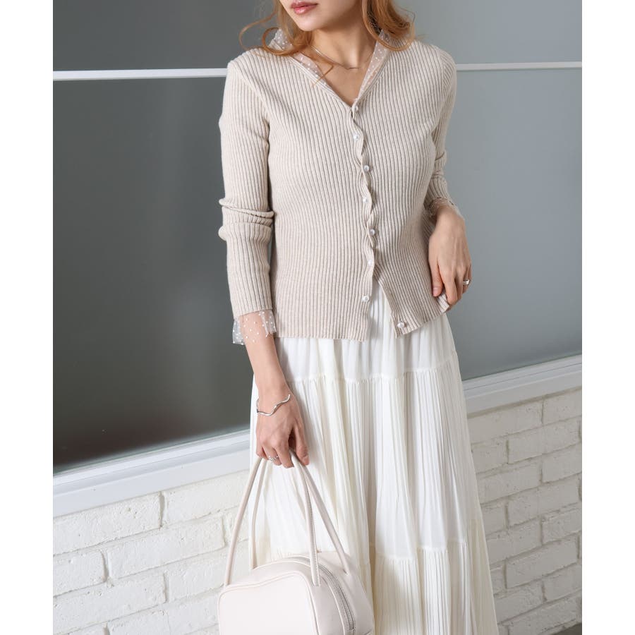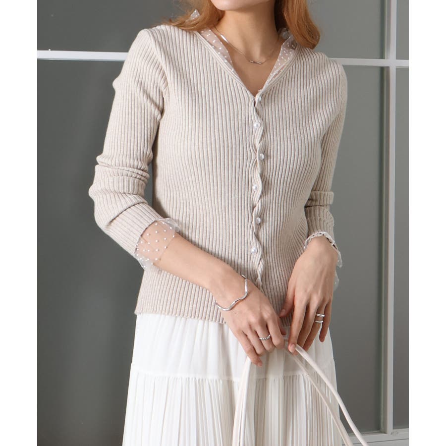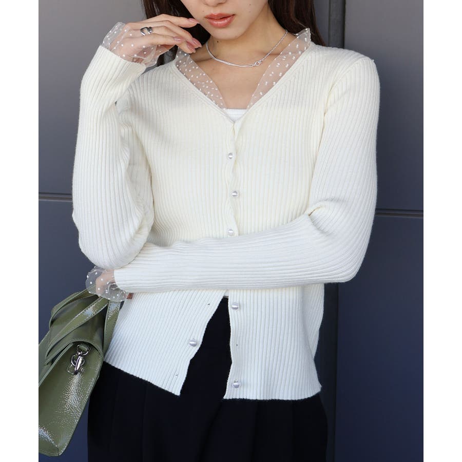 細めのリブ編みニットに、ドット柄チュールを重ねたフェミニンムード漂うカーディガン。