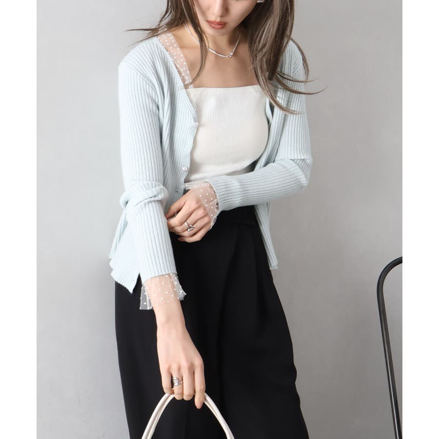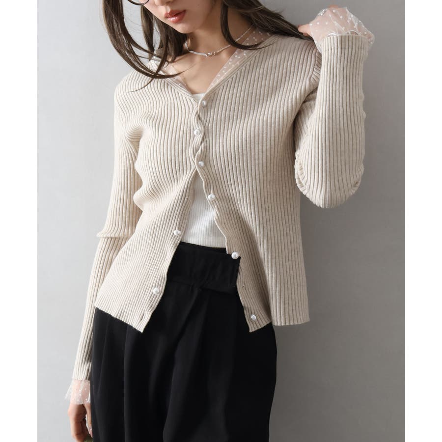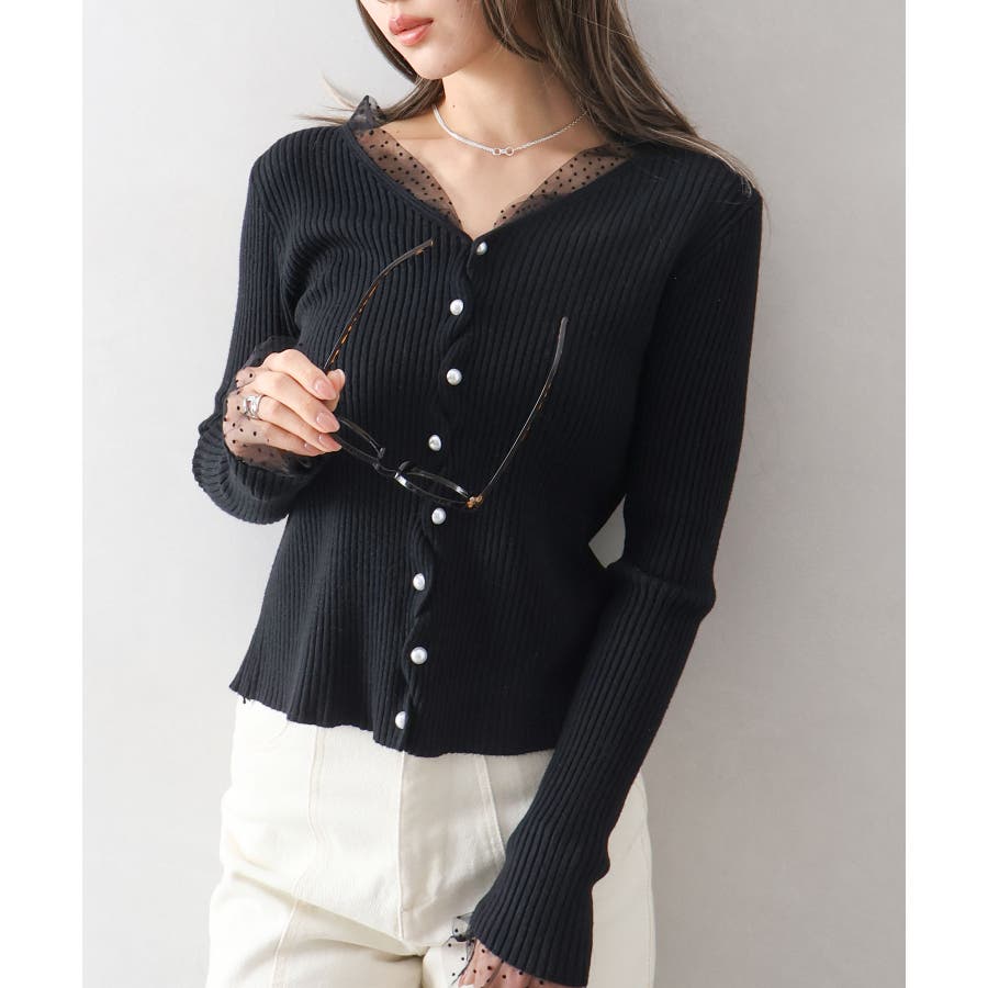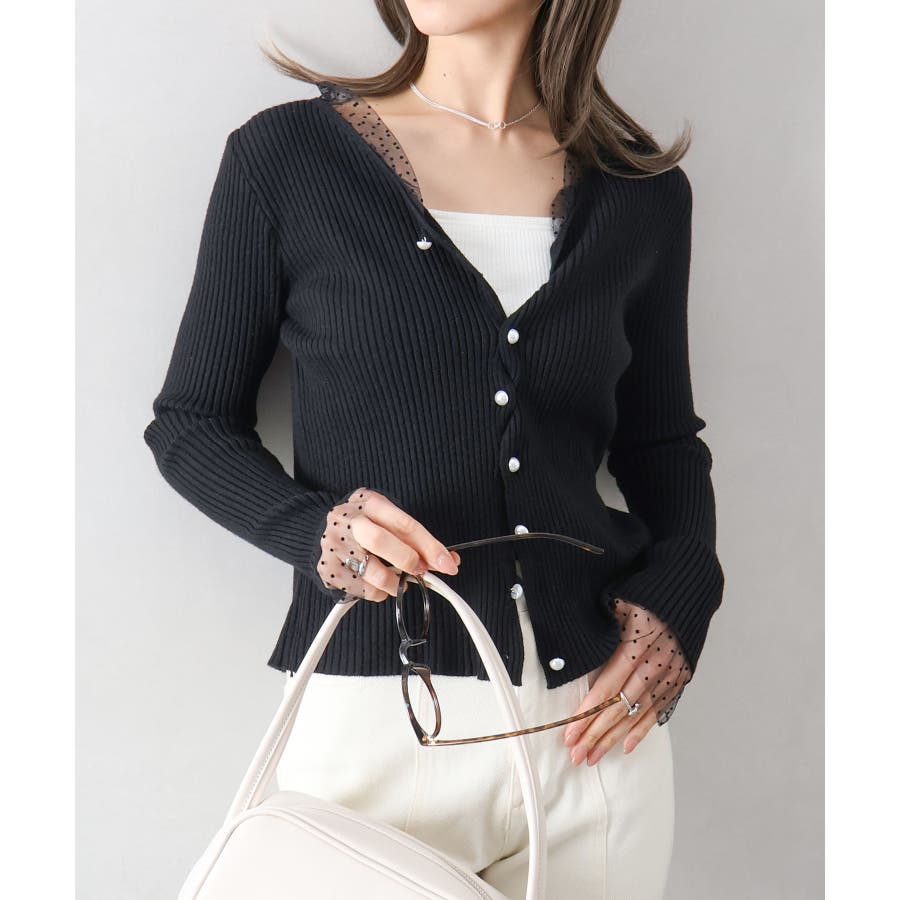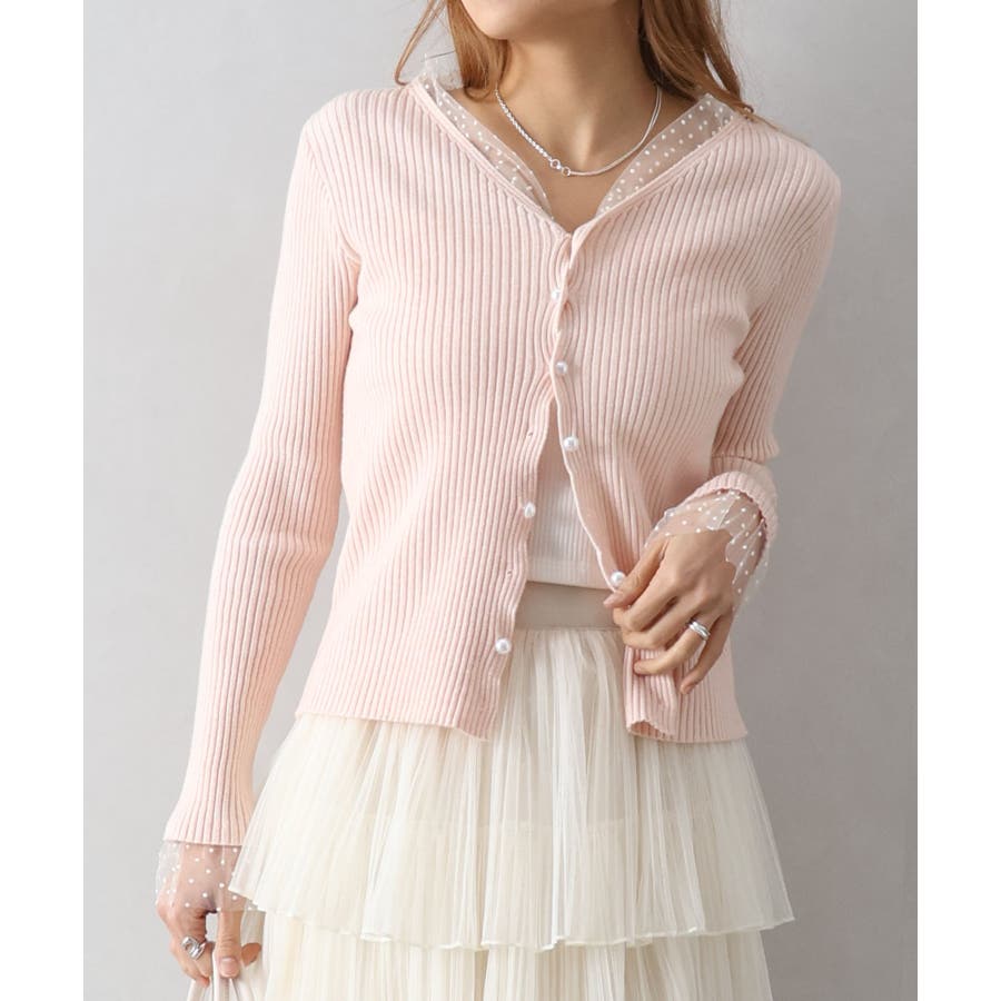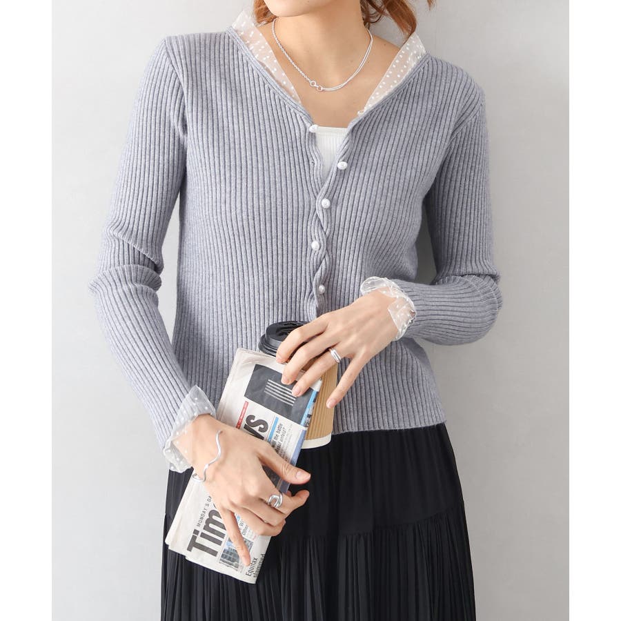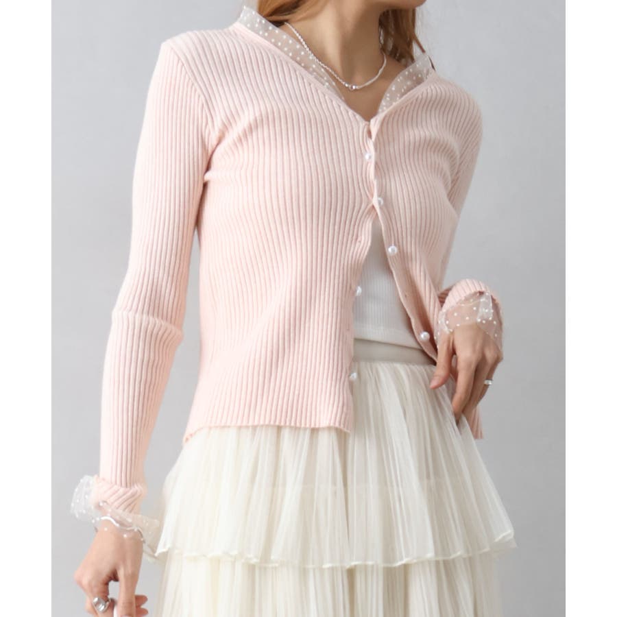 細めのリブ編みニットに、ドット柄チュールを重ねたフェミニンムード漂うカーディガン。