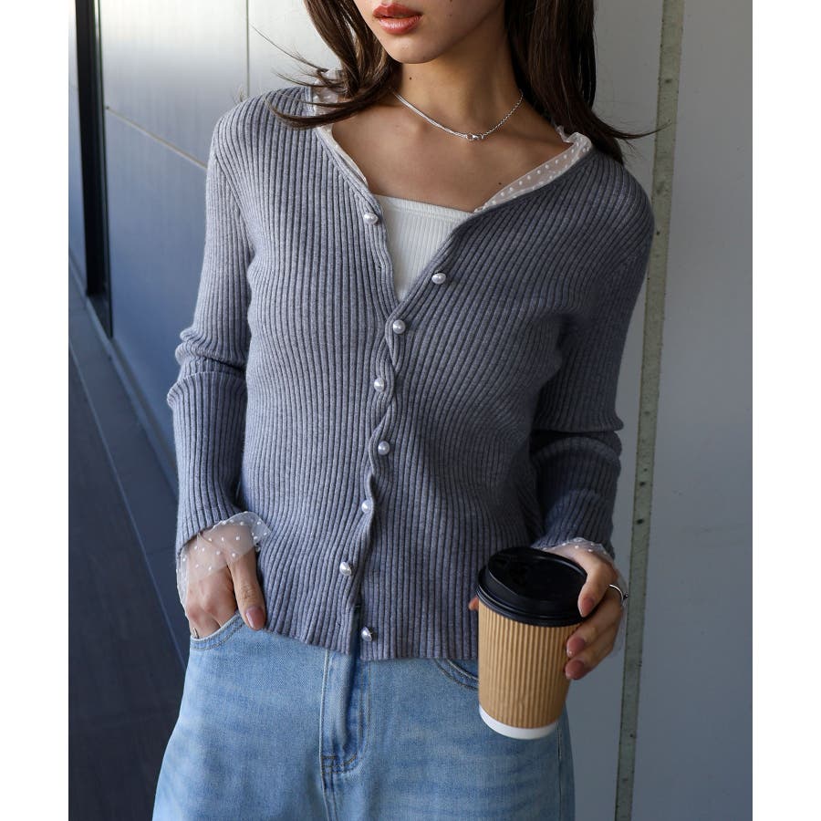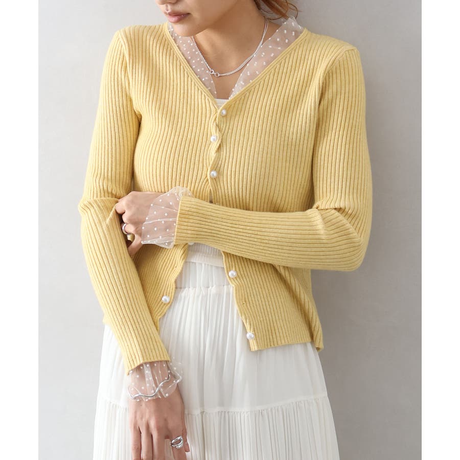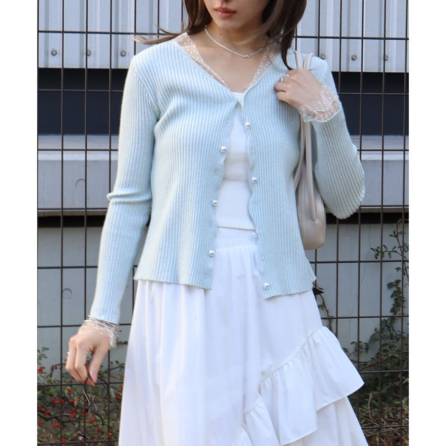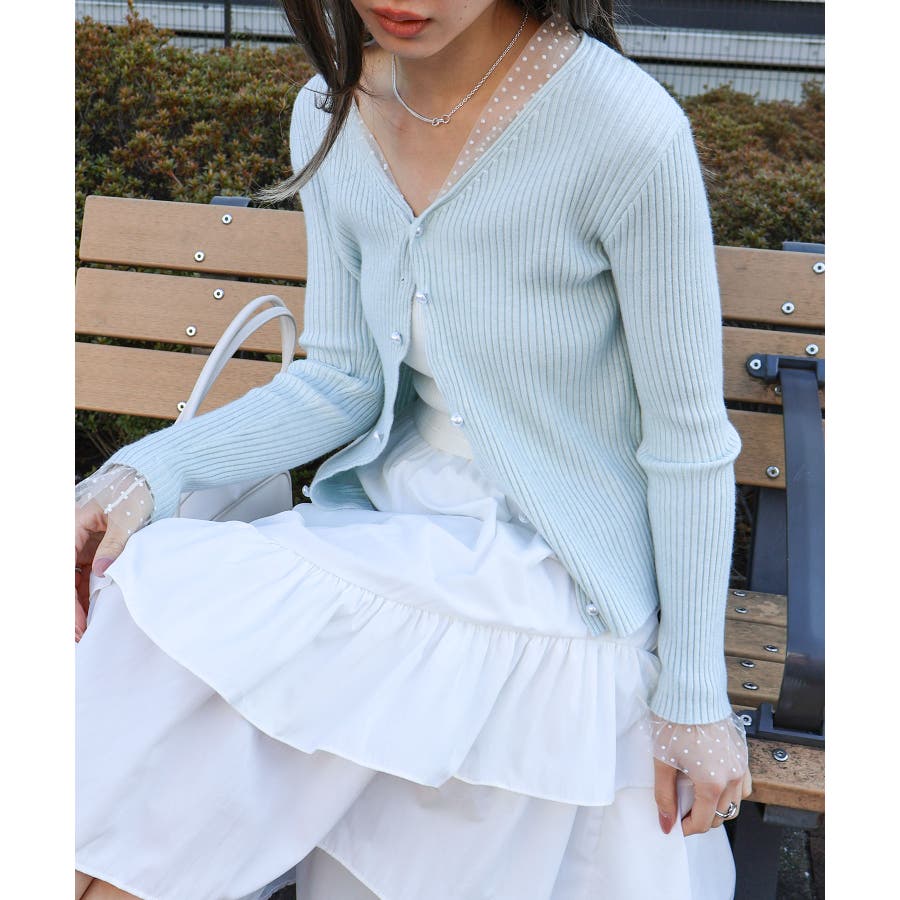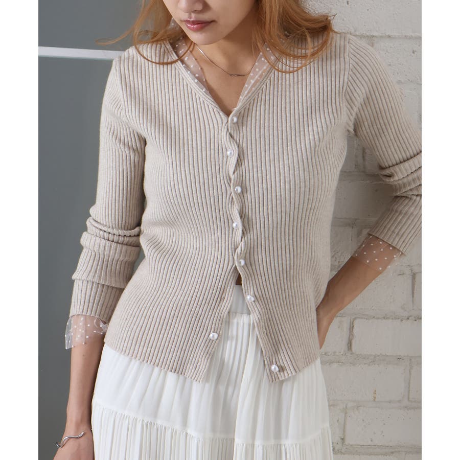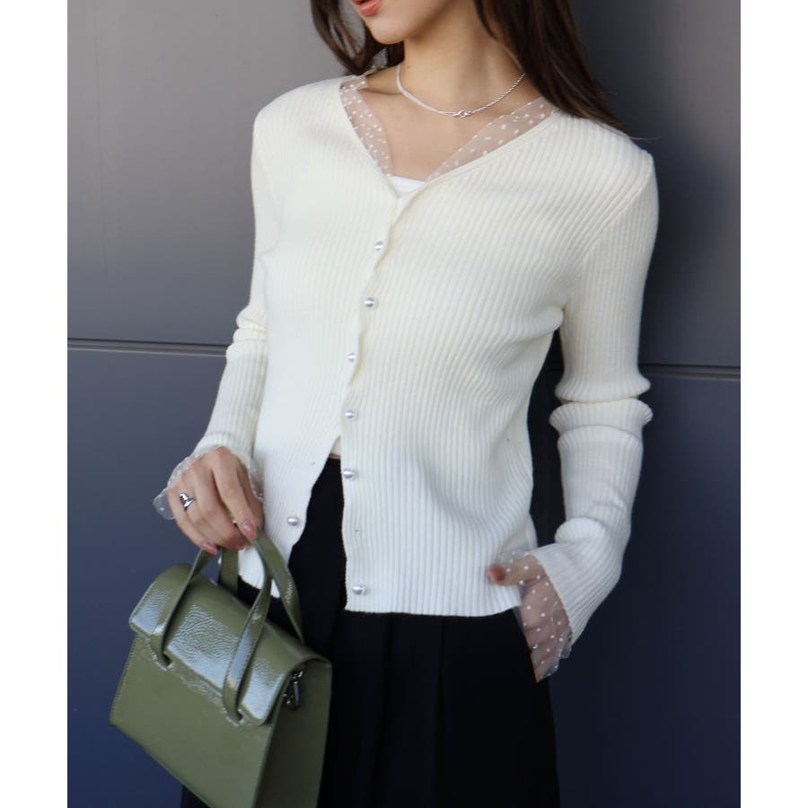 細めのリブ編みニットに、ドット柄チュールを重ねたフェミニンムード漂うカーディガン。