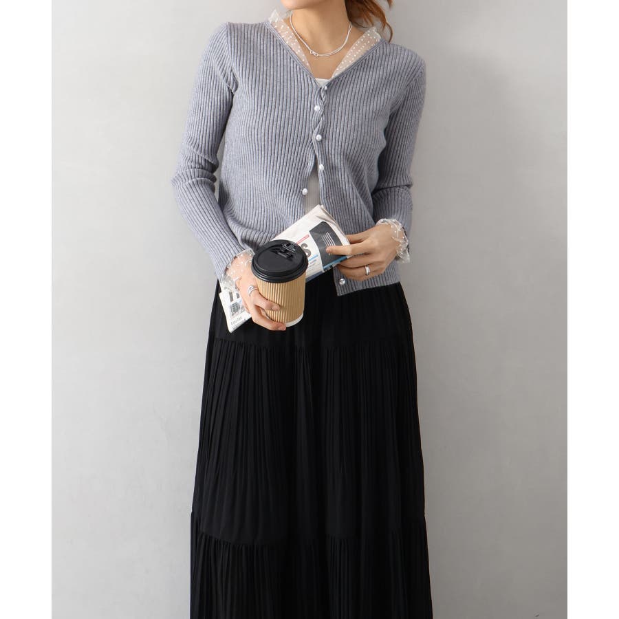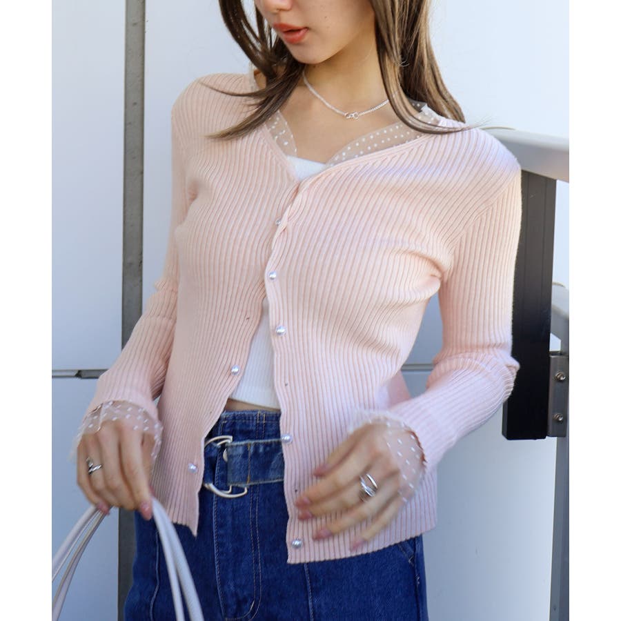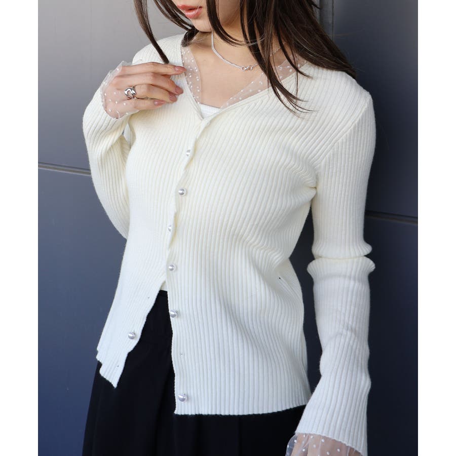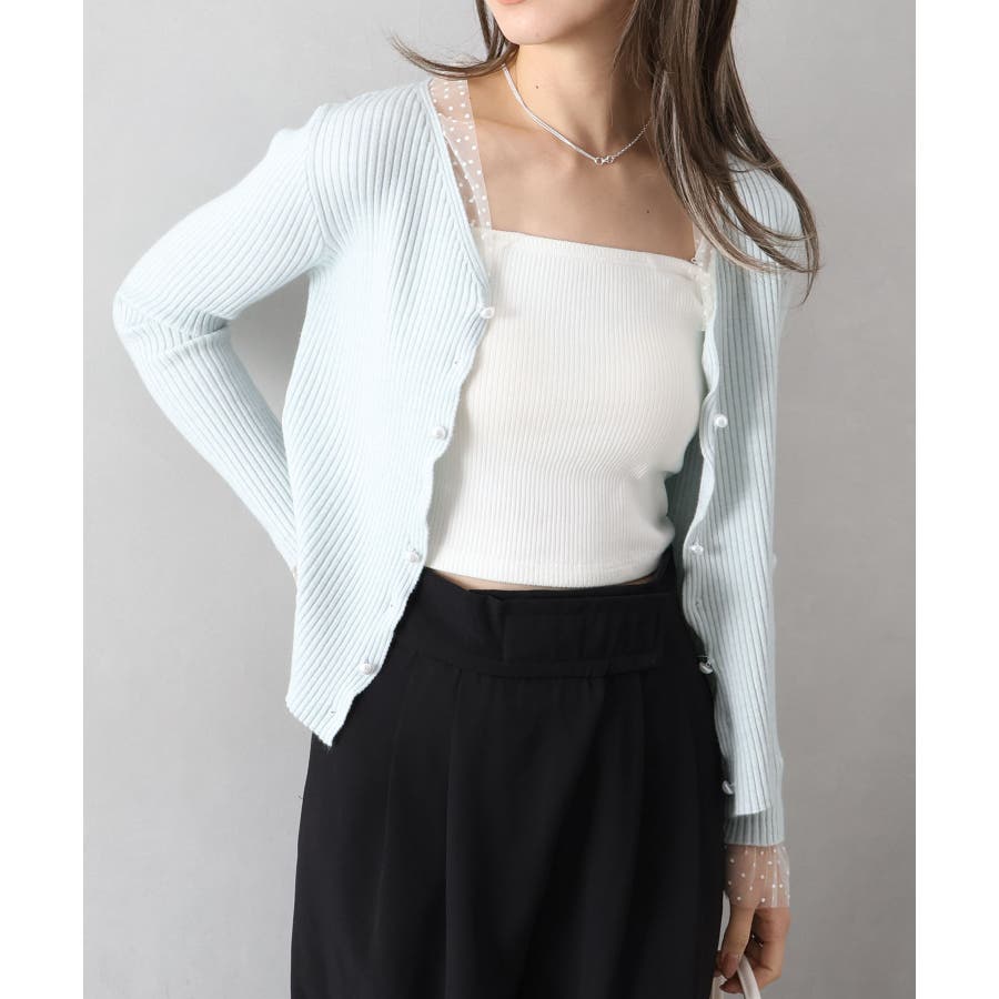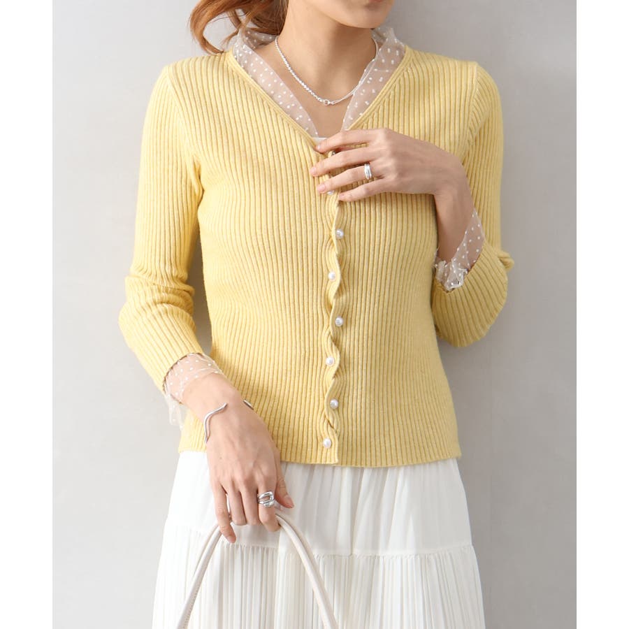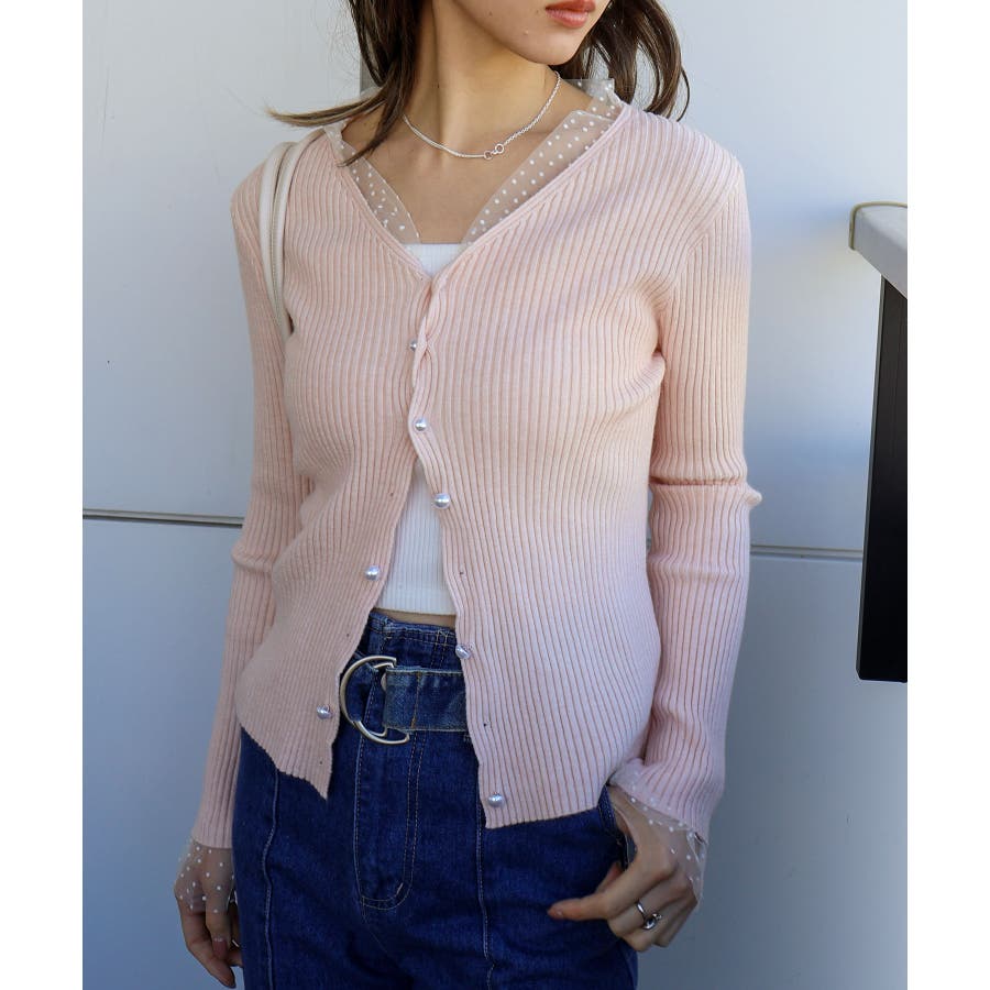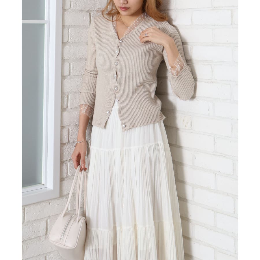 細めのリブ編みニットに、ドット柄チュールを重ねたフェミニンムード漂うカーディガン。
