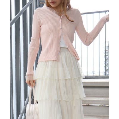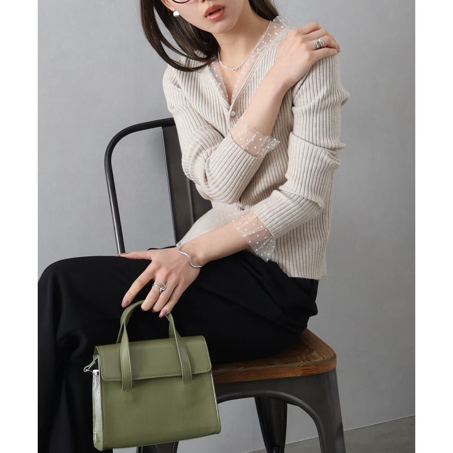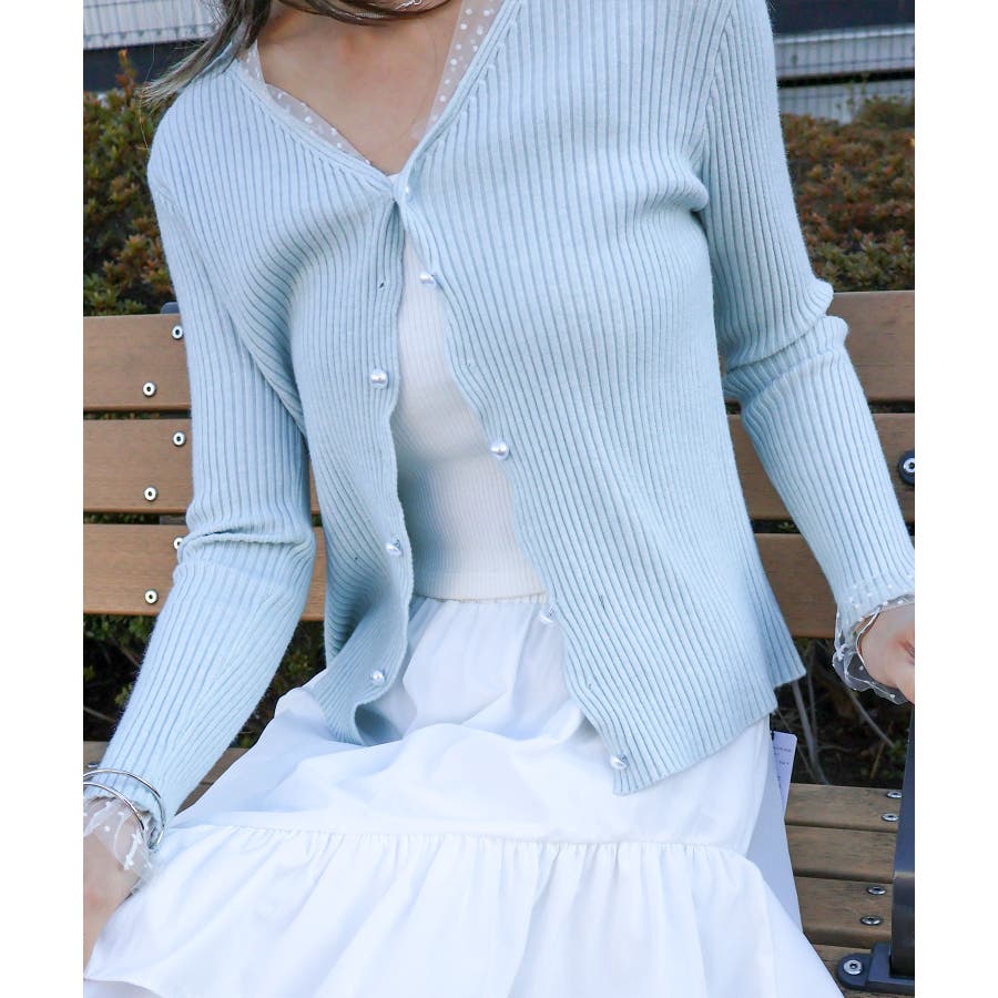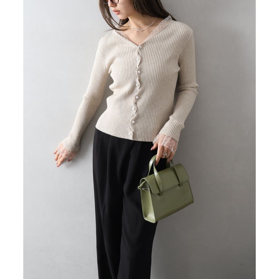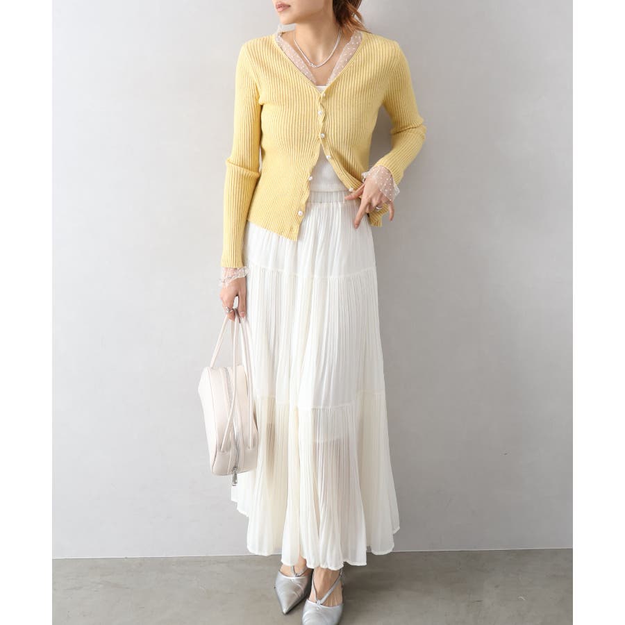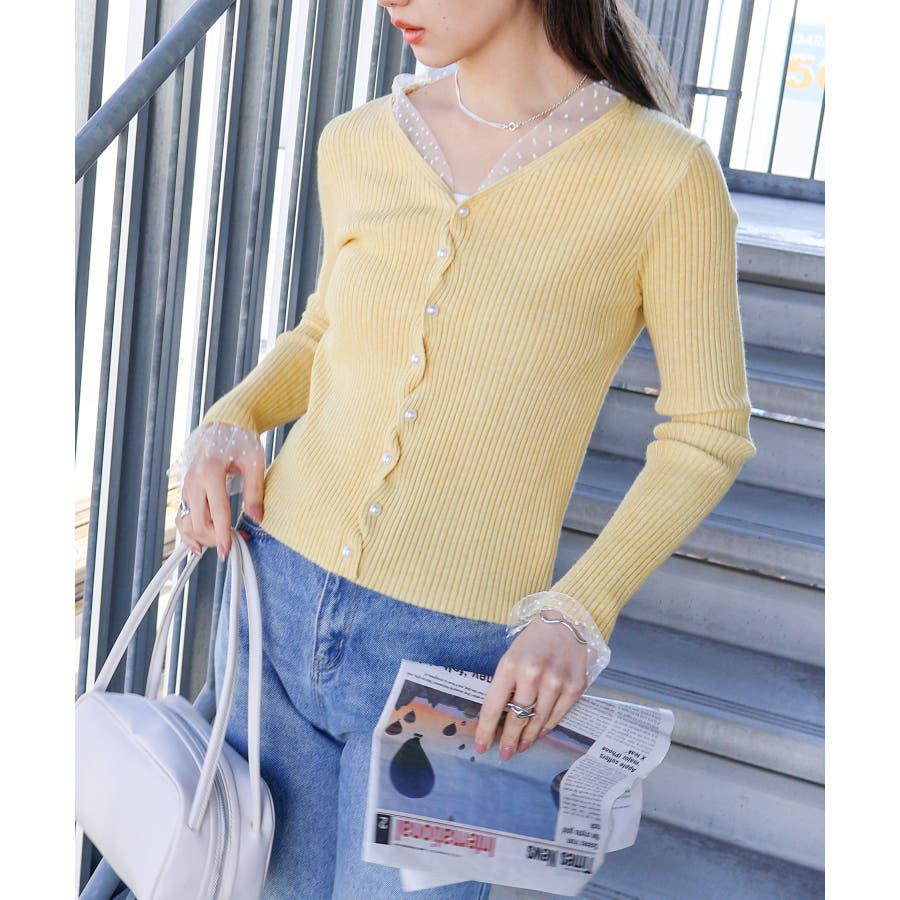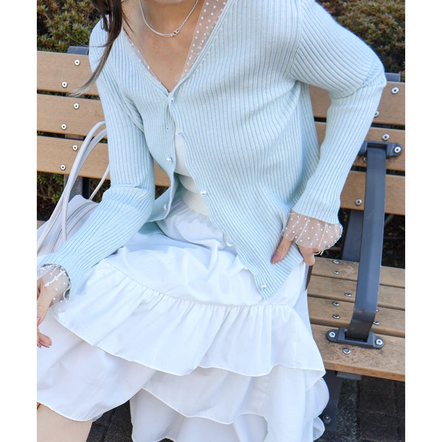 細めのリブ編みニットに、ドット柄チュールを重ねたフェミニンムード漂うカーディガン。