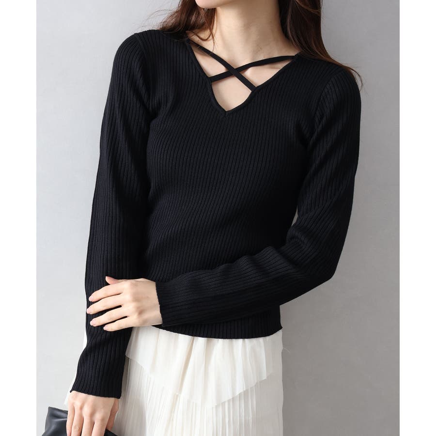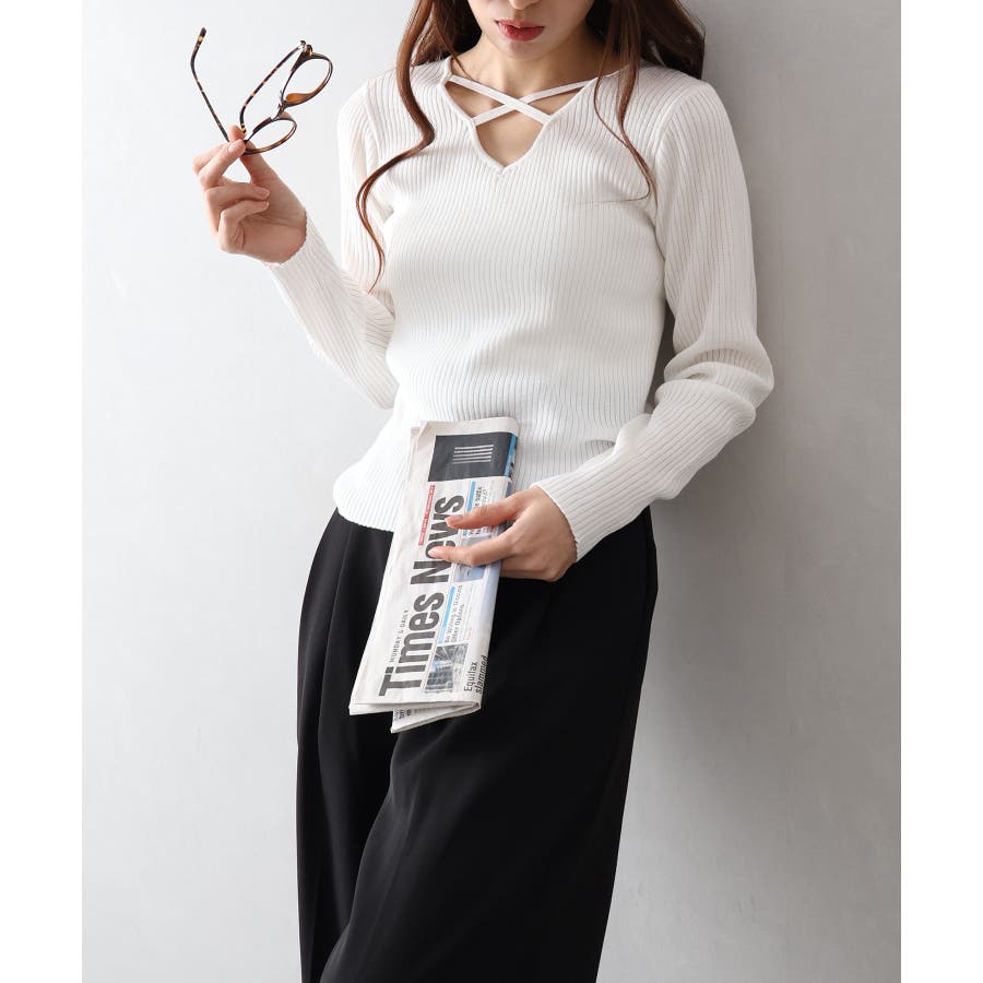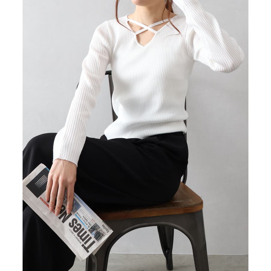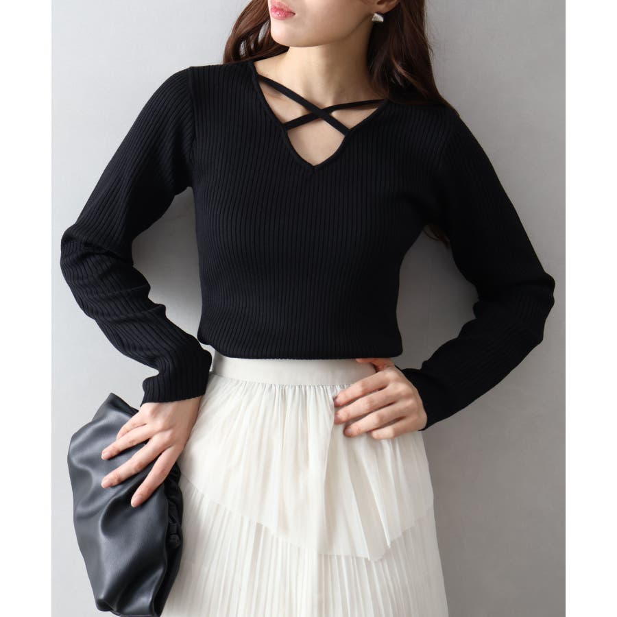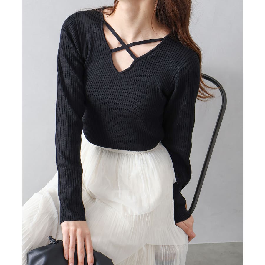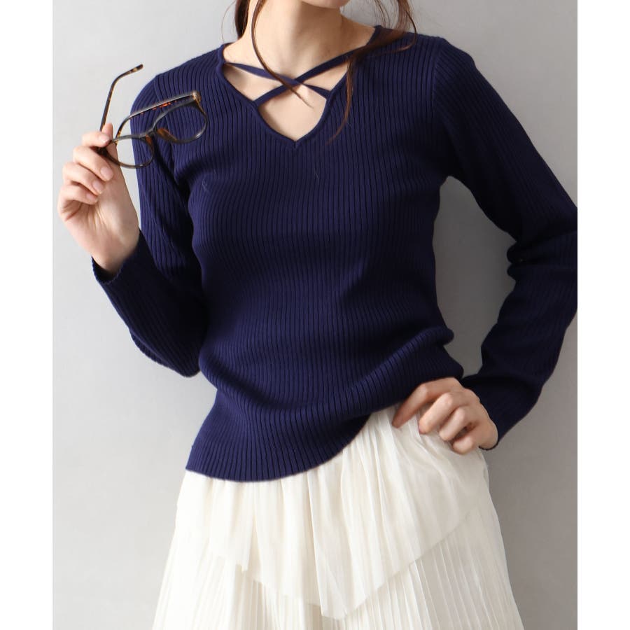 デコルテを綺麗に見せるフロントクロスデザインがポイントのリブニットトップス。
