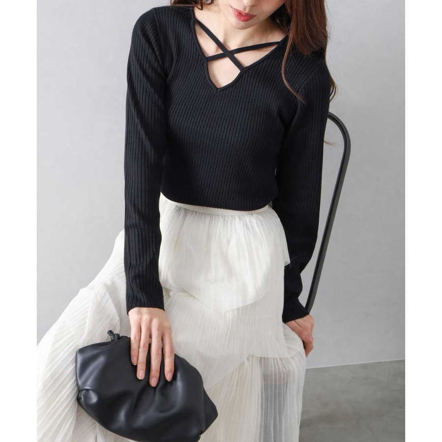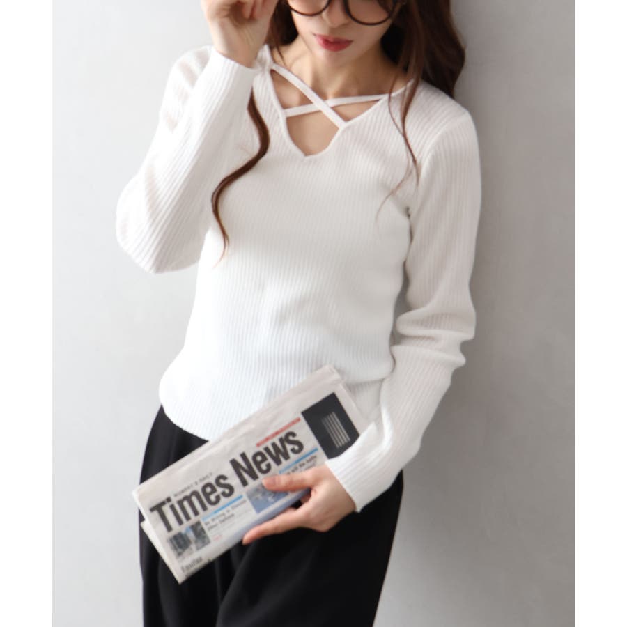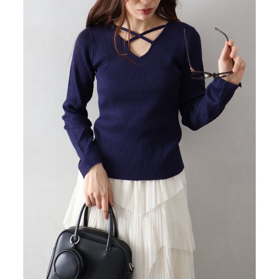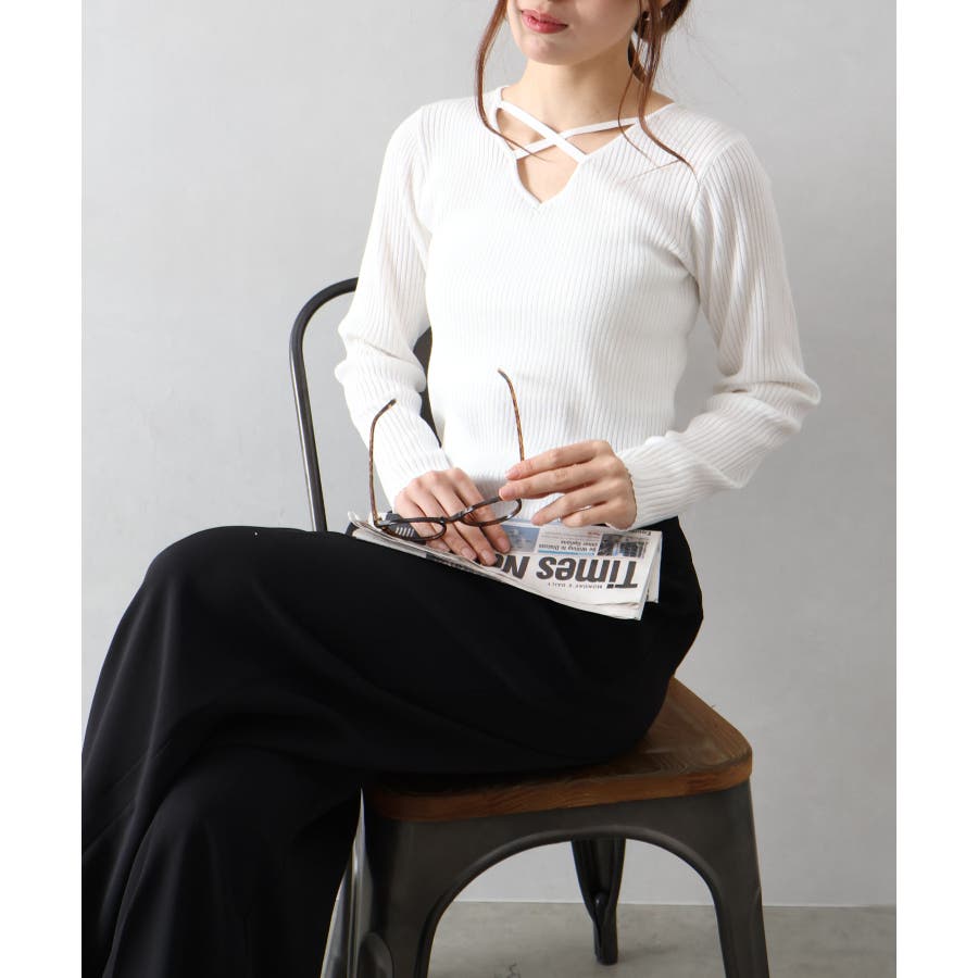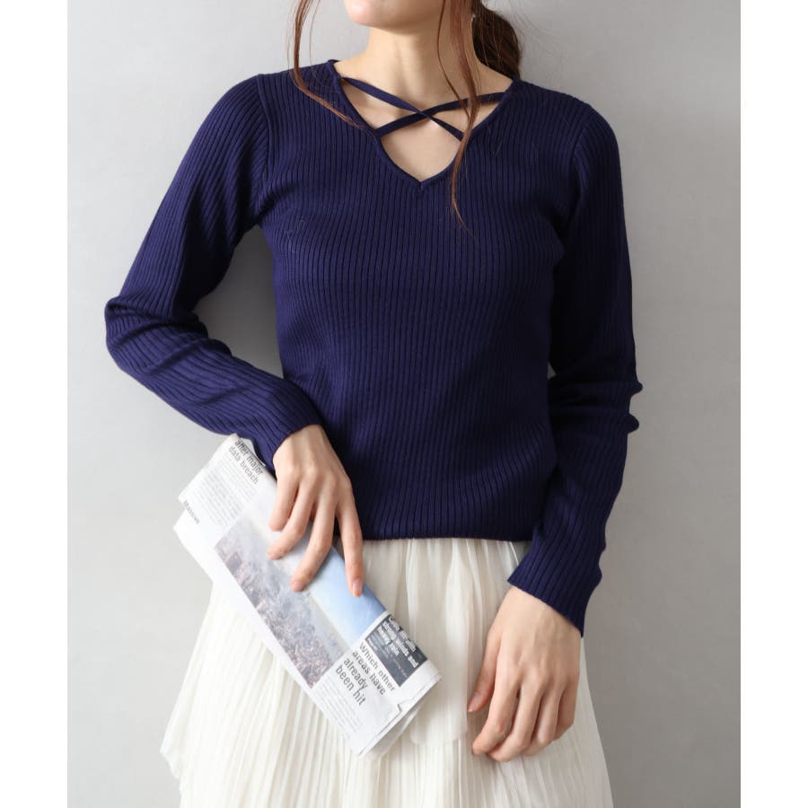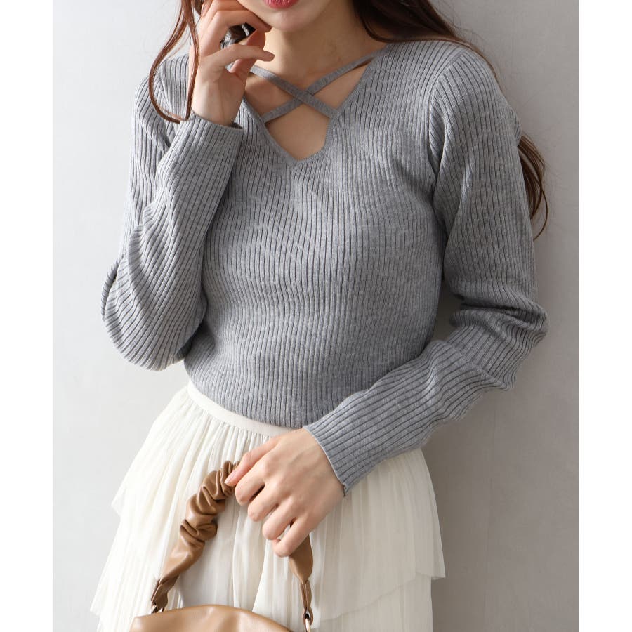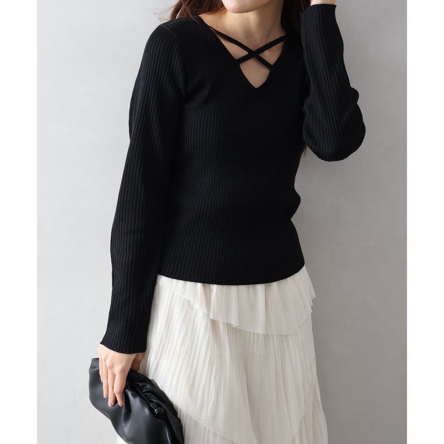 デコルテを綺麗に見せるフロントクロスデザインがポイントのリブニットトップス。