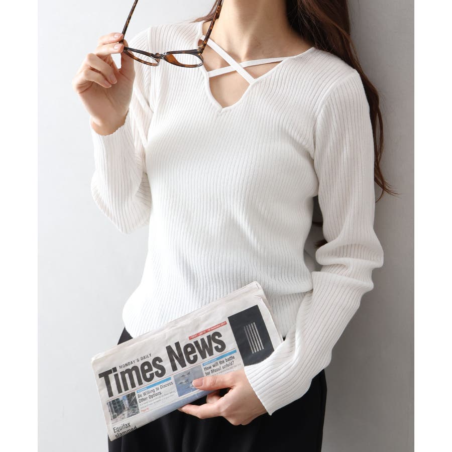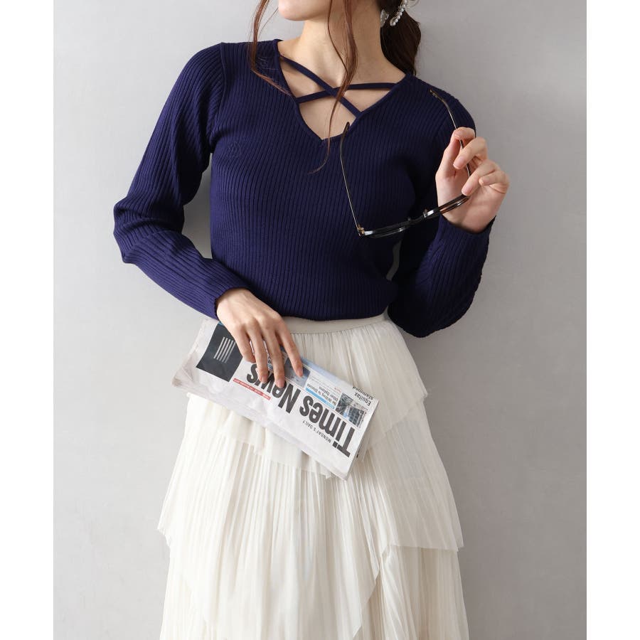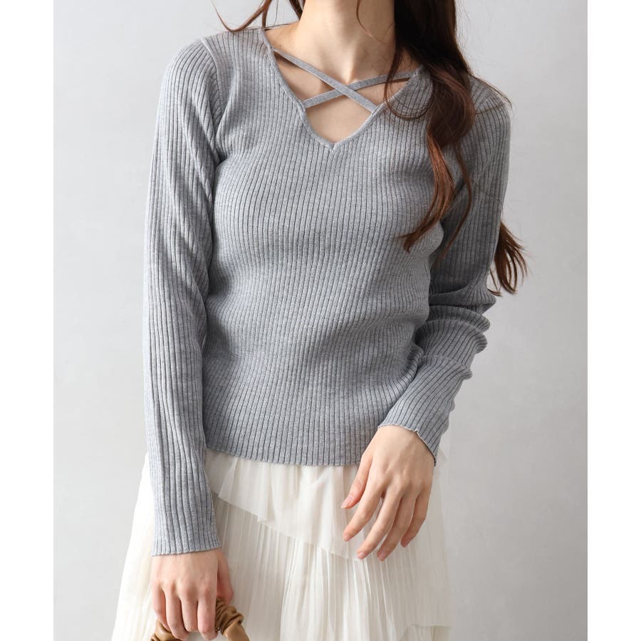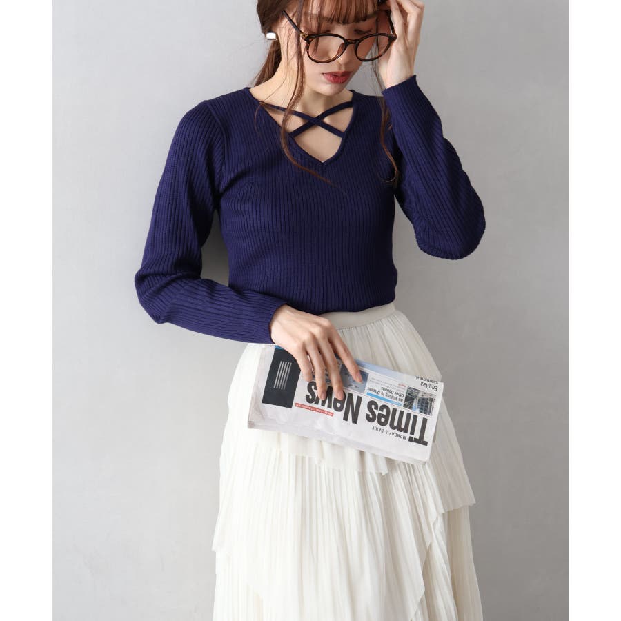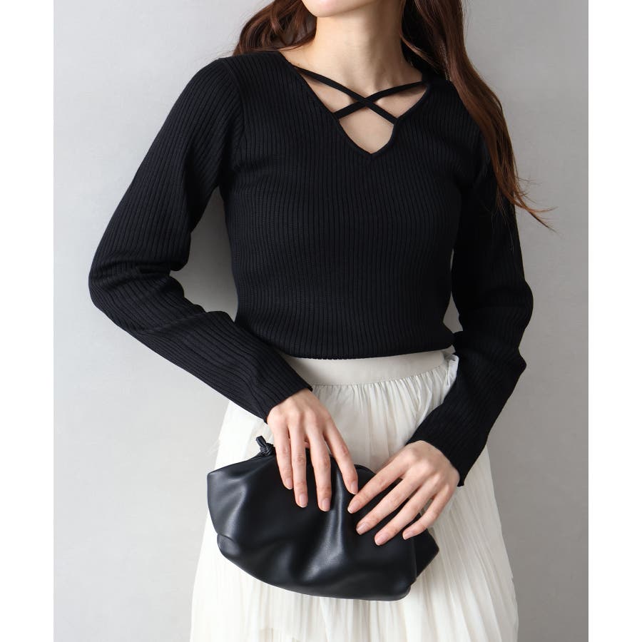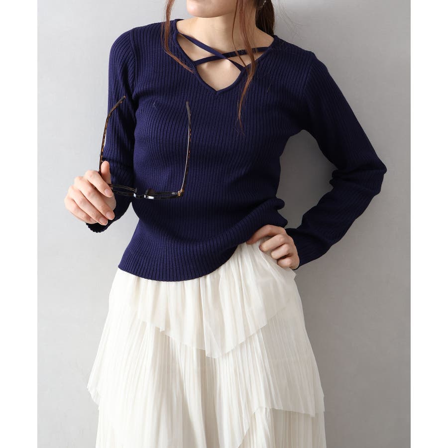 デコルテを綺麗に見せるフロントクロスデザインがポイントのリブニットトップス。