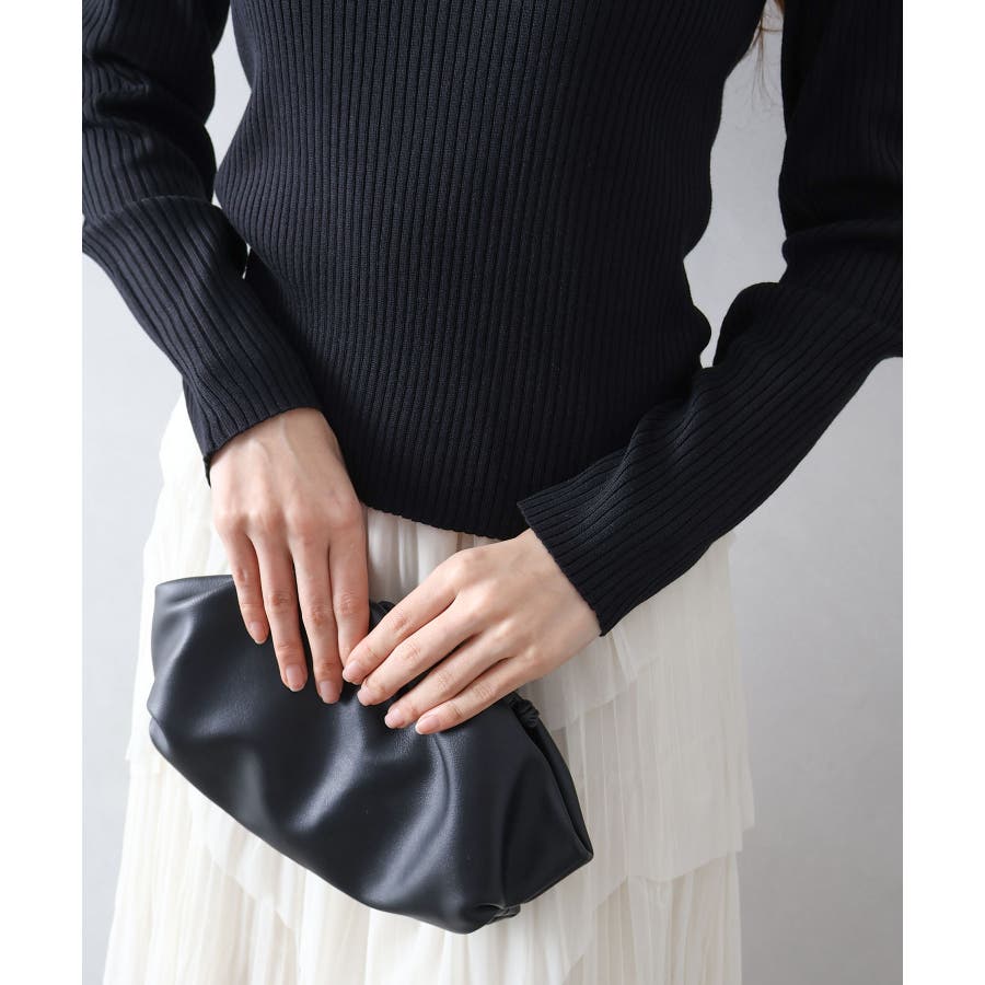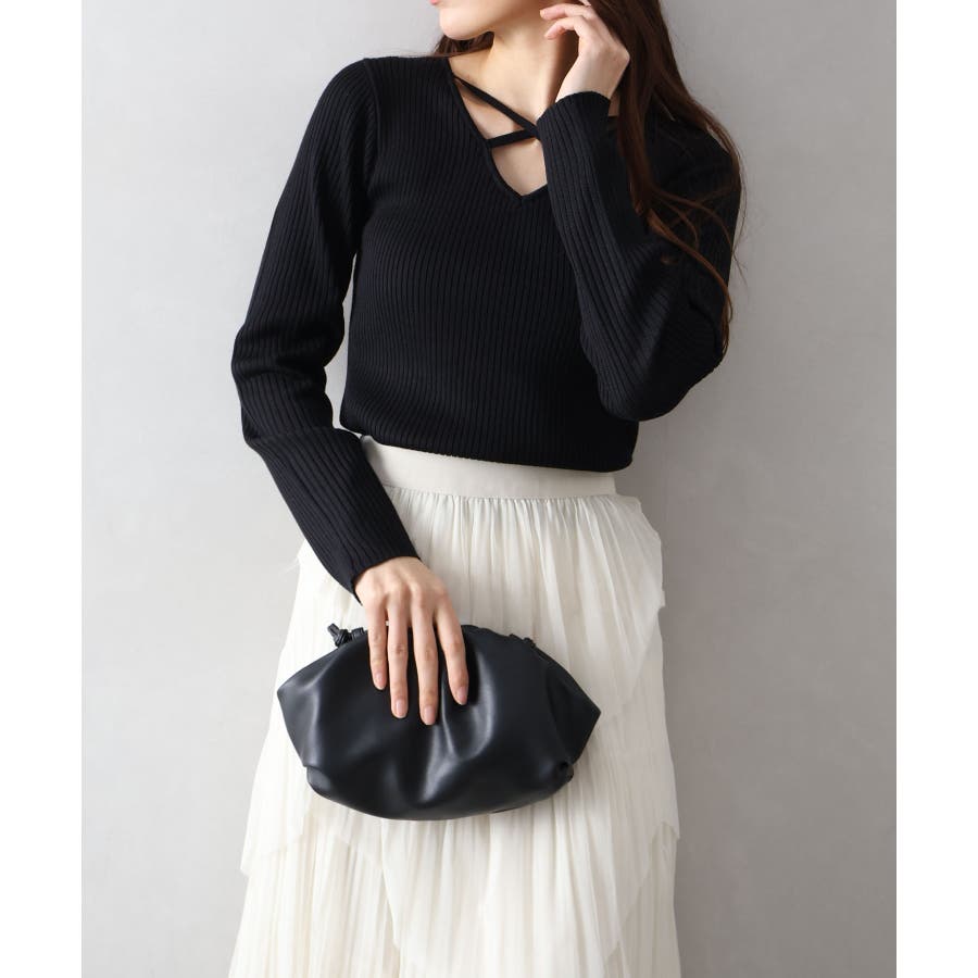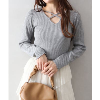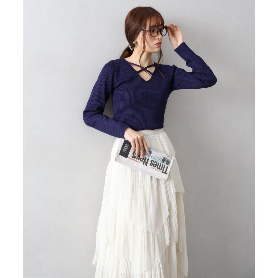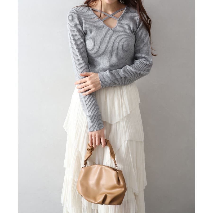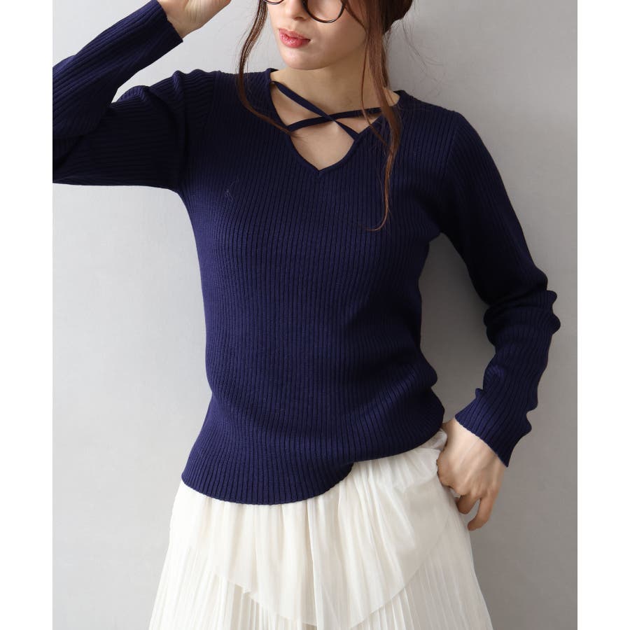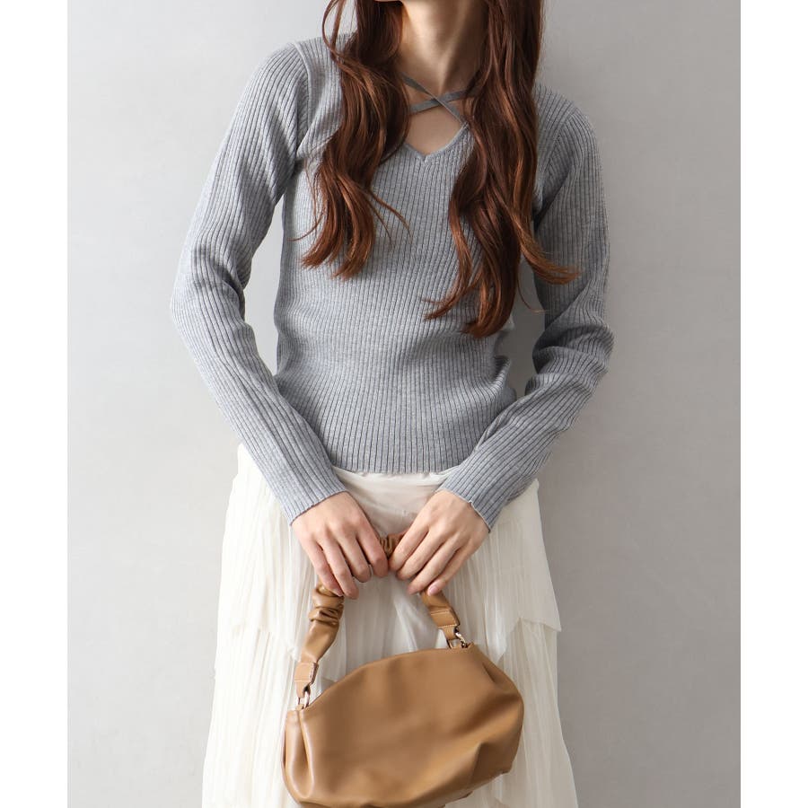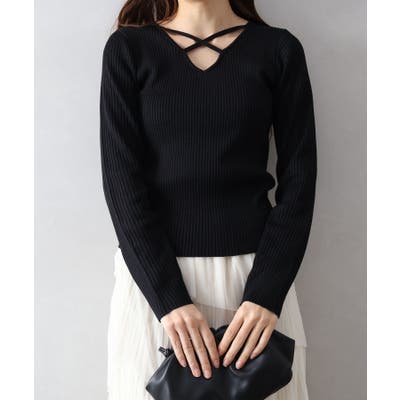 デコルテを綺麗に見せるフロントクロスデザインがポイントのリブニットトップス。