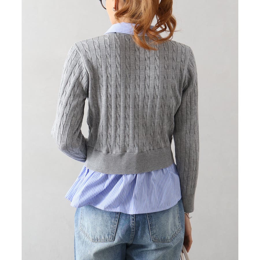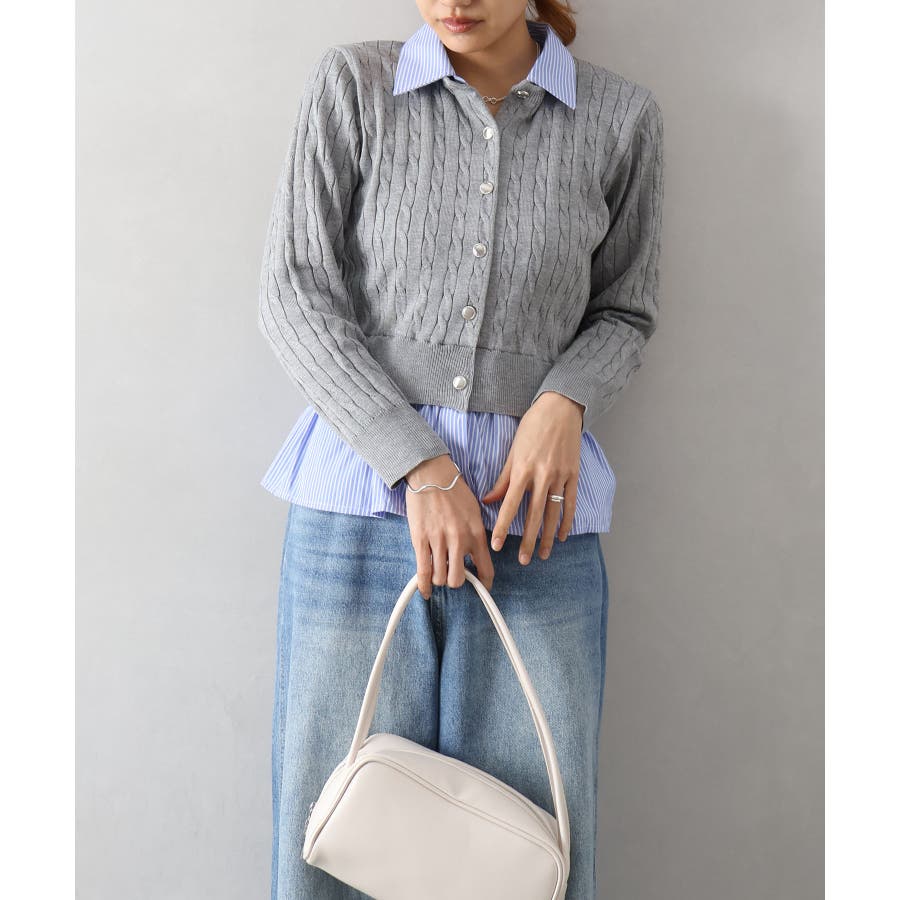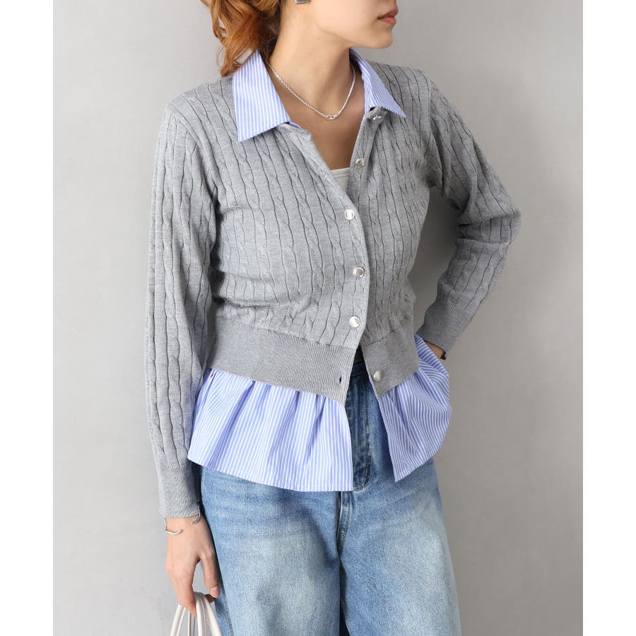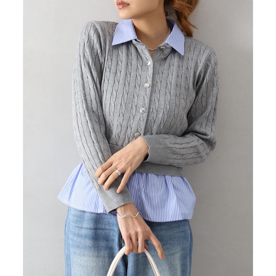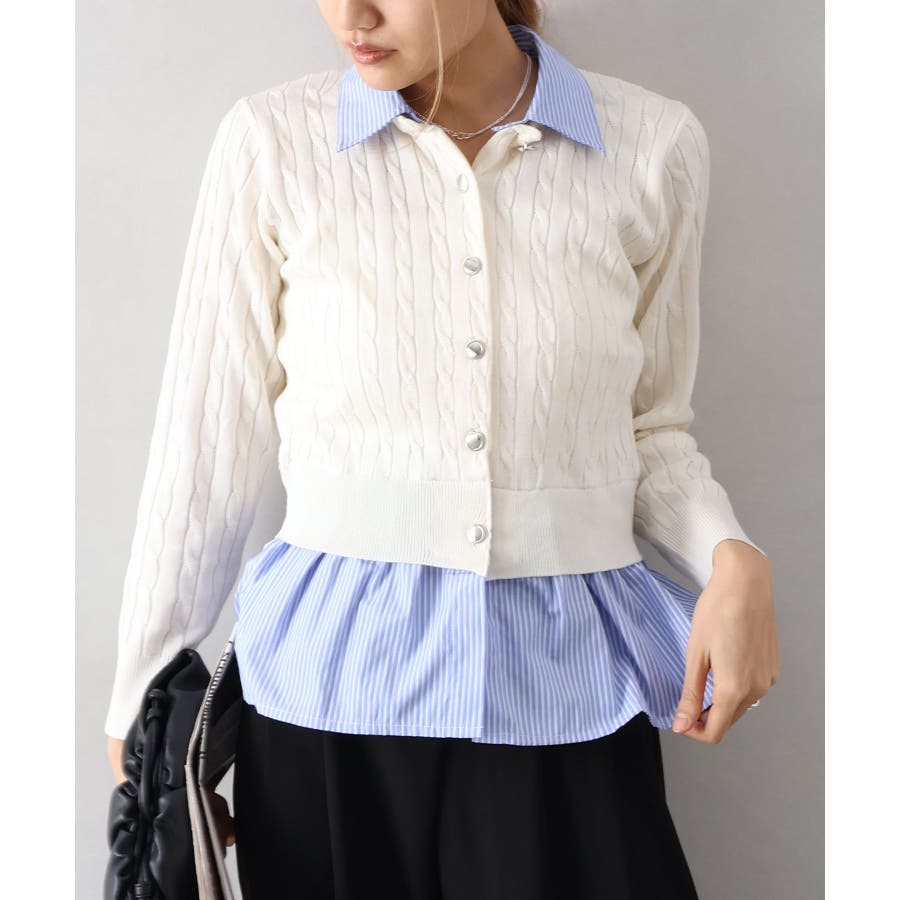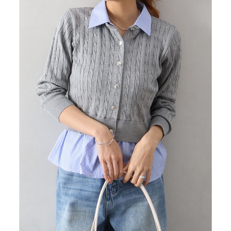 ケーブル編みニットとシャツデザインをドッキングした、1枚でレイヤードスタイルが完成するカーディガン。