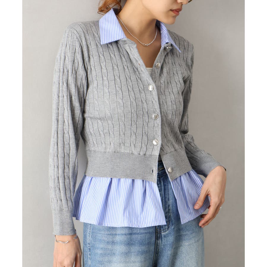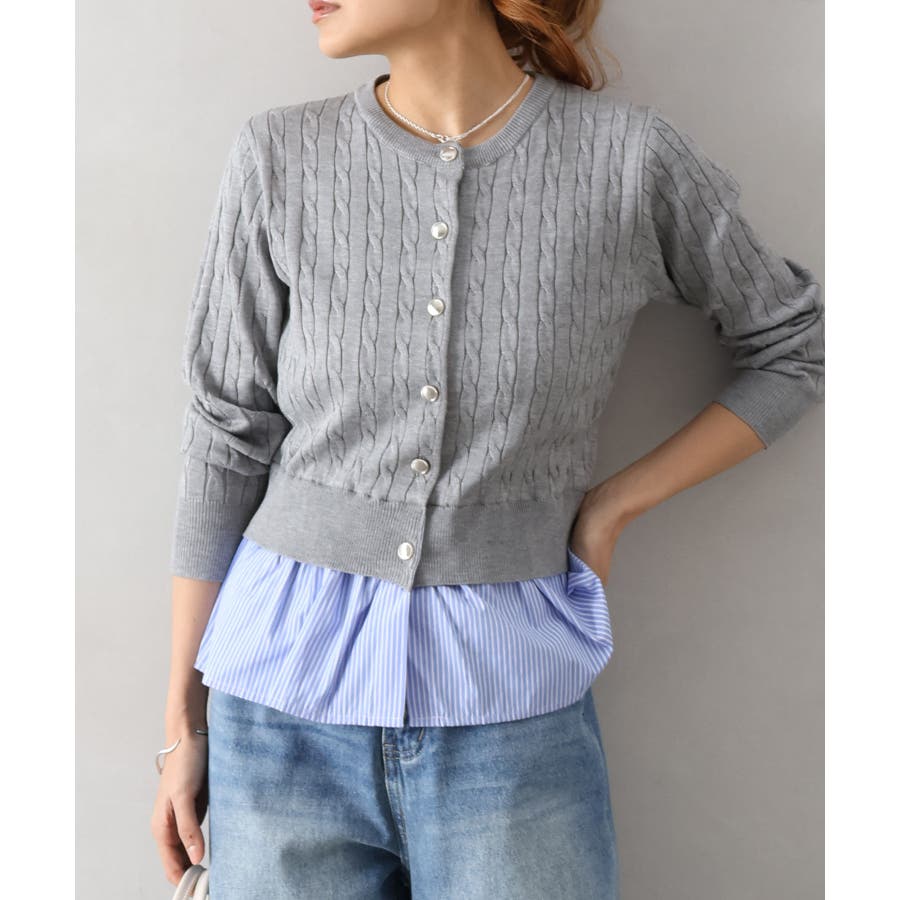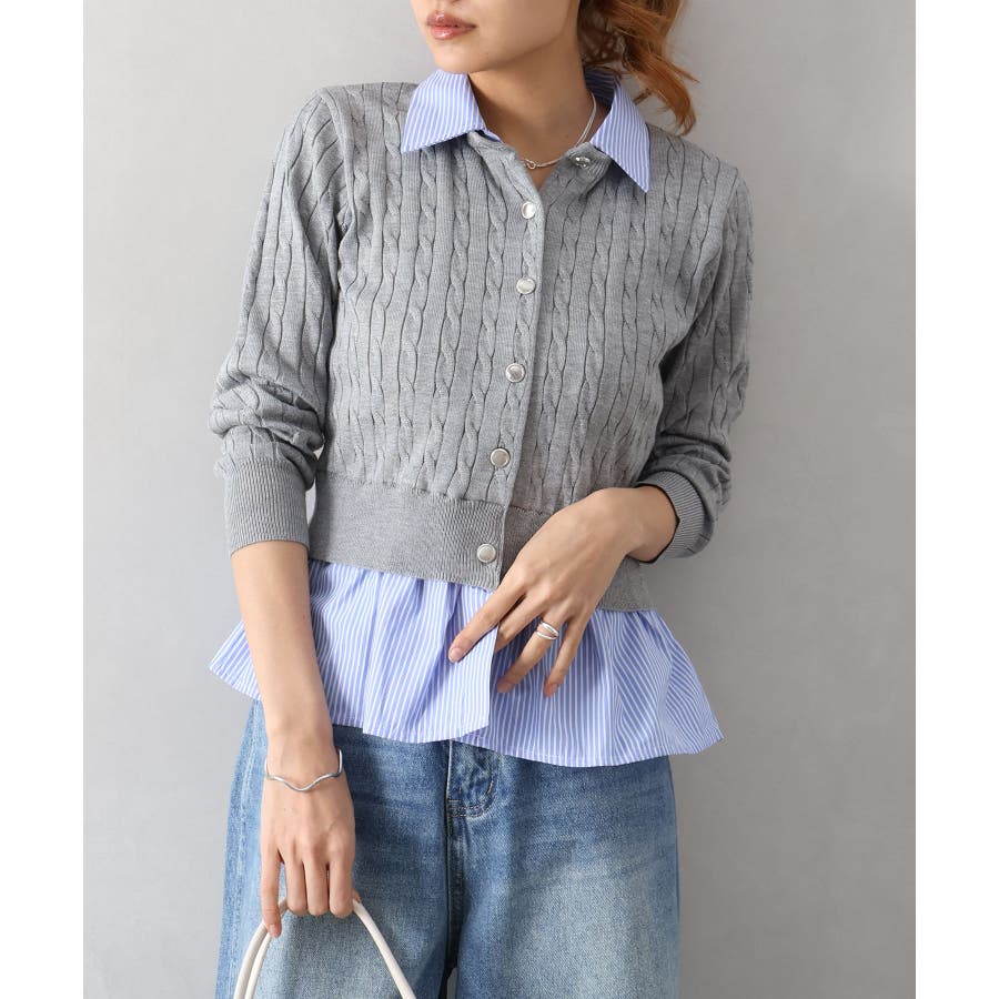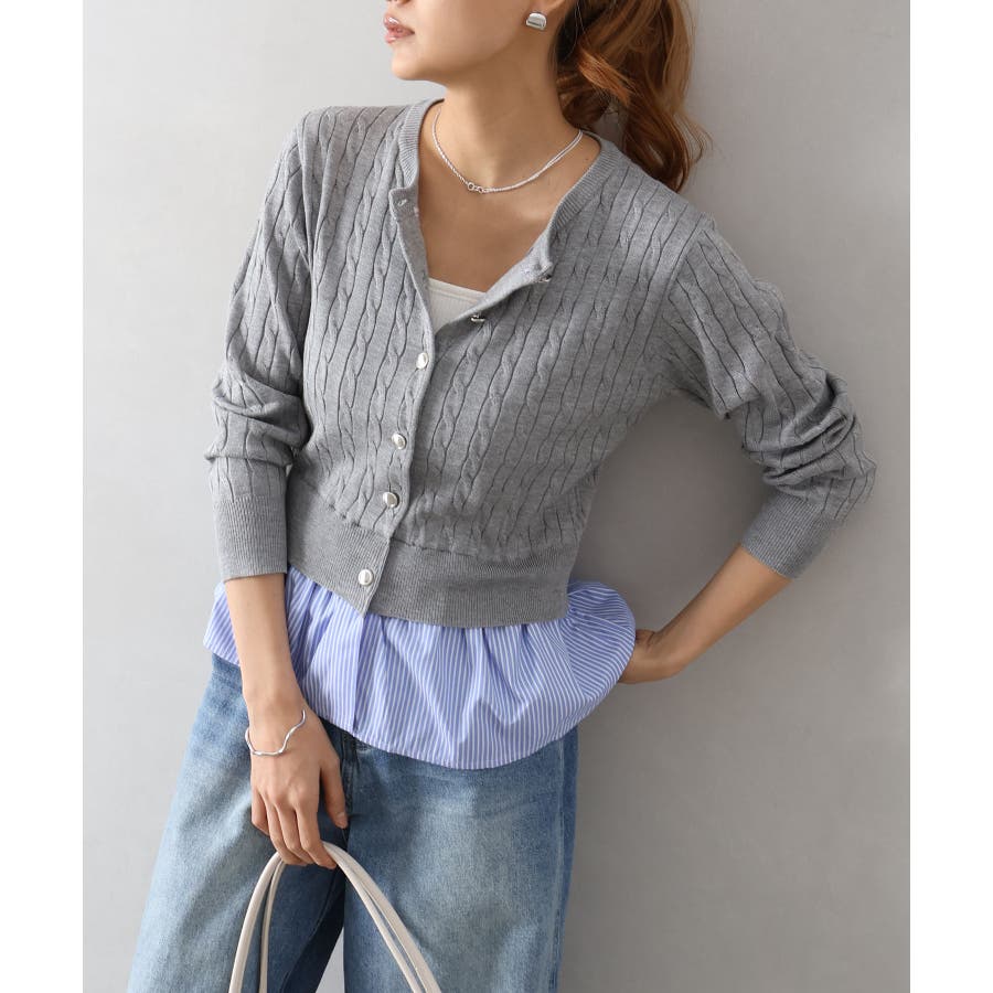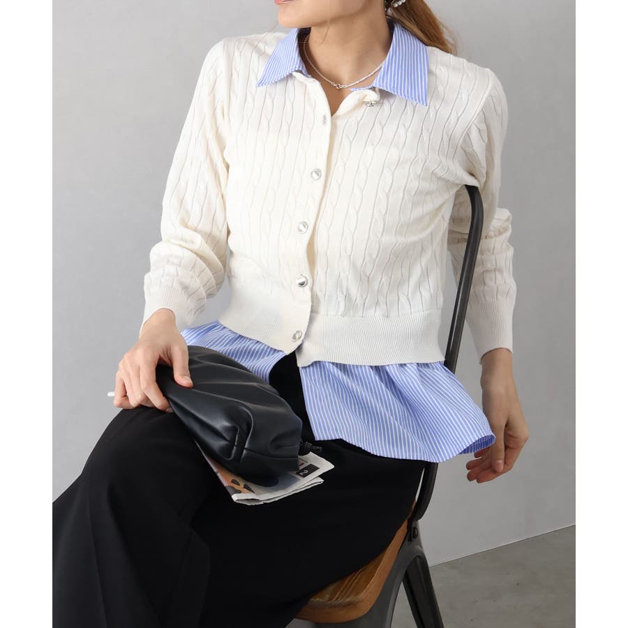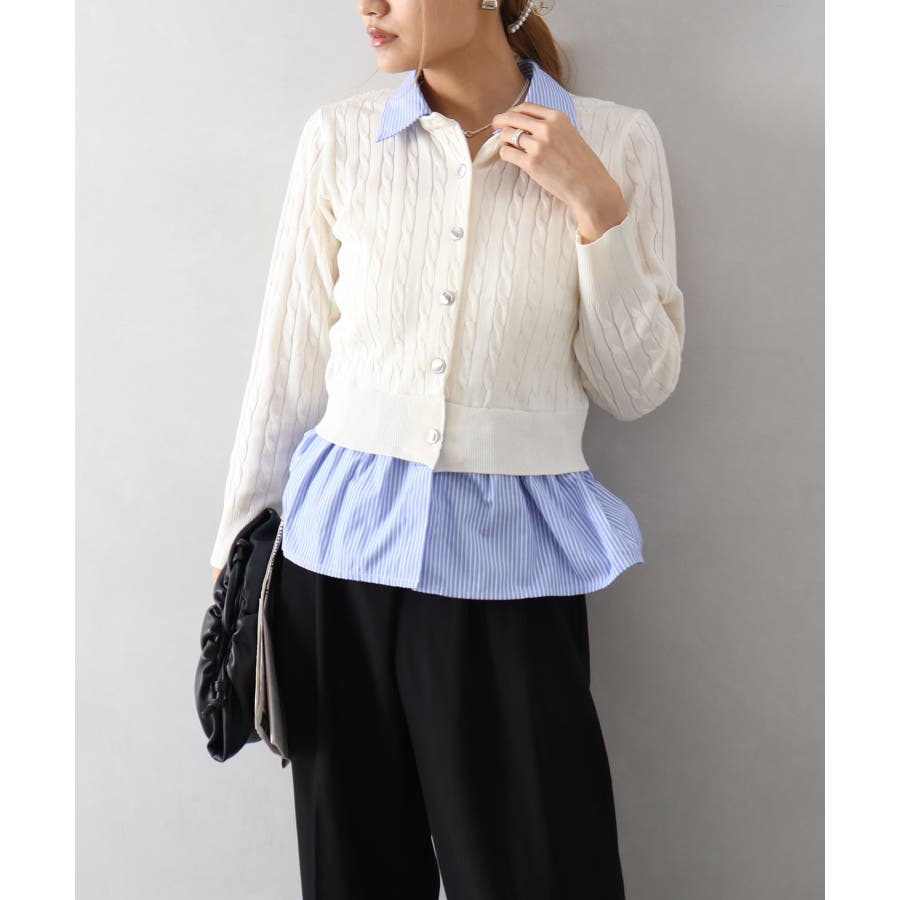 ケーブル編みニットとシャツデザインをドッキングした、1枚でレイヤードスタイルが完成するカーディガン。