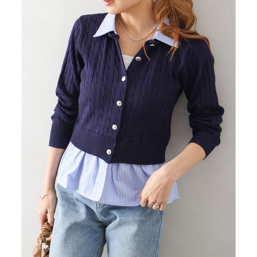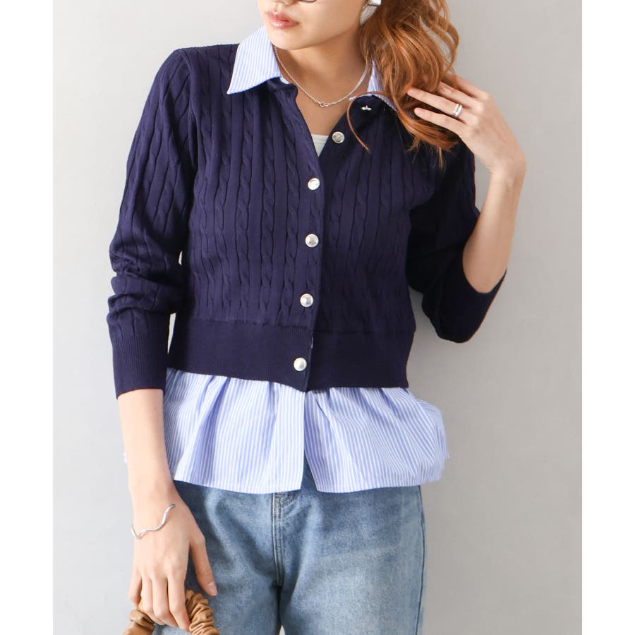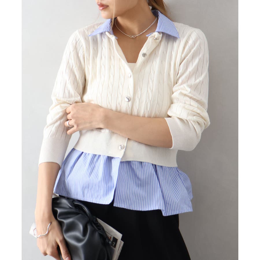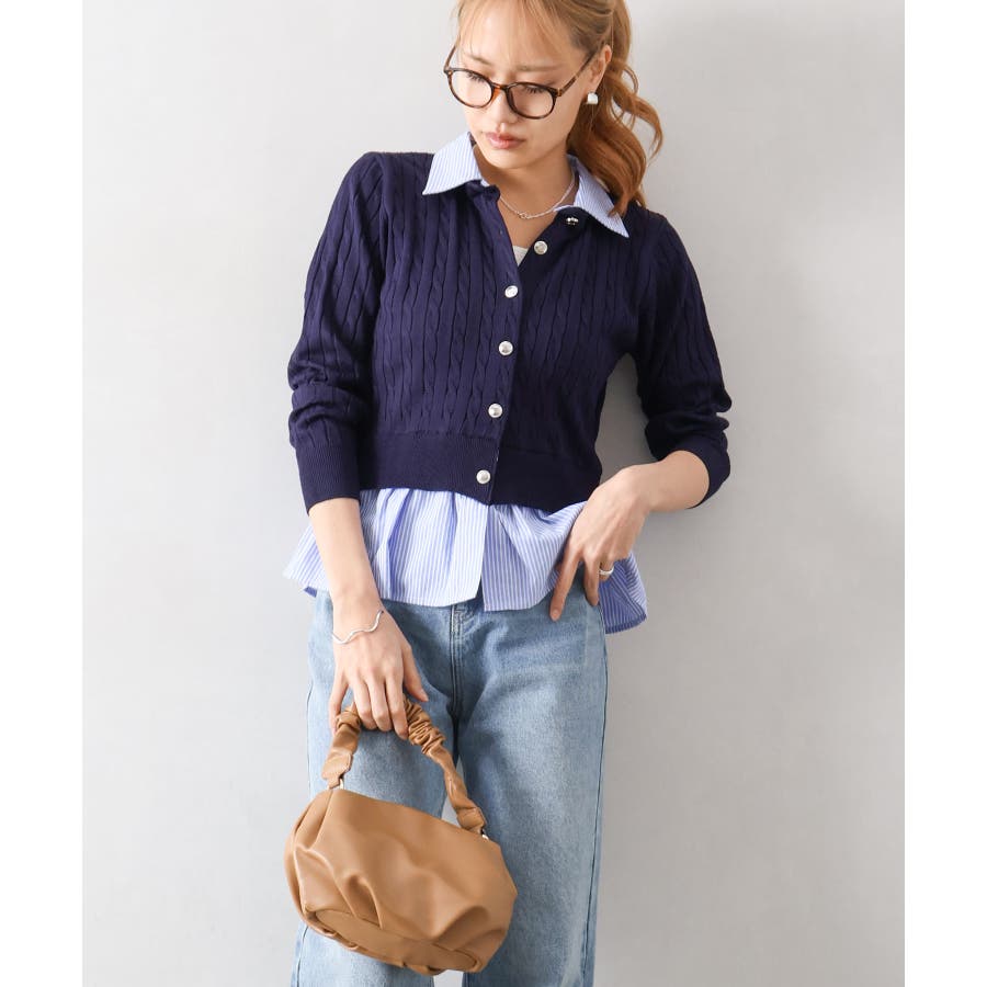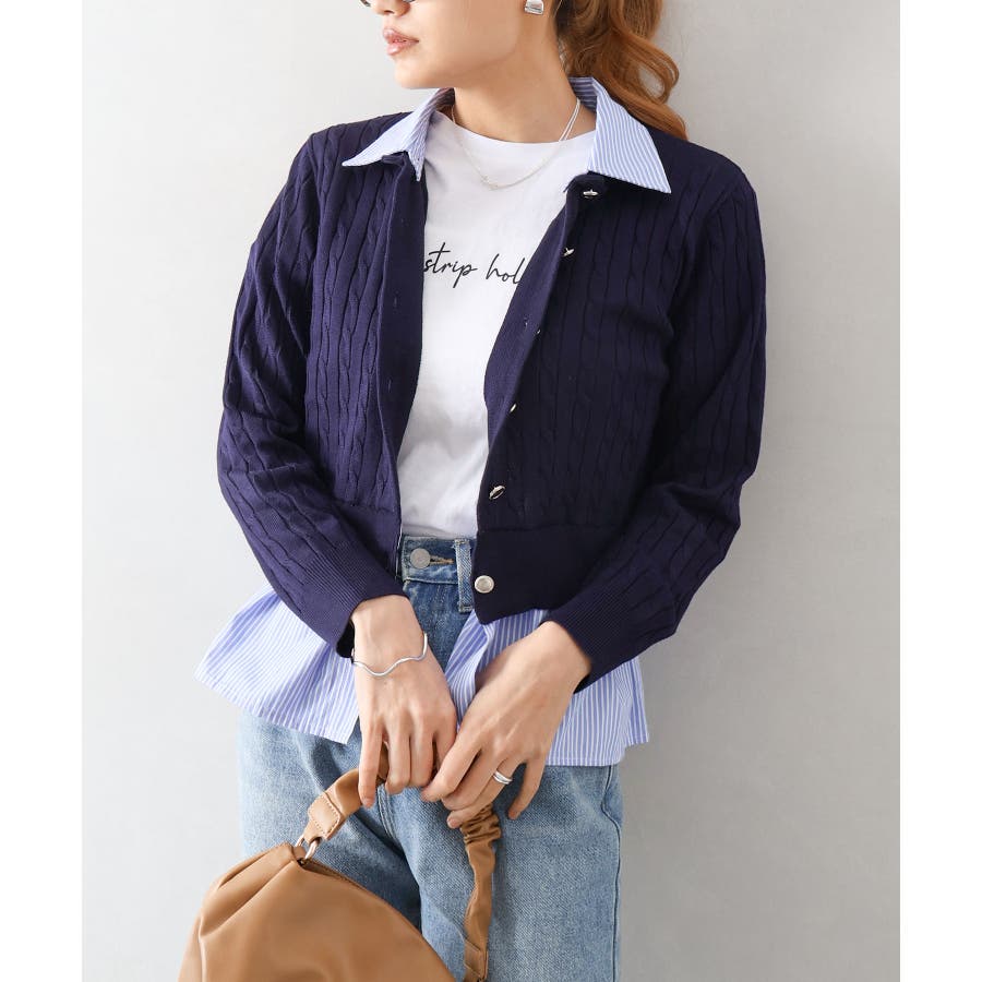 ケーブル編みニットとシャツデザインをドッキングした、1枚でレイヤードスタイルが完成するカーディガン。