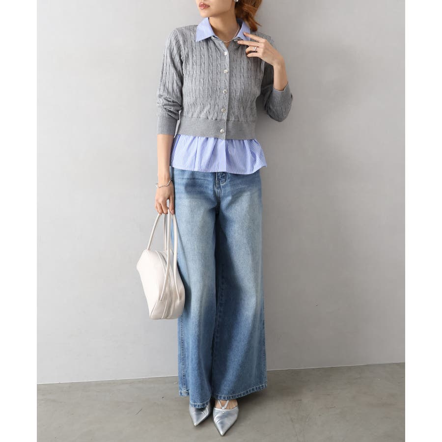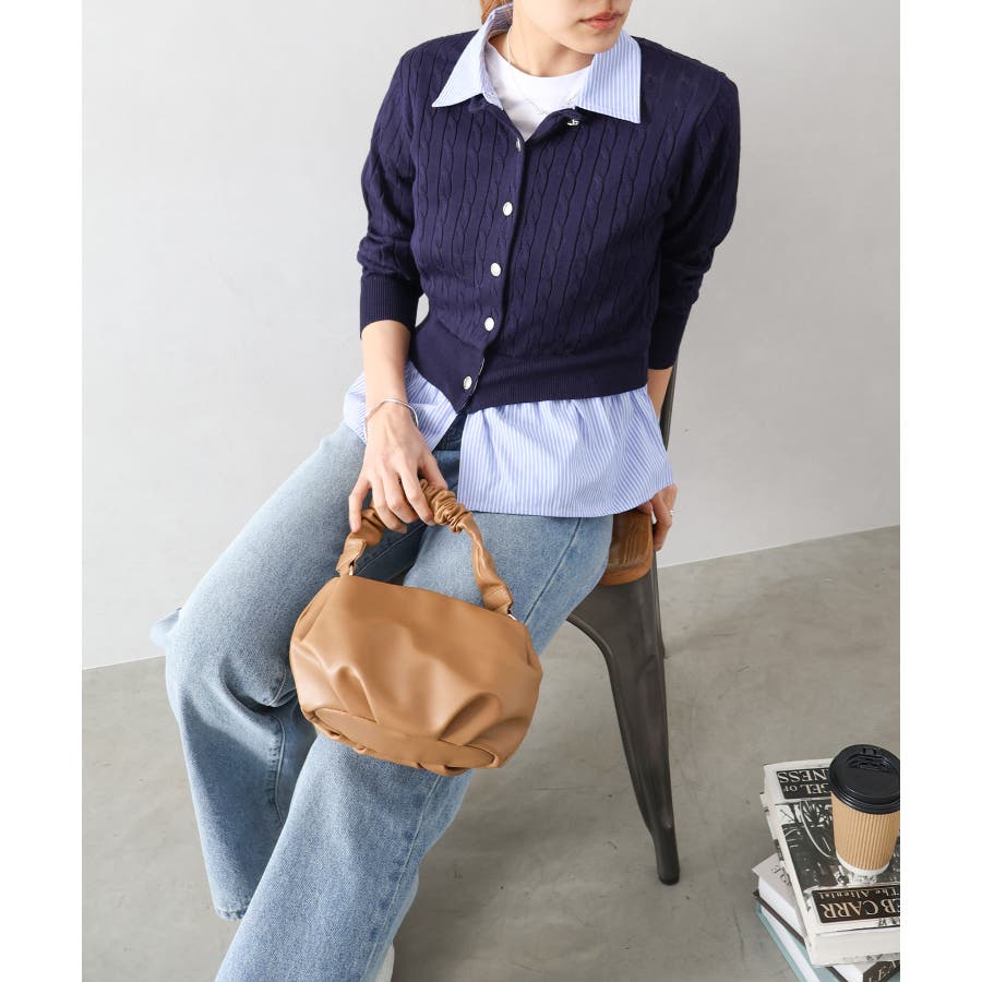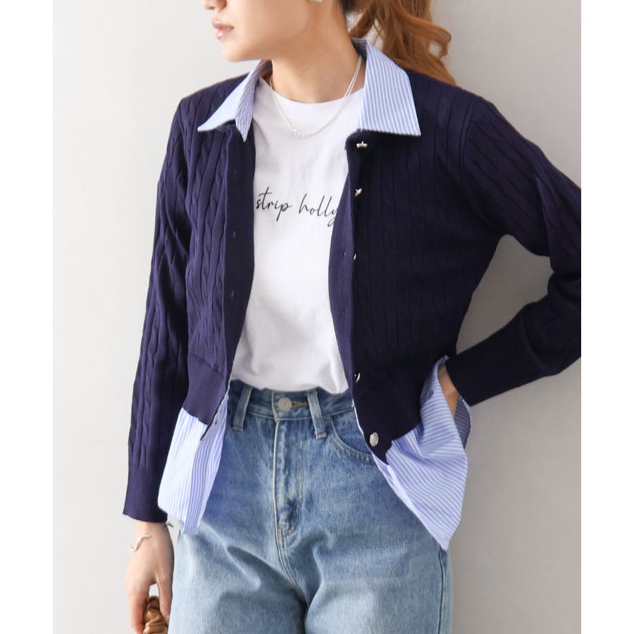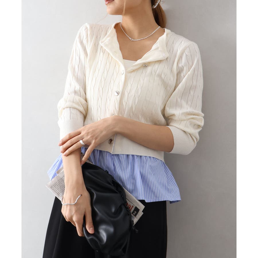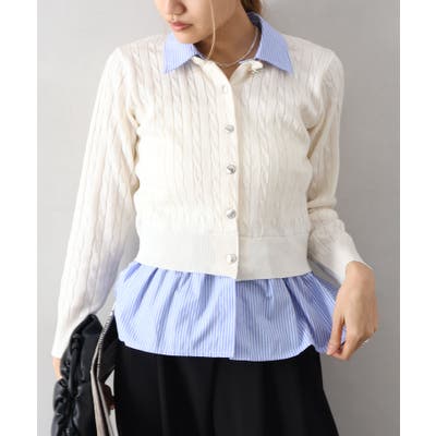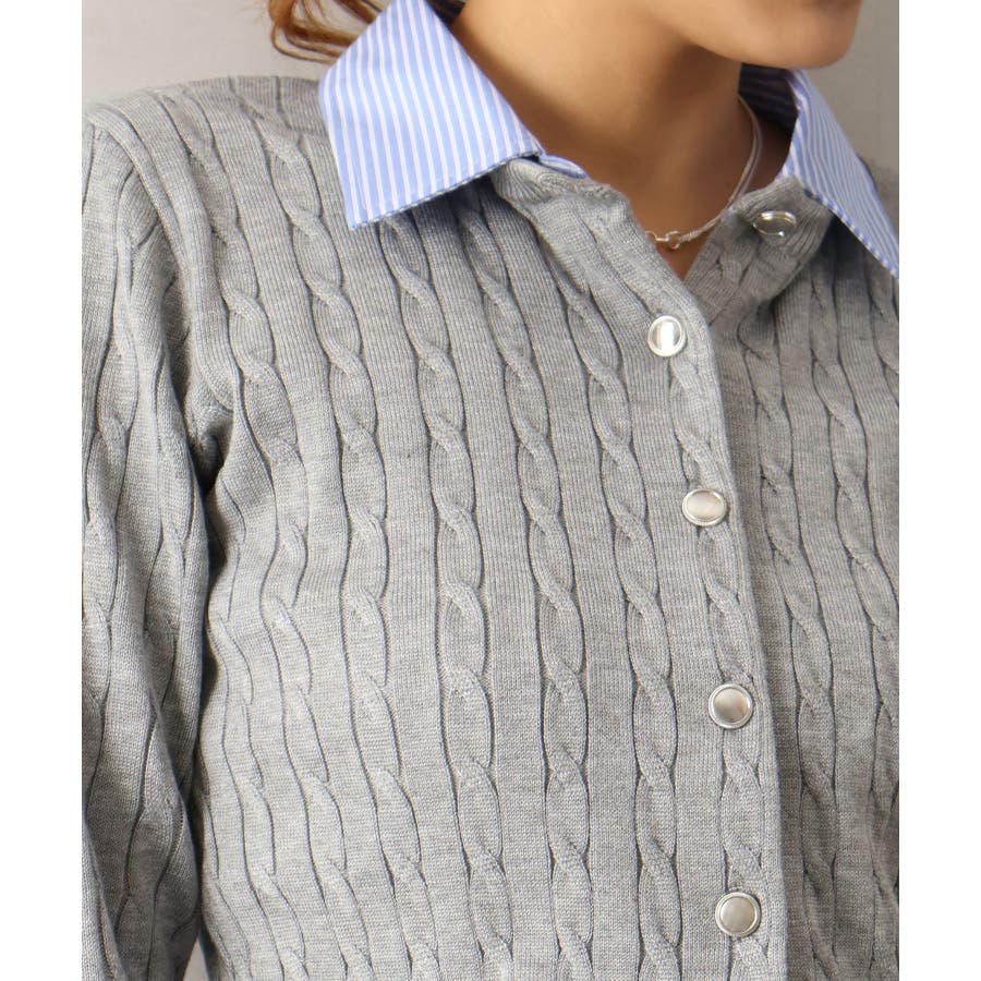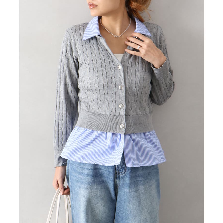 ケーブル編みニットとシャツデザインをドッキングした、1枚でレイヤードスタイルが完成するカーディガン。