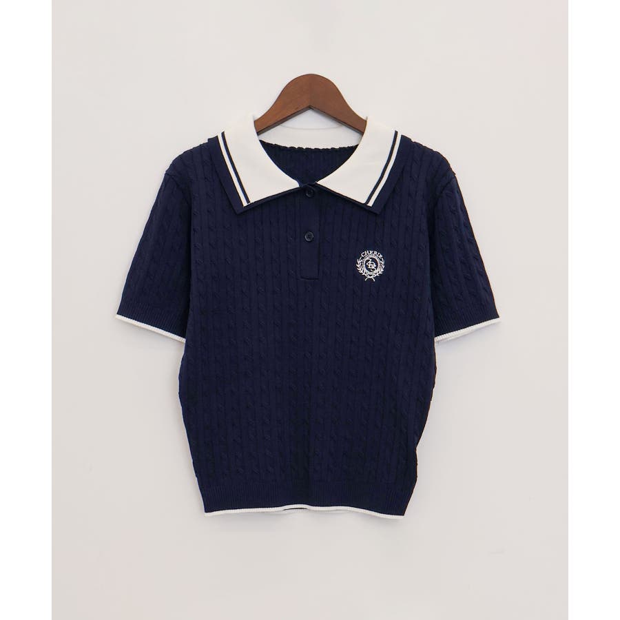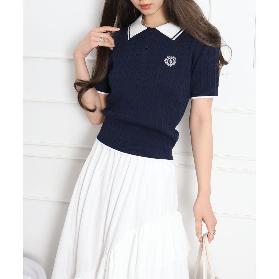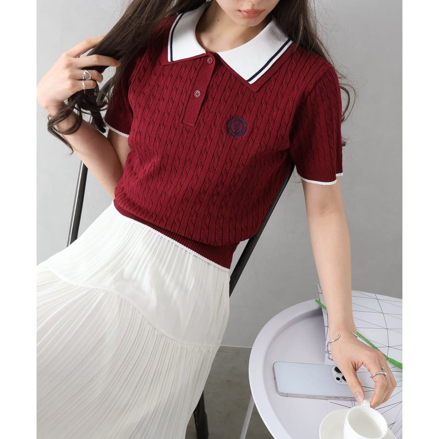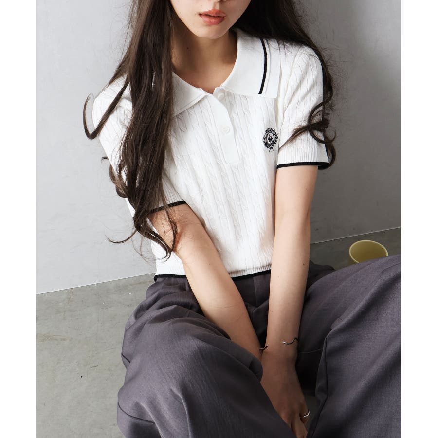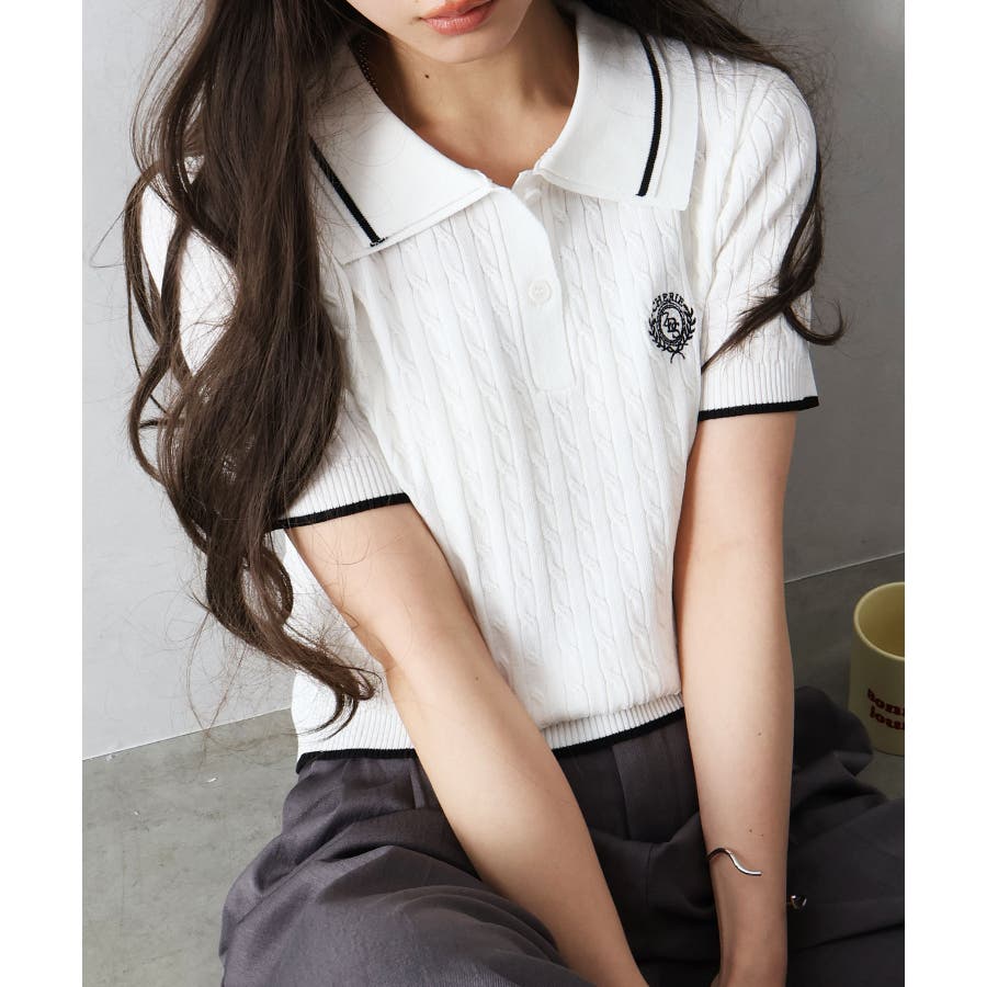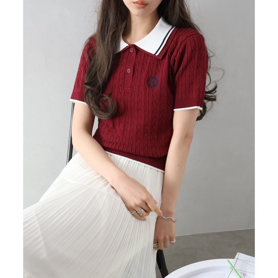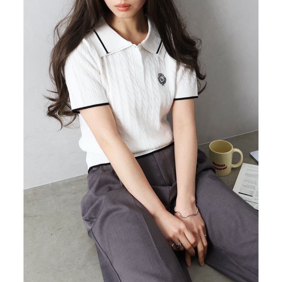 着るだけでトラッドな旬顔に。2枚衿が映える主役級ケーブルニット!立体感のあるケーブル編みと、配色ラインの効いた「2枚衿」がポイントのポロニット。胸元のエンブレム刺繍が、コーディネートに程よいトラッド感をプラスしてくれます。1枚でさらりと着ても手抜き感が出ず、顔回りを華やかに演出してくれる、この春夏持っておきたい1着です。