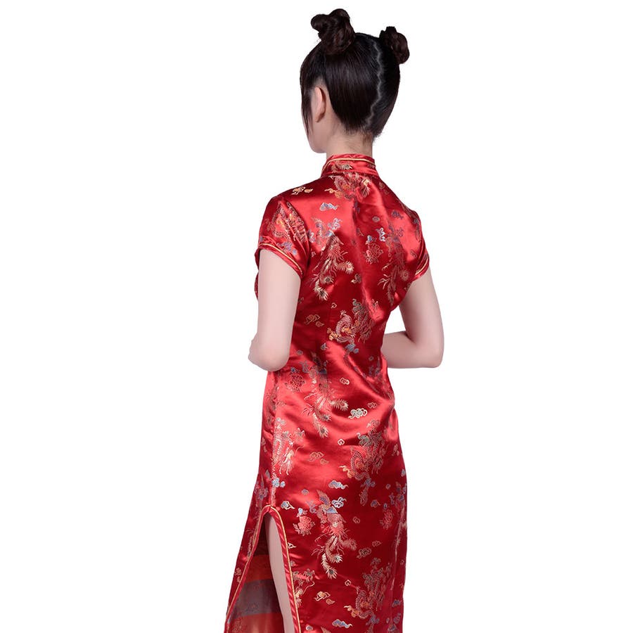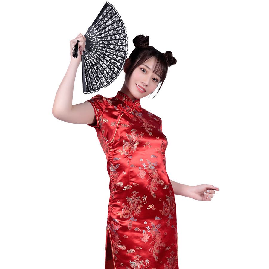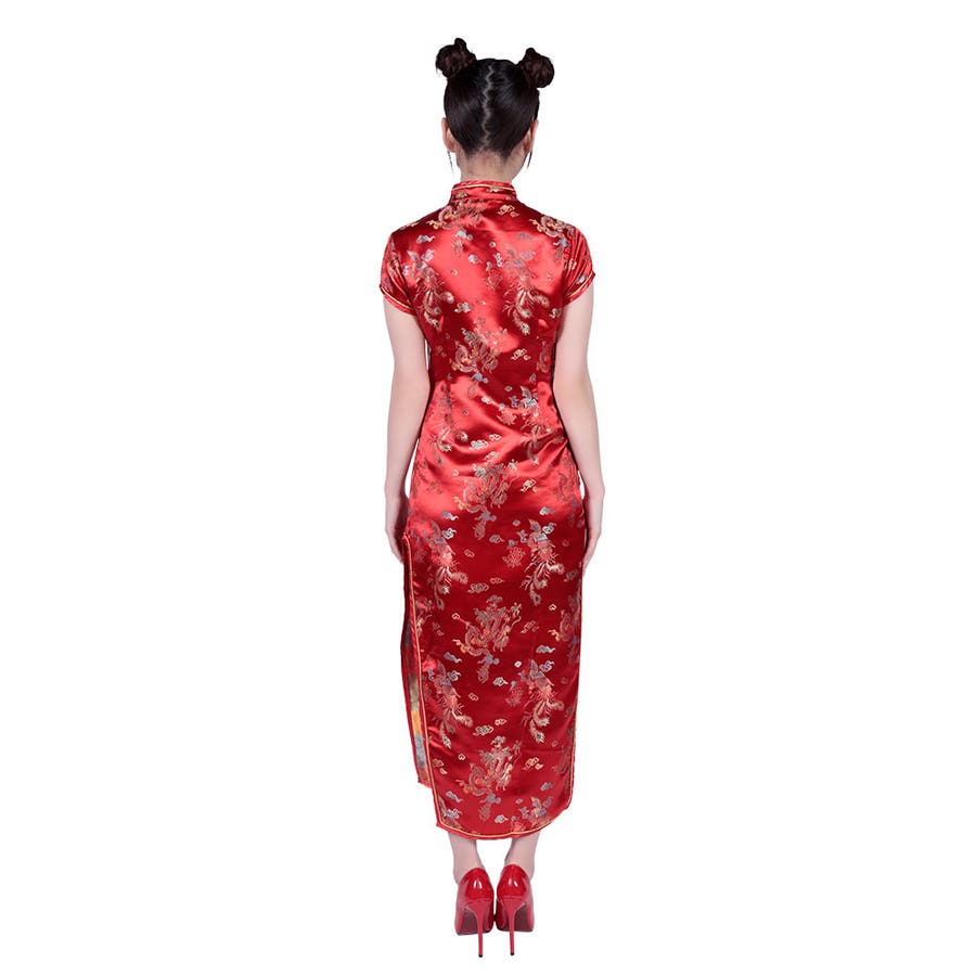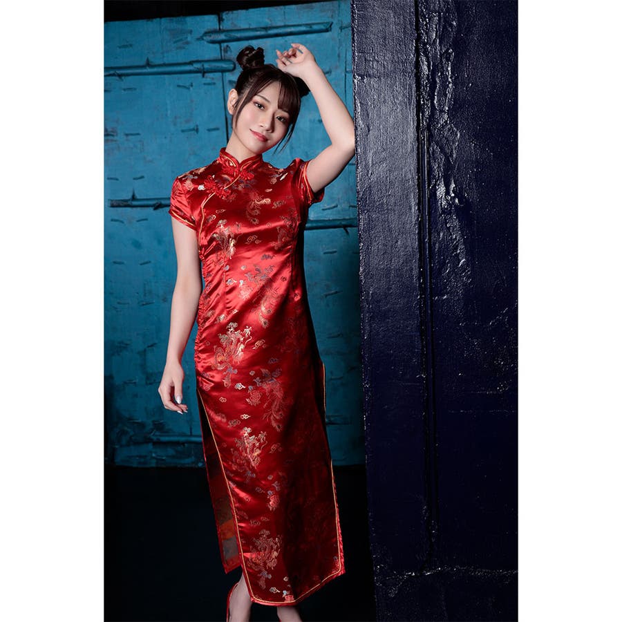 鮮やかなレッドの光沢サテン生地に、気品あふれるゴールドの龍刺繍が映えるロング丈チャイナドレス。クラシカルなスタンドカラーと、美しいボディラインを引き立てるタイトシルエットが特徴。大胆なサイドスリットで、上品さの中にもセクシーなアクセントをプラス。華やかな舞台や撮影、イベント衣装にも最適な一着です。