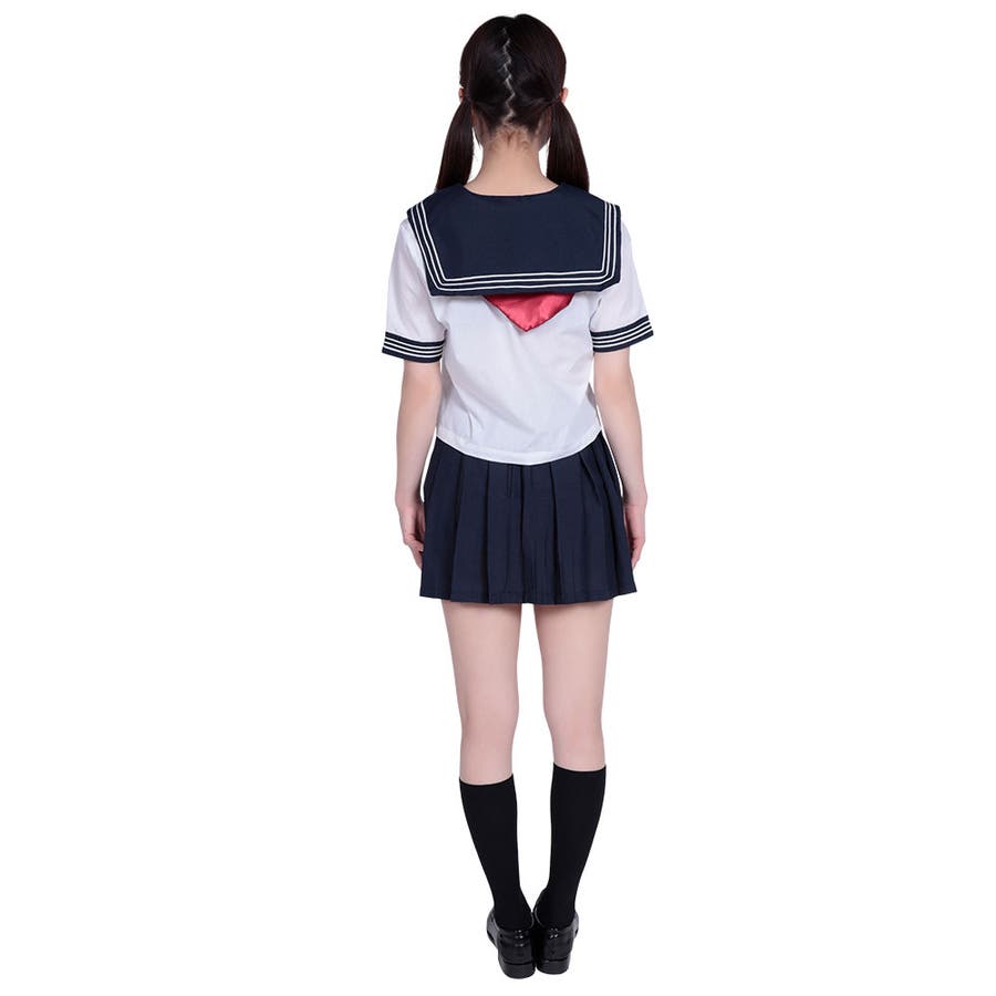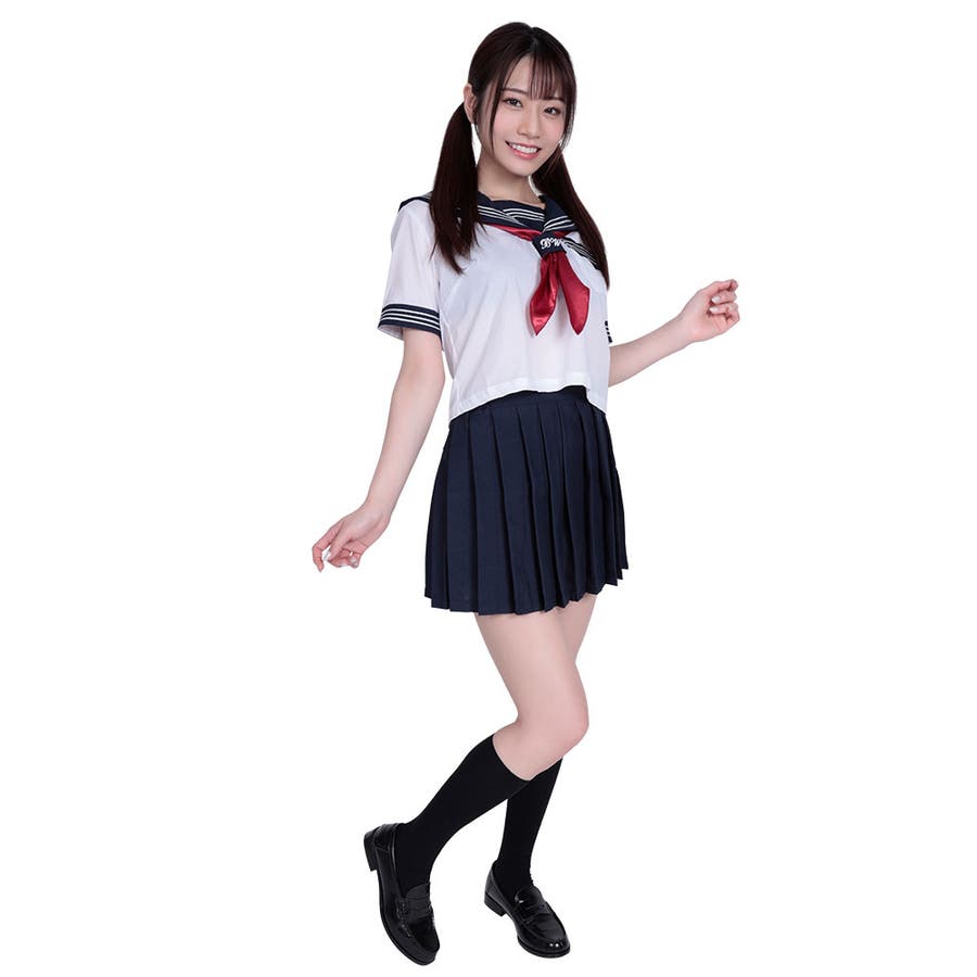 真っ赤なスカーフ付きの定番人気セーラー。スカート丈37cm、19本のプリーツ。ウエスト両サイドはゴム使用で着心地最高。セーラーカラー、胸ポケット、両袖に3mmのホワイトラインを丁寧に縫い付けました。スカーフ留にはブランド刺繍入り。スカーフの長さ124cm。