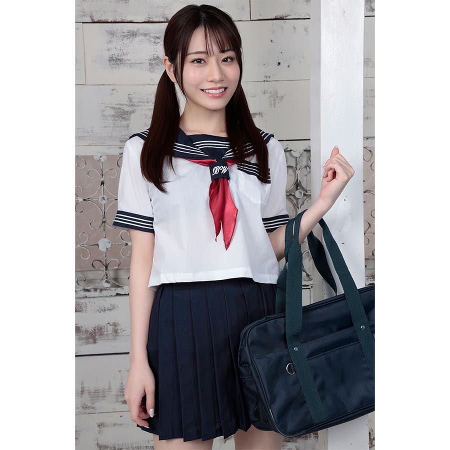 真っ赤なスカーフ付きの定番人気セーラー。スカート丈37cm、19本のプリーツ。ウエスト両サイドはゴム使用で着心地最高。セーラーカラー、胸ポケット、両袖に3mmのホワイトラインを丁寧に縫い付けました。スカーフ留にはブランド刺繍入り。スカーフの長さ124cm。