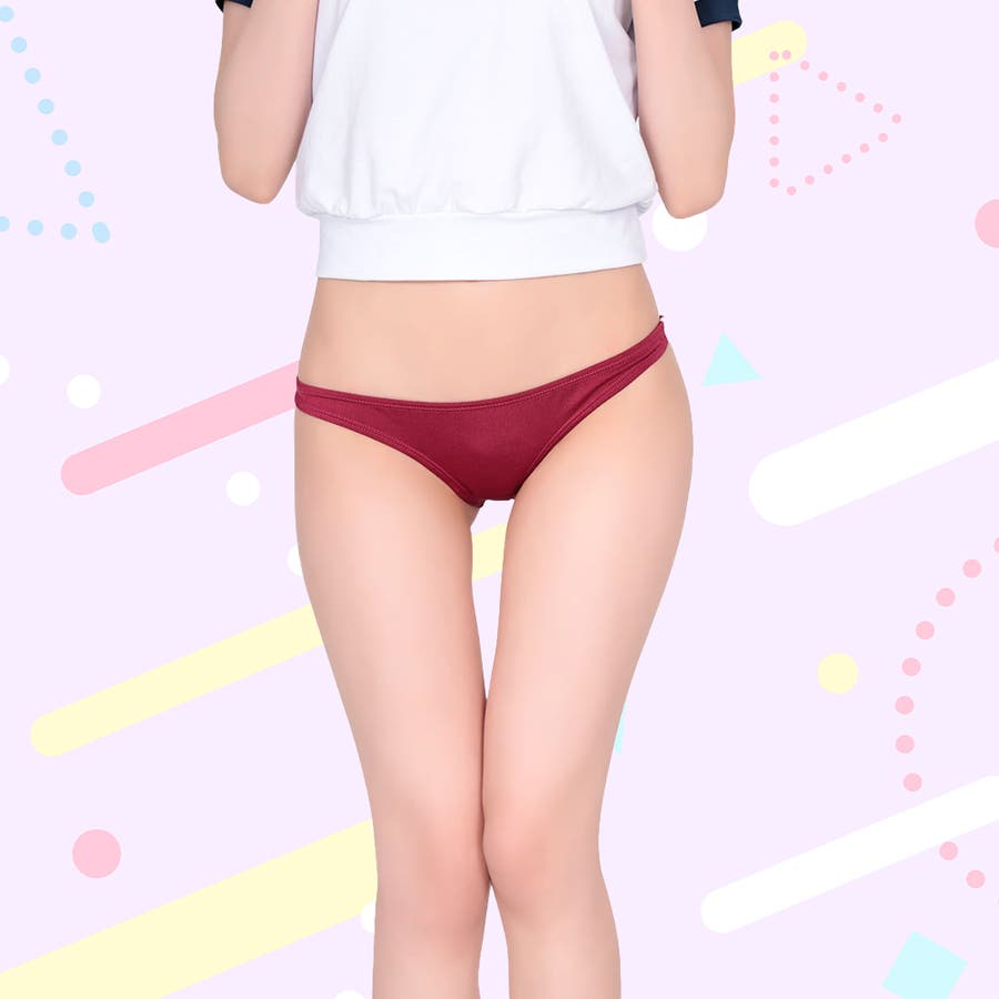 お尻が半分ぐらい出てしまいそうな浅いえんじのブルマ。さらりとした柔らかな肌触りが大人気!