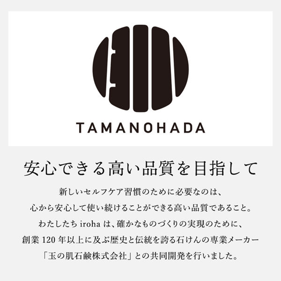 わたしたちirohaは、確かなものづくりの実現のために、創業120年以上に及ぶ歴史と伝統を誇る石けんの専業メーカー「玉の肌石鹸株式会社」との共同開発を行いました。