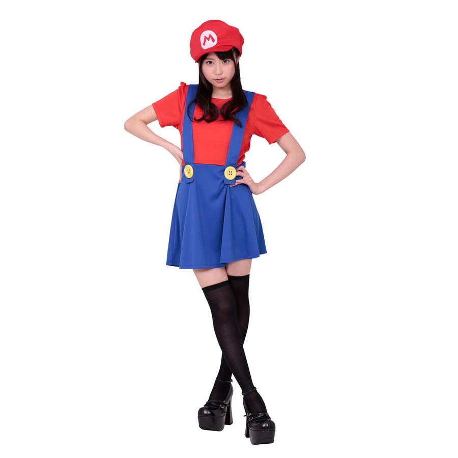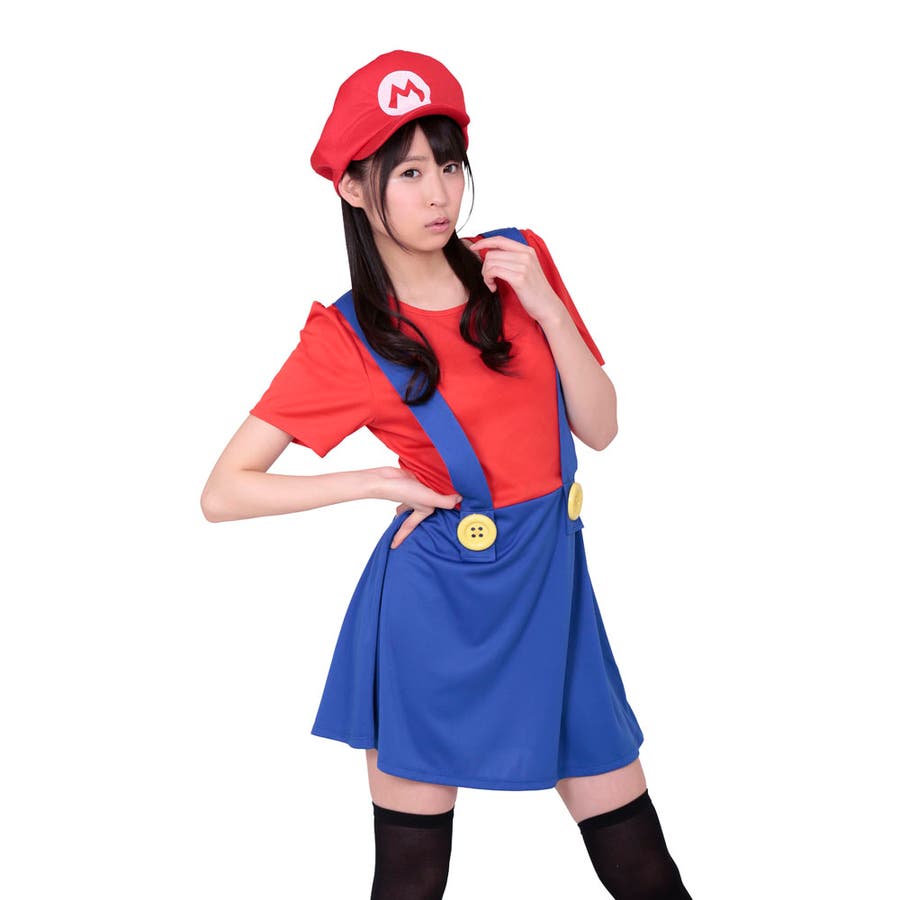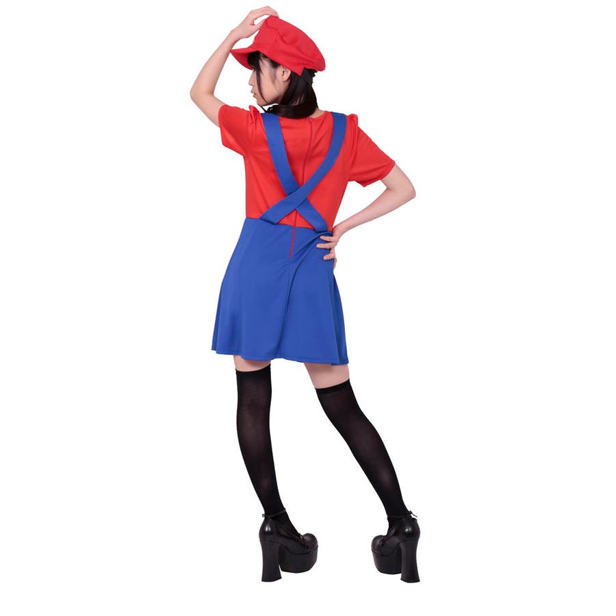 鮮やかなレッド×ブルーの王道カラーに、大きめボタンと吊りスカートが可愛さを引き立てるデザイン。オーバーオール風ジャンパースカートは、背中を面ファスナーで留める仕様になっています。胸元はシンプルながらも、程よいフィット感で女性らしいラインを演出。あどけなさとセクシーさを絶妙にミックスした、イベントやパーティー、SNS映えにぴったりな一着です。