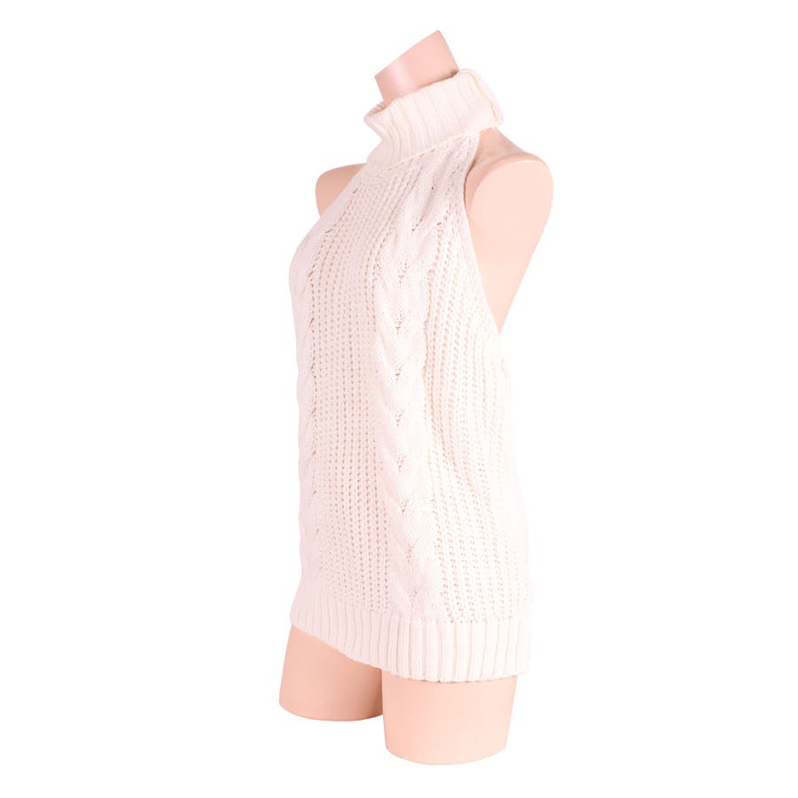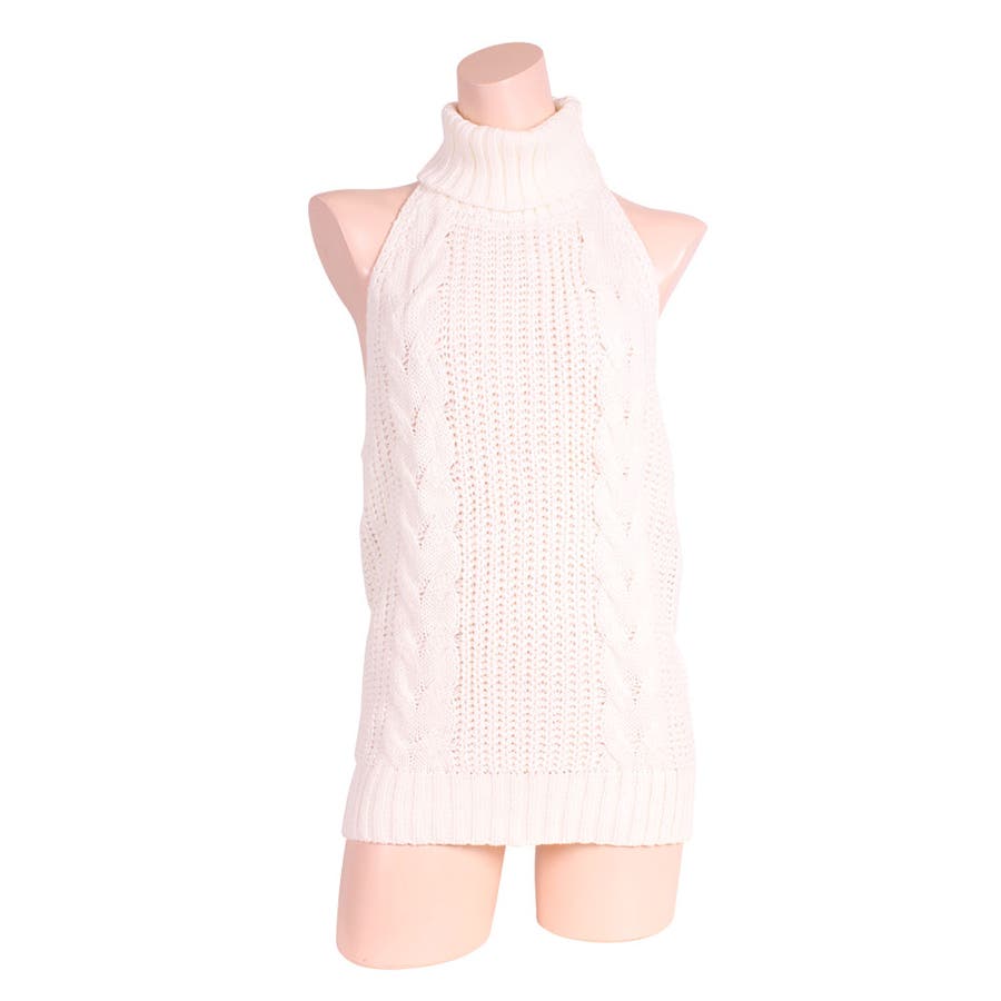 裸エプロンのように露出が多くて、それでいて女性が思わず着たくなるようなエロ可愛いセーター。背中が大きく開いているノースリーブ、タートルネックデザイン。清楚なホワイト。