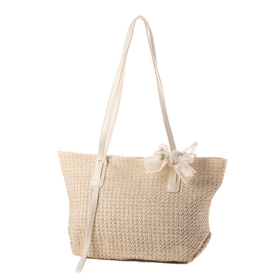 麦わら風素材に刺繍のリボンがフェミニンな印象のバッグ。