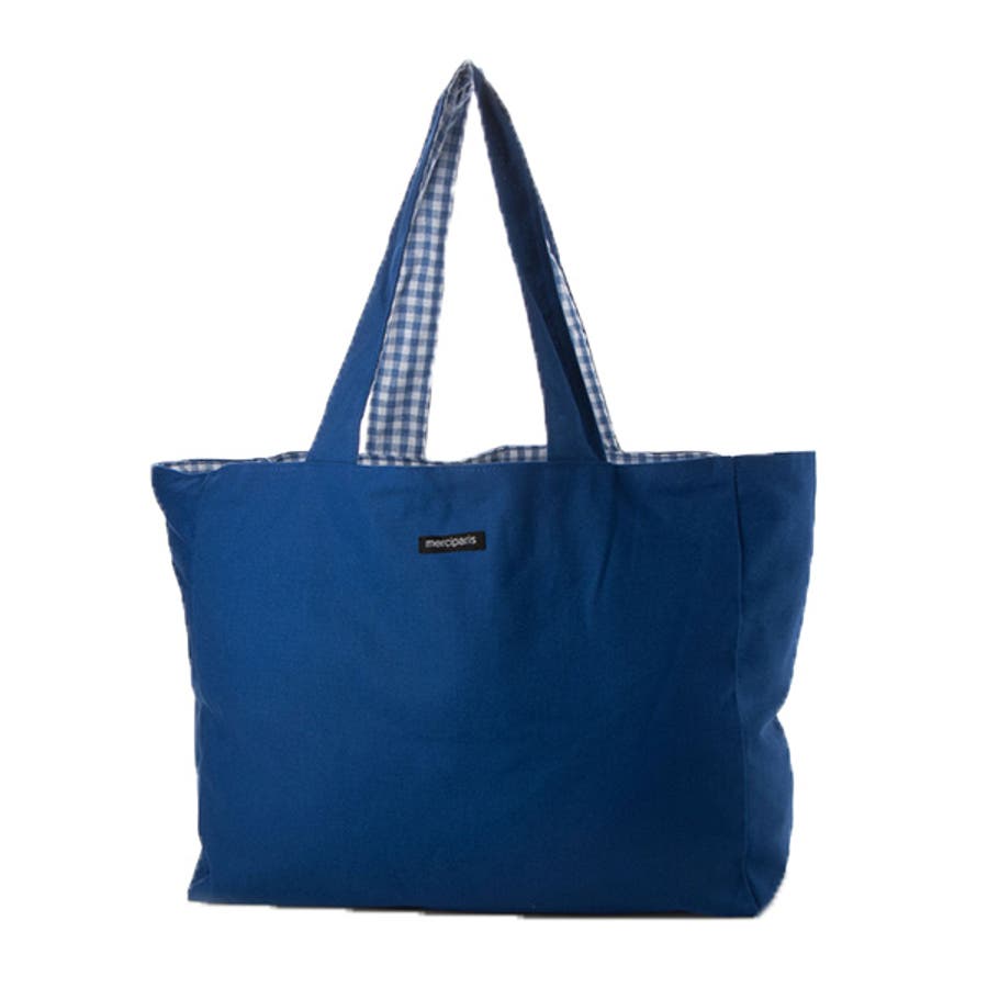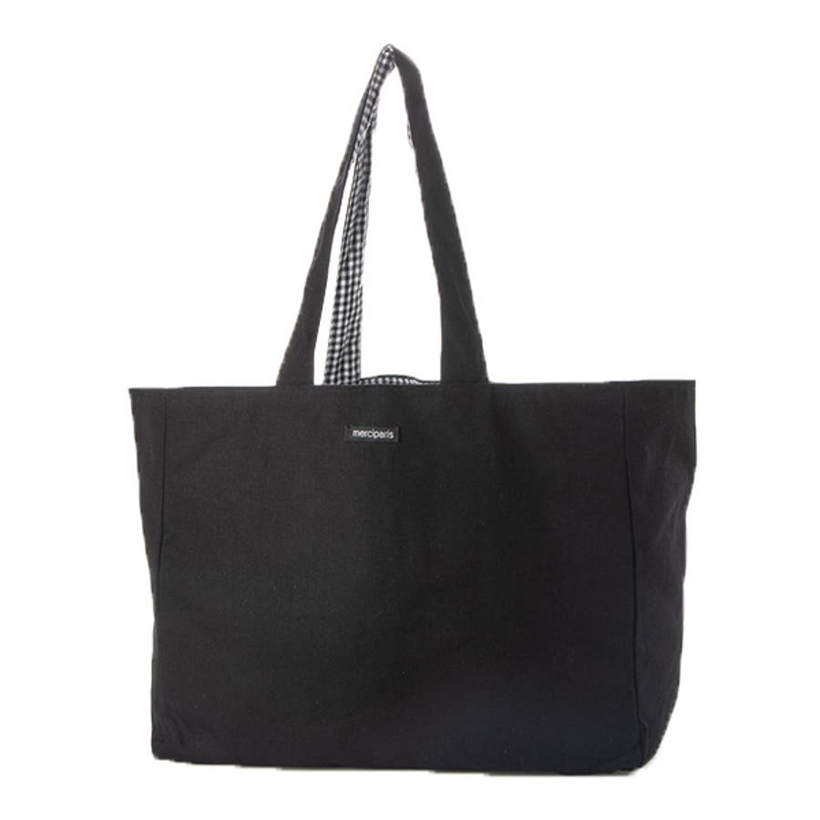 ギンガムチェック×無地のリバーシブルトートバッグ。
