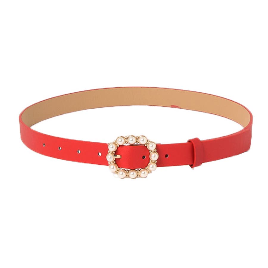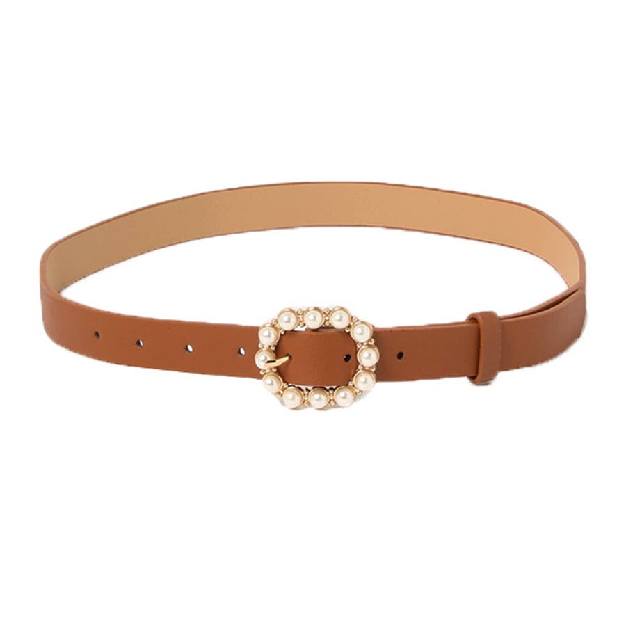 パールの丸いバックルがエレガントな印象のレザータッチベルト。