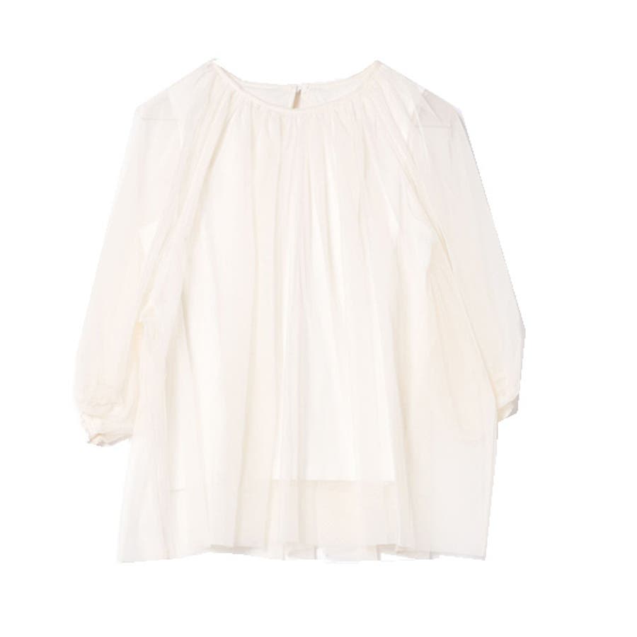 チュールの素材感が魅力のインナー付きボリュームスリーブギャザーブラウス。