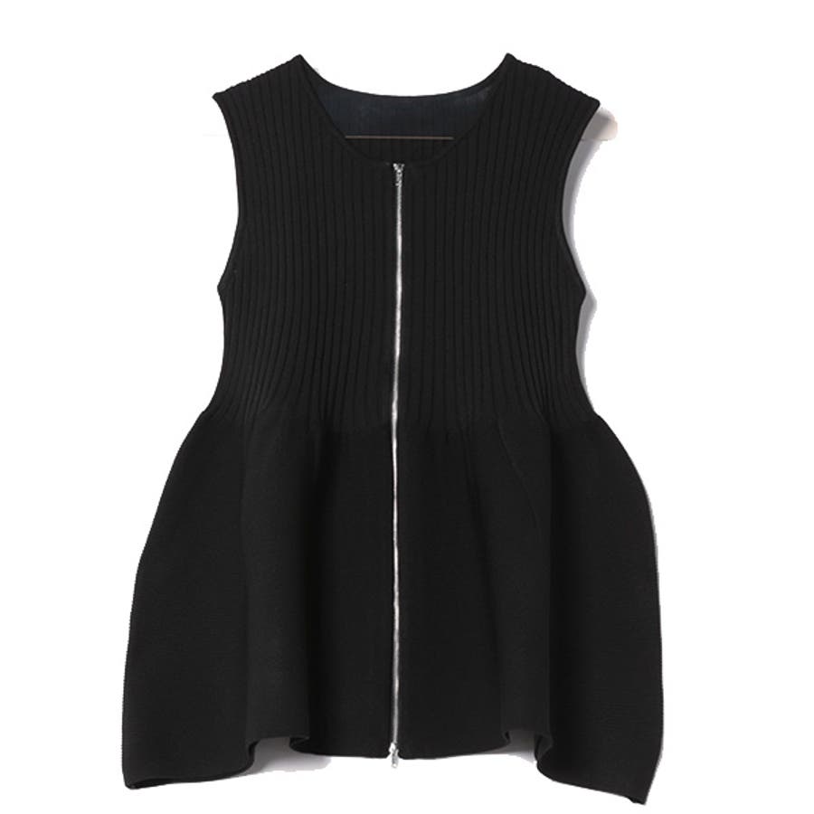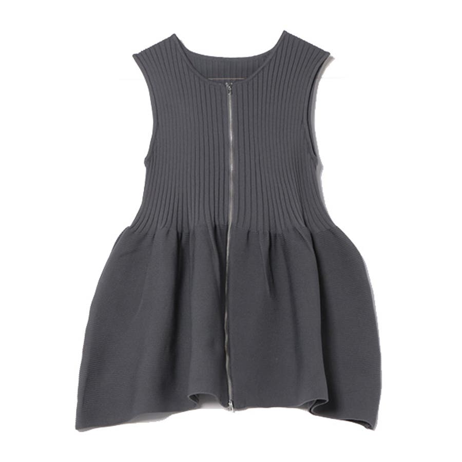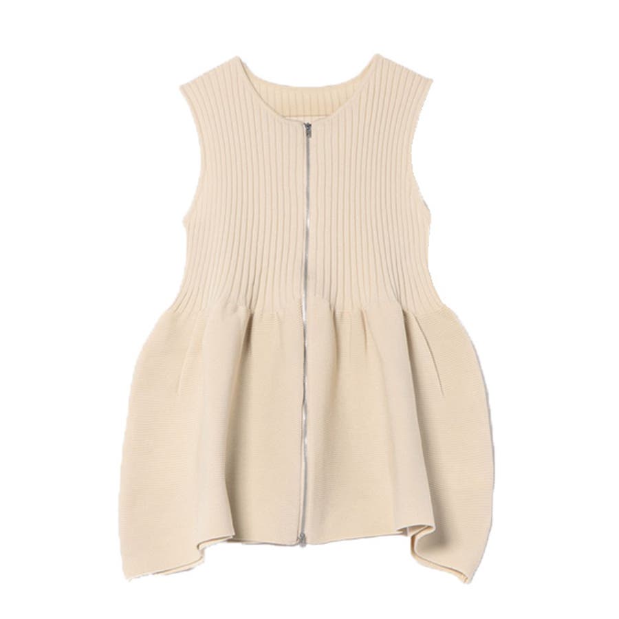ポリウーリーの素材感が魅力のフロントジップペプラムニットベスト。