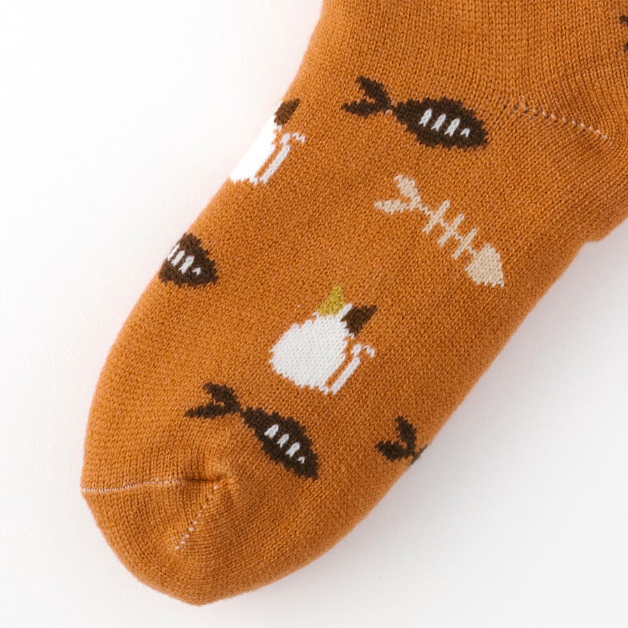 ドットタッチで描かれた猫と魚の柄がとってもキュートなルームソックス。