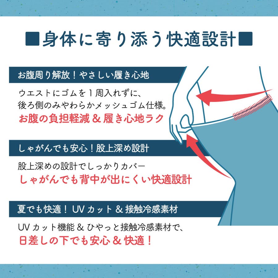 ストレッチ生地を使用しているのでタイトシルエットのレギンスですが履き心地は快適。ウエストは背中側のみメッシュゴム仕様なのでお腹側はゆったりしつつも、しっかりずり落ちない快適設計です。