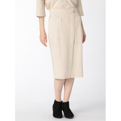 コーディネートを楽に決められる。クローゼットにあると重宝するセットアップ企画です。飾りホックでラップ風に仕上げた、膝下丈のタイトスカートです。フロントにあしらった、大き目のポケットがポイント。ウエスト両サイドはゴム仕様で、穿き心地も快適です。