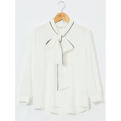 お顔まわりを華やかに演出してくれる、前開きの長袖ブラウスです。配色のパイピングをあしらったボウタイデザインがポイント。キチンと感のあるクリーンなルックスなのでオンオフ兼用で大活躍してくれます。