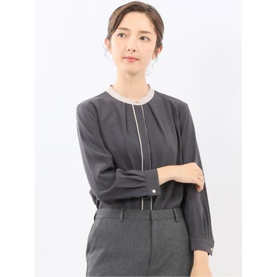 お顔まわりを華やかに演出してくれる、前開き仕様の長袖ブラウスです。配色のバンドカラー、前立のパイピング、ボタンの隠れる比翼仕様、前後に入れたタック、袖口のカフスがポイント。キチンと感のあるクリーンなルックスなのでオンオフ兼用で大活躍してくれます。